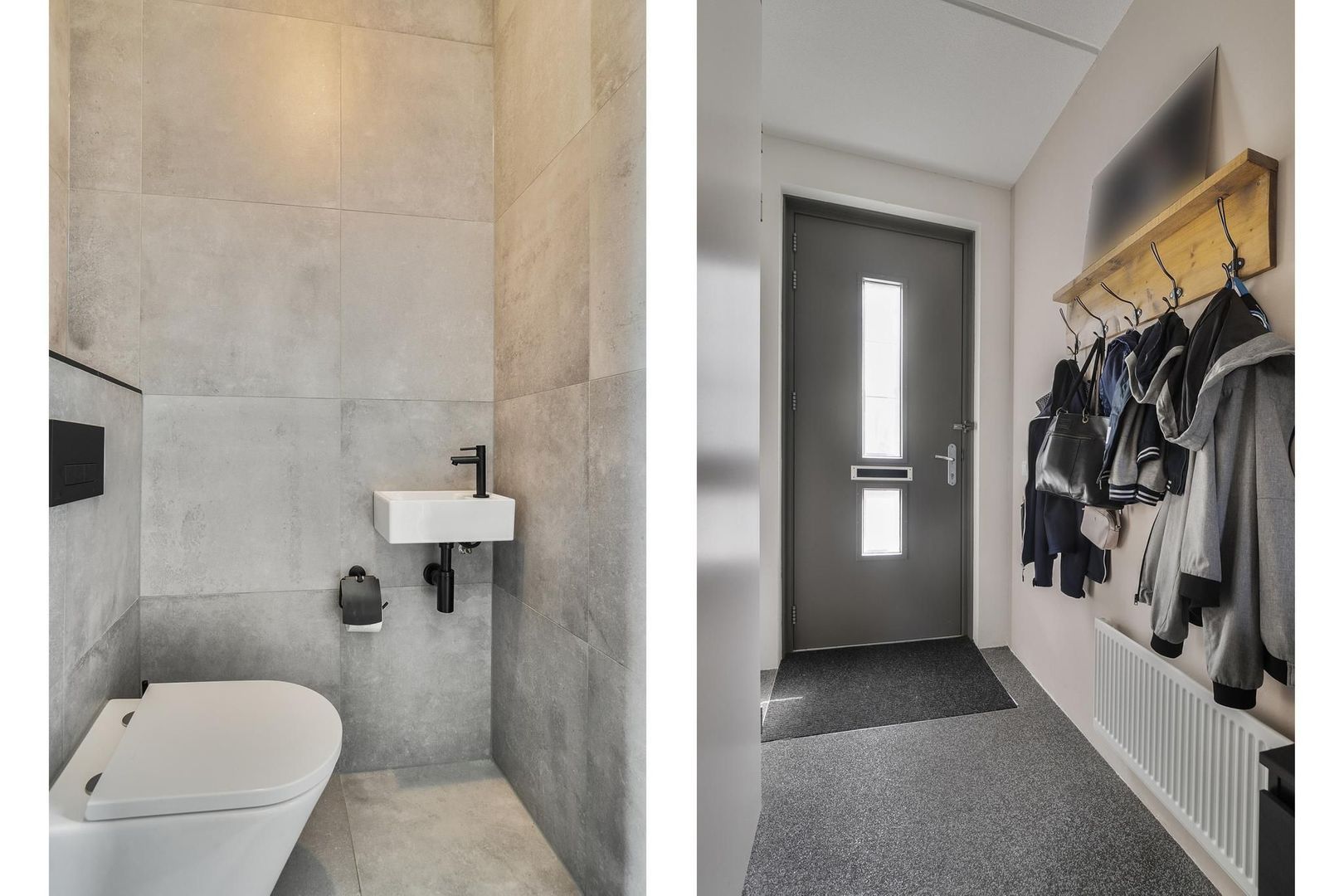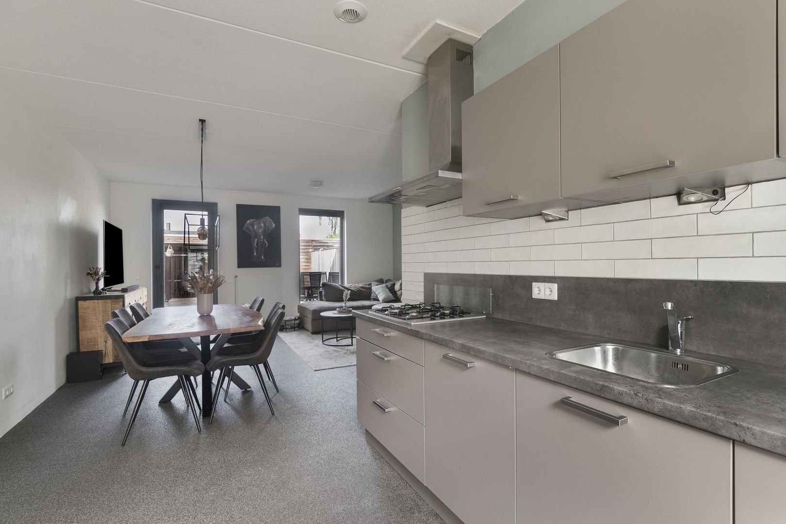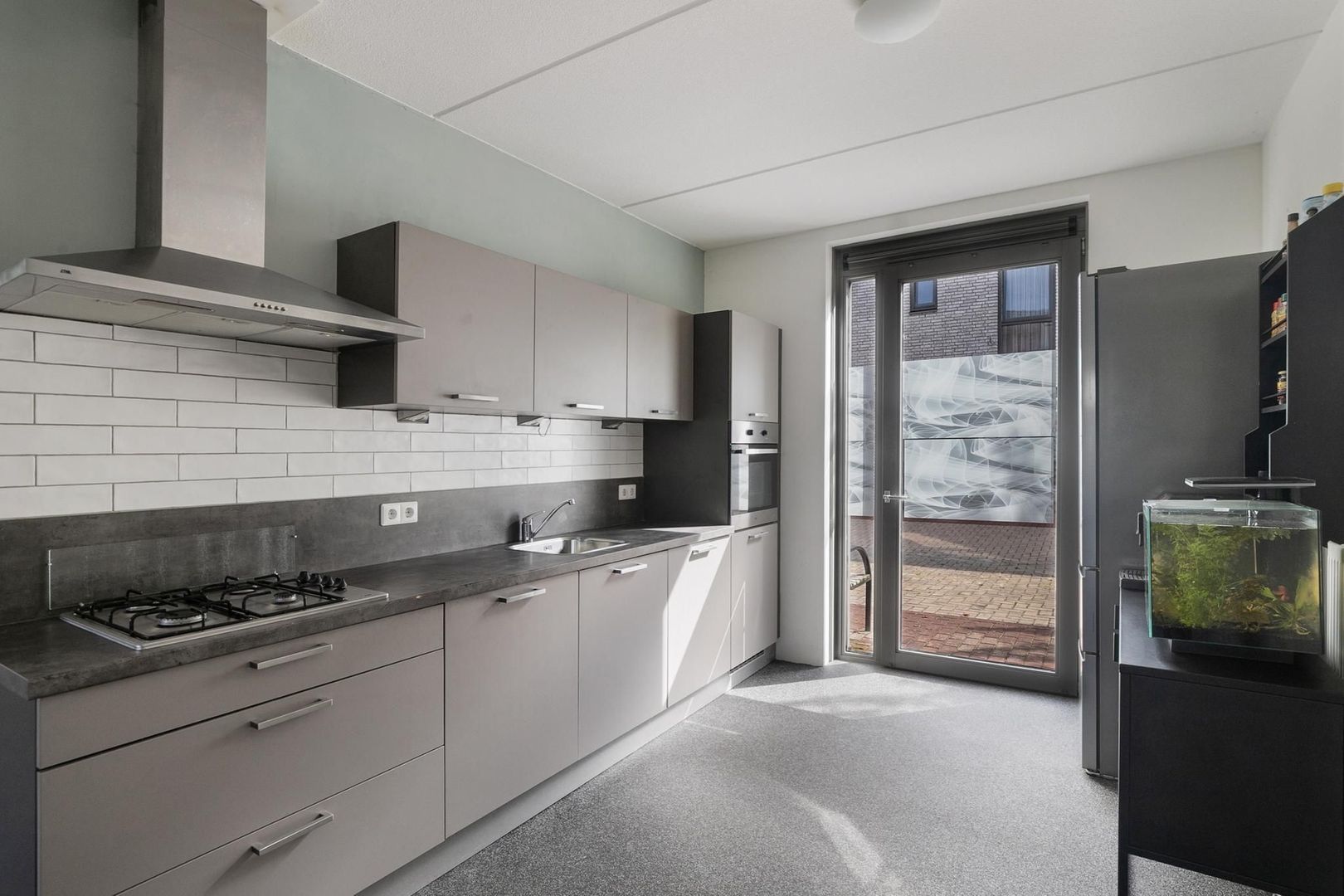 hal/entree met trapopgang, garderobedeel, meterkast met waterontharder en moderne toiletruimte (2022) voorzien van wandcloset en fontein; tuingerichte woonkamer met deur naar terras en elektrisch en op afstandbedienbaar rolluik; open keuken met draai-/ kiepdeur naar voorzijde en keukenblok voorzien van inbouwapparatuur en vaste kastruimte;