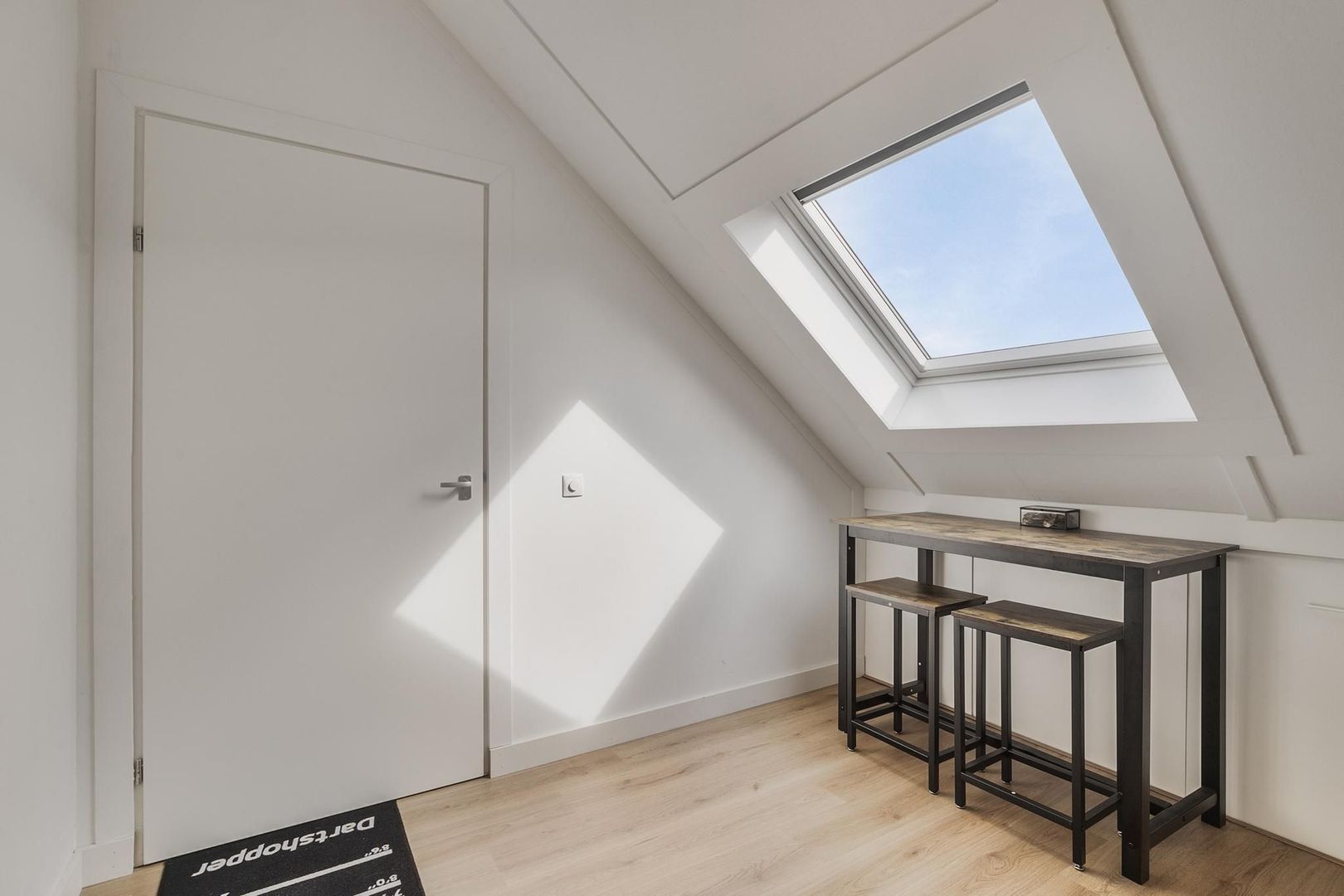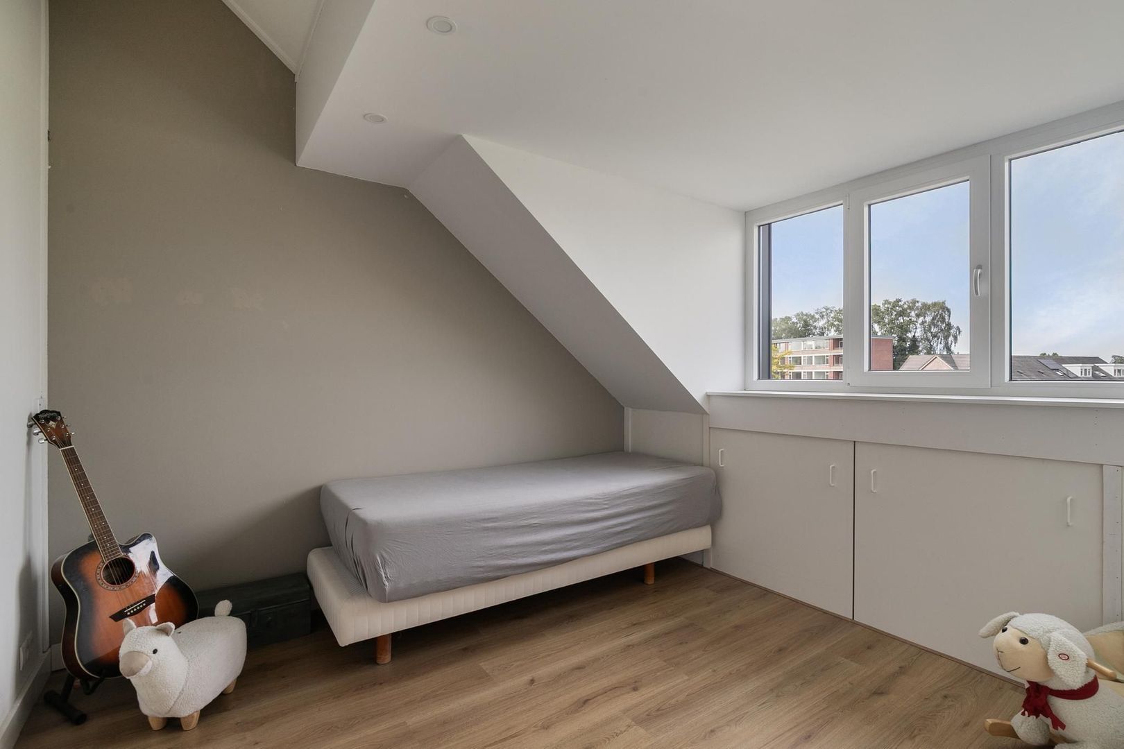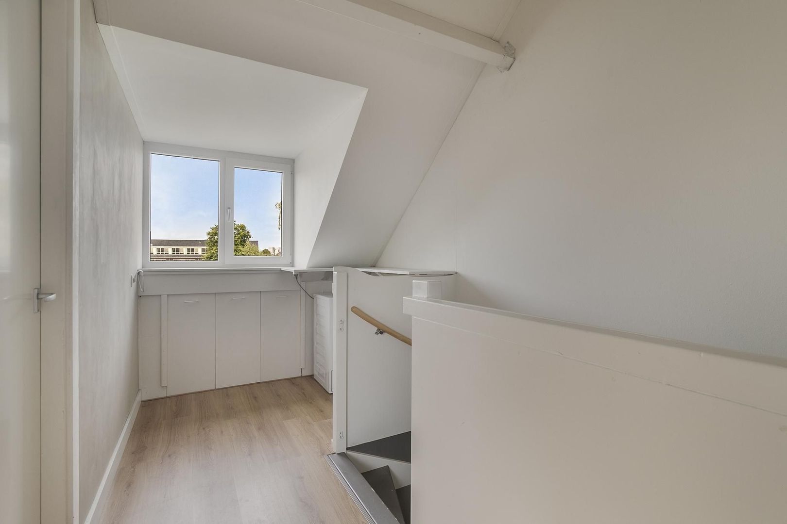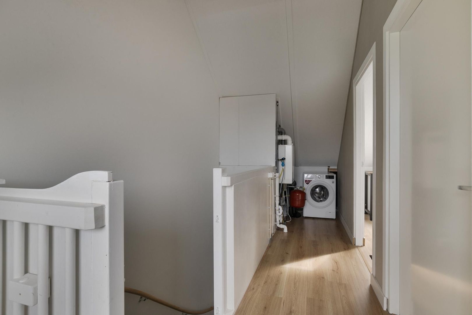 overloop met bergruimte, wasmachine- en drogeropstelling en c.v.-installatie (Intergas, 2013) en gedeeltelijk vergroot met dakkapel; vierde slaapkamer met dakkapel en bergruimte achter schot; vijfde slaapkamer met bergruimte achter schot en groot kunststof Velux-dakraam.