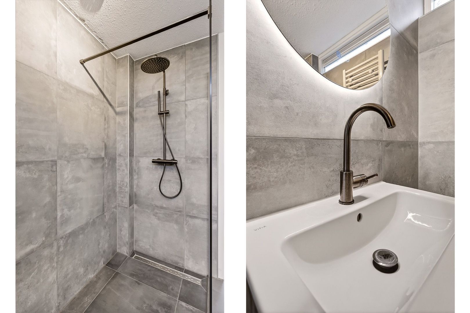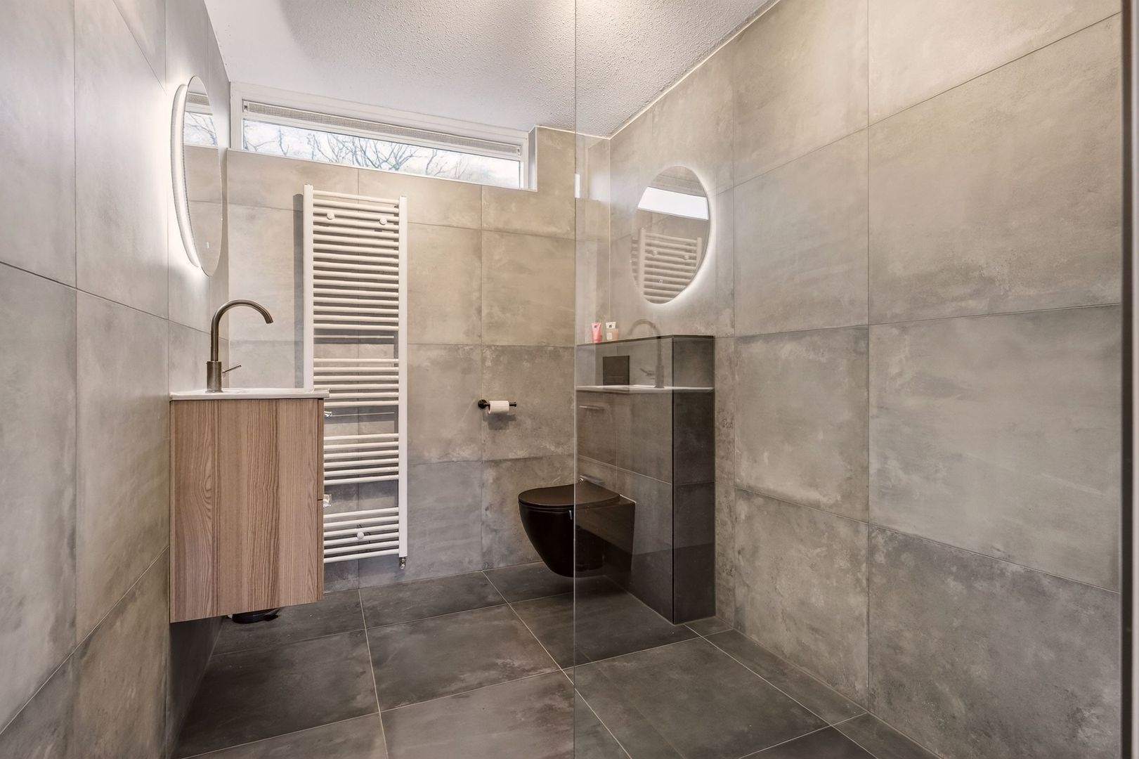 De moderne badkamer is in 2024 vernieuwd en stijlvol uitgevoerd. De ruimte is voorzien van een hangtoilet, een wastafelmeubel en een designradiator. De inloopdouche met regendouche en draingoot zorgt voor een luxe en comfortabele douchebeleving. Dankzij het ventilatierooster is er gezorgd voor een prettig en gezond binnenklimaat.
