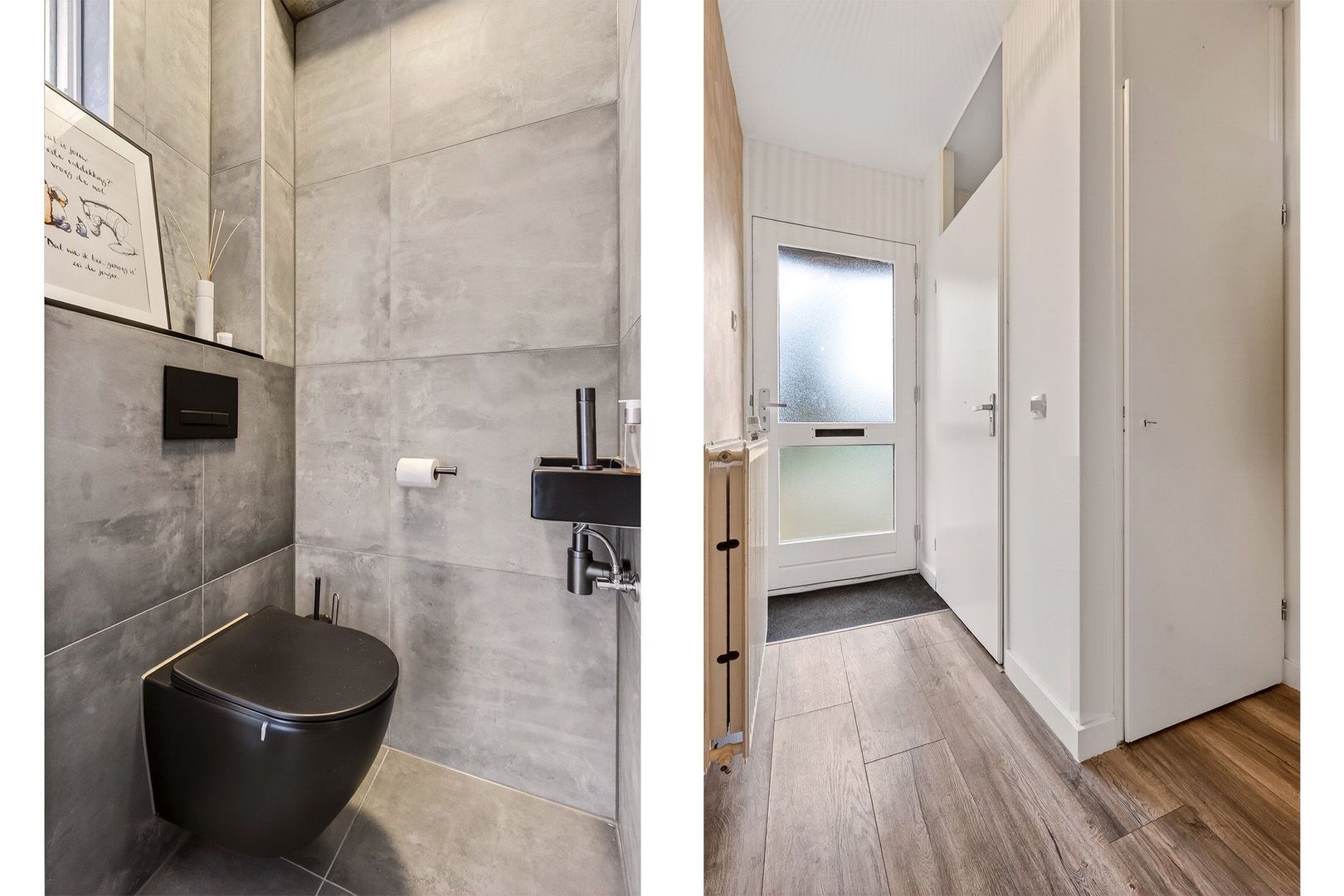 De hal biedt toegang tot alle belangrijke vertrekken op de begane grond en beschikt over de trapopgang naar de eerste verdieping. Daarnaast is er ruimte voor een garderobe en bevinden zich hier de meterkast en het kruipluik. Het moderne hangtoilet is strak afgewerkt en voorzien van een nis en fontein, wat bijdraagt aan de nette en eigentijdse uitstraling van de woning.