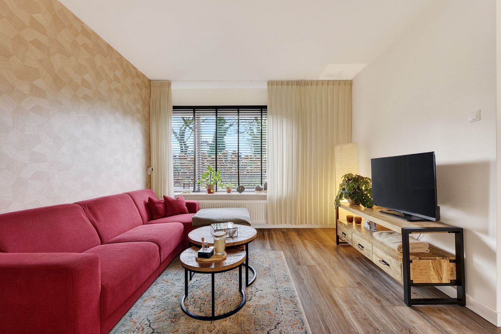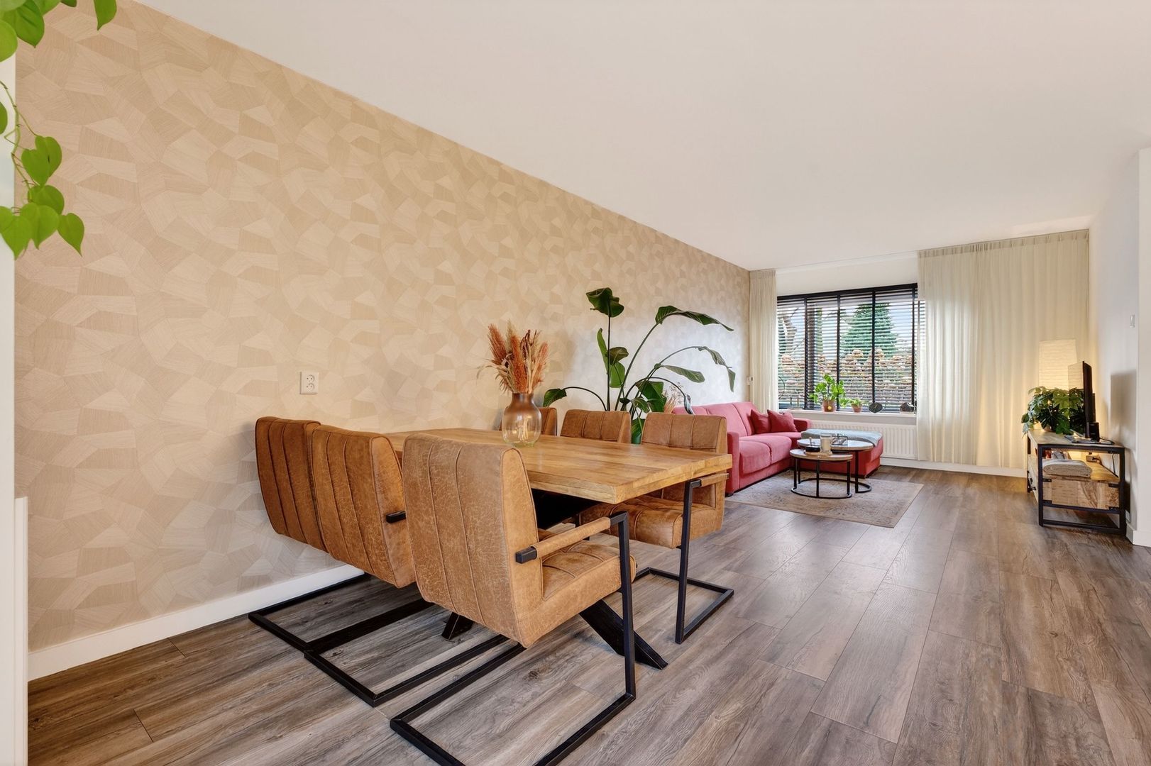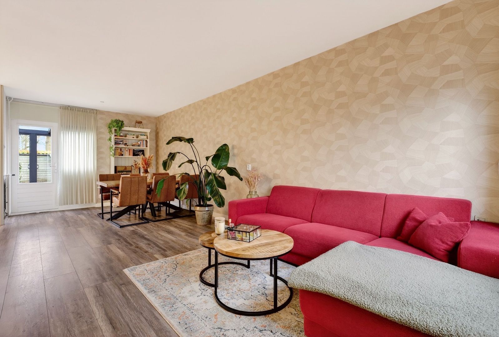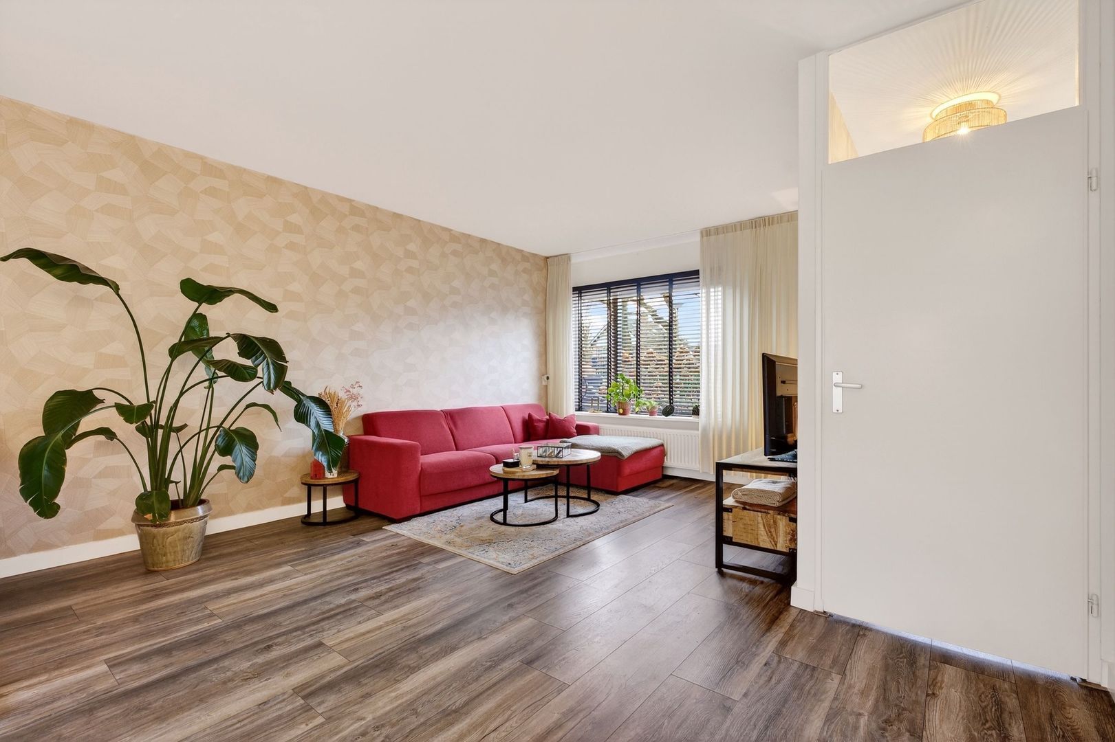 De woonkamer beschikt over een royale zitruimte en is strak afgewerkt met glad gestucte wanden en plafonds. Dankzij de grote raampartijen geniet je hier van veel natuurlijk licht en een vrij uitzicht over het groen, wat zorgt voor een open en rustige sfeer. De praktische trapkast biedt extra bergruimte.