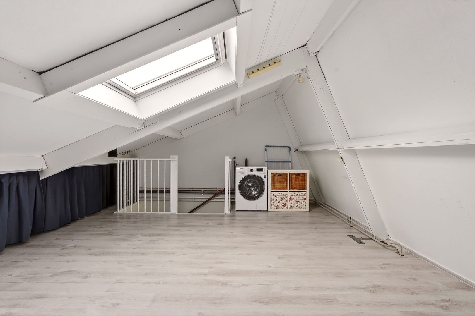 De tweede verdieping is een volwaardige en multifunctionele ruimte met een groot dakraam dat zorgt voor veel natuurlijk licht. Daarnaast zijn hier de aansluitingen voor wasmachine en droger gesitueerd en is er praktische bergruimte aanwezig achter het knieschot, waardoor deze verdieping ook uitstekend geschikt is als werk- of logeerruimte.