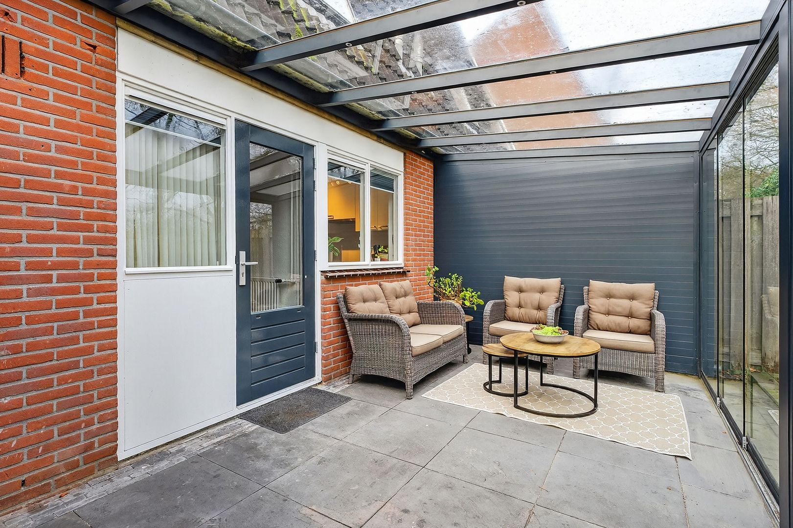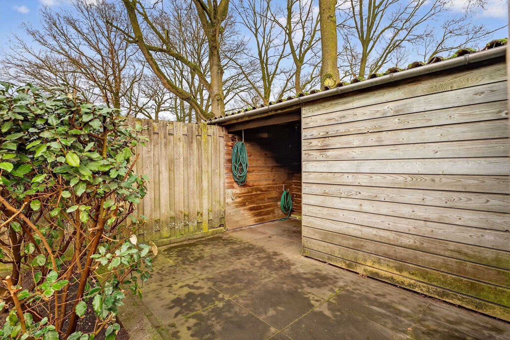 Aan de achterzijde grenst de tuin aan een fietspad. Via dit fietspad bent u binnen enkele minuten in het centrum en bereikt u eenvoudig andere voorzieningen in de omgeving. De achtertuin biedt hierdoor niet alleen privacy, maar ook een fijne combinatie van rust en uitstekende bereikbaarheid.