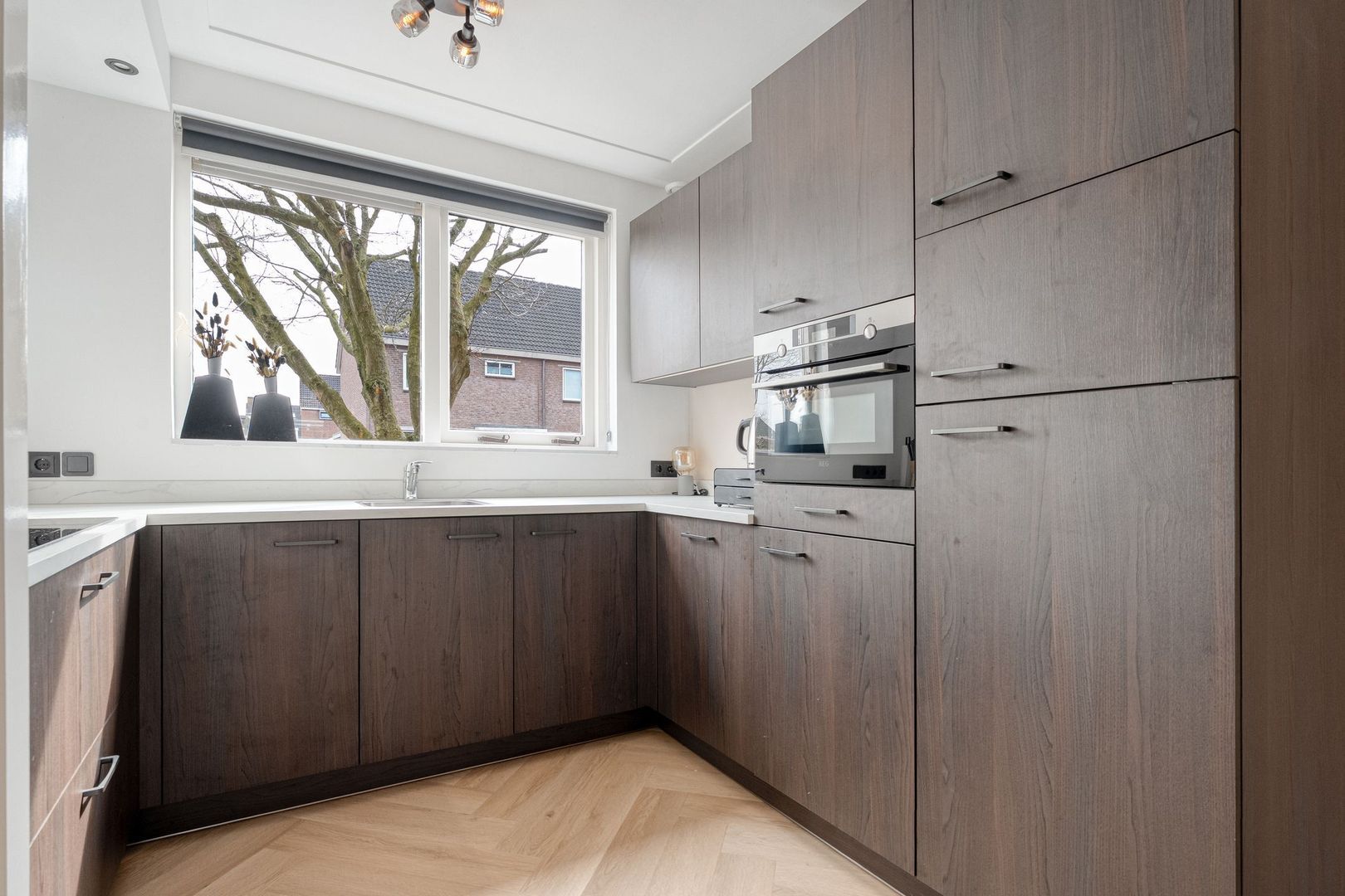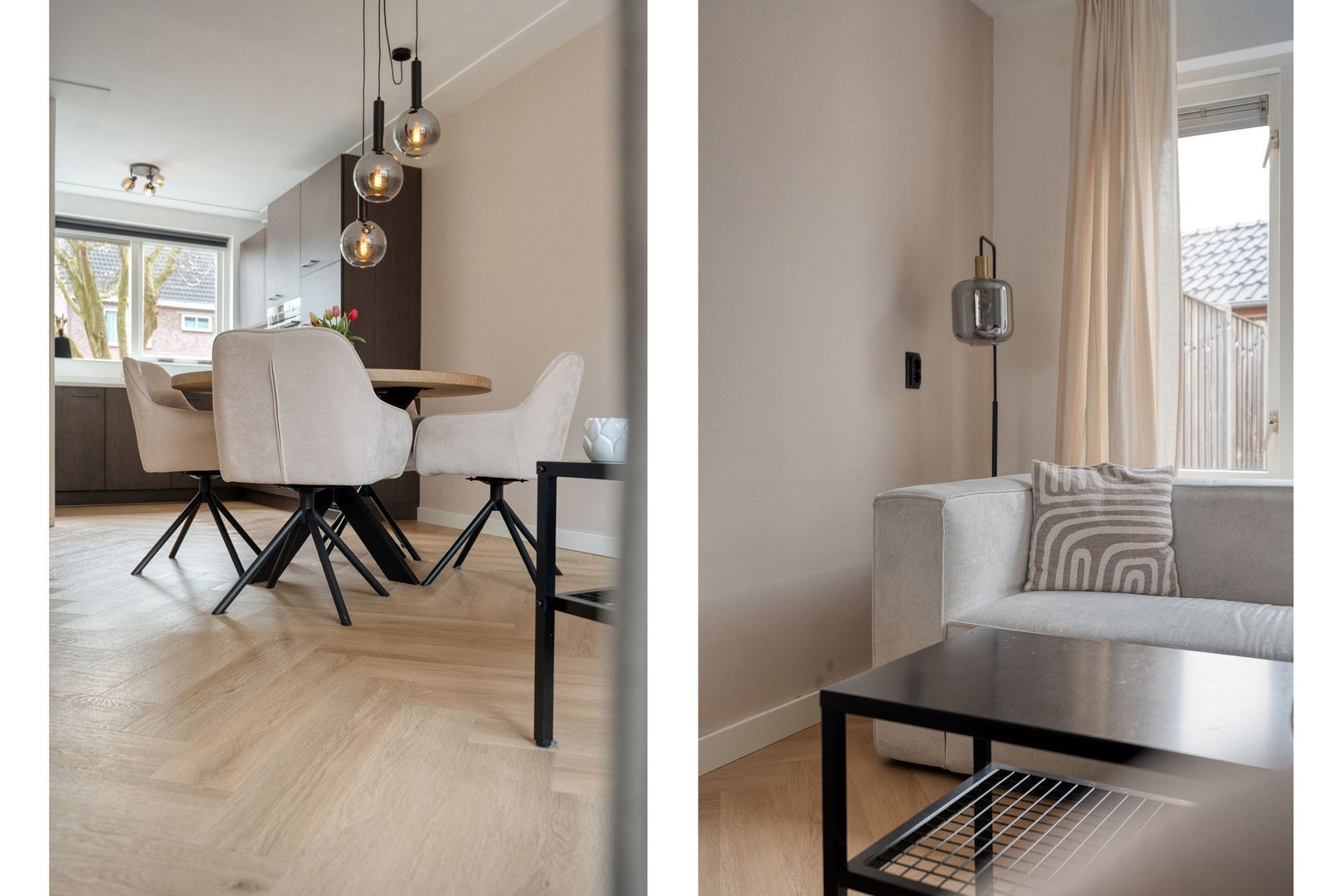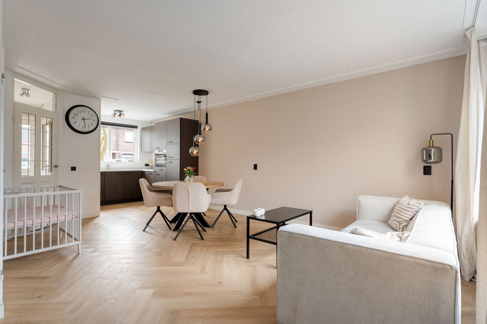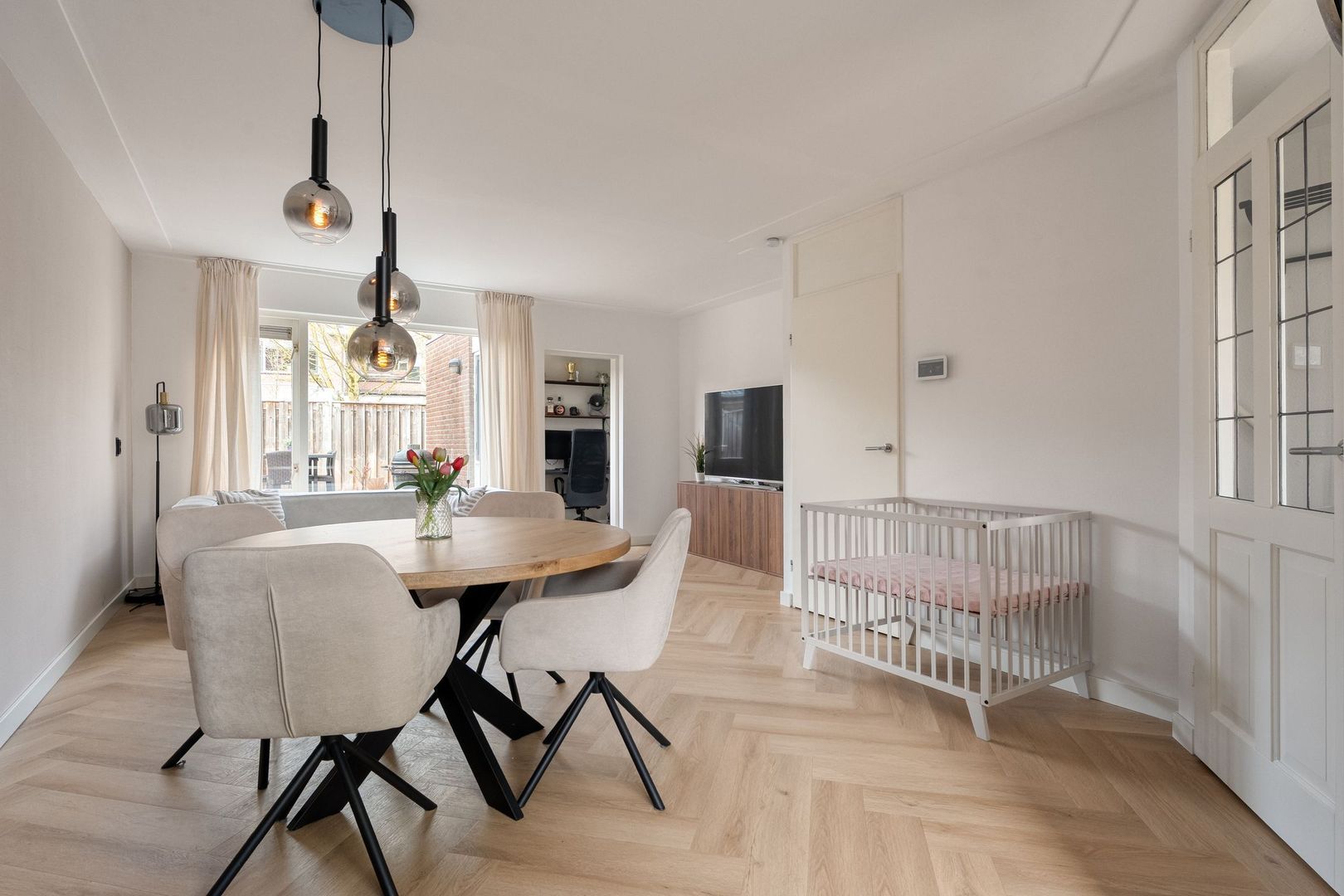 De begane grond vormt het stijlvolle hart van de woning. Bij binnenkomst valt direct de hoogwaardige afwerking op: de strakke wand- en plafondafwerking in combinatie met de fraaie visgraat PVC-vloer zorgt voor een warme, eigentijdse uitstraling.
