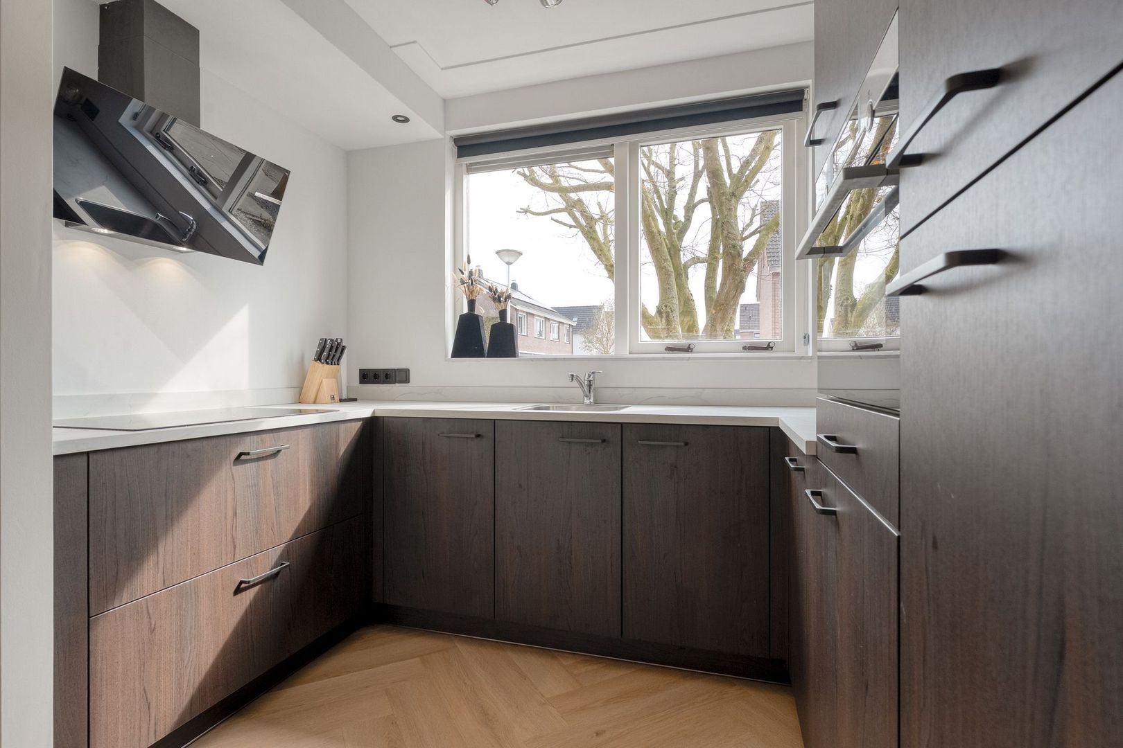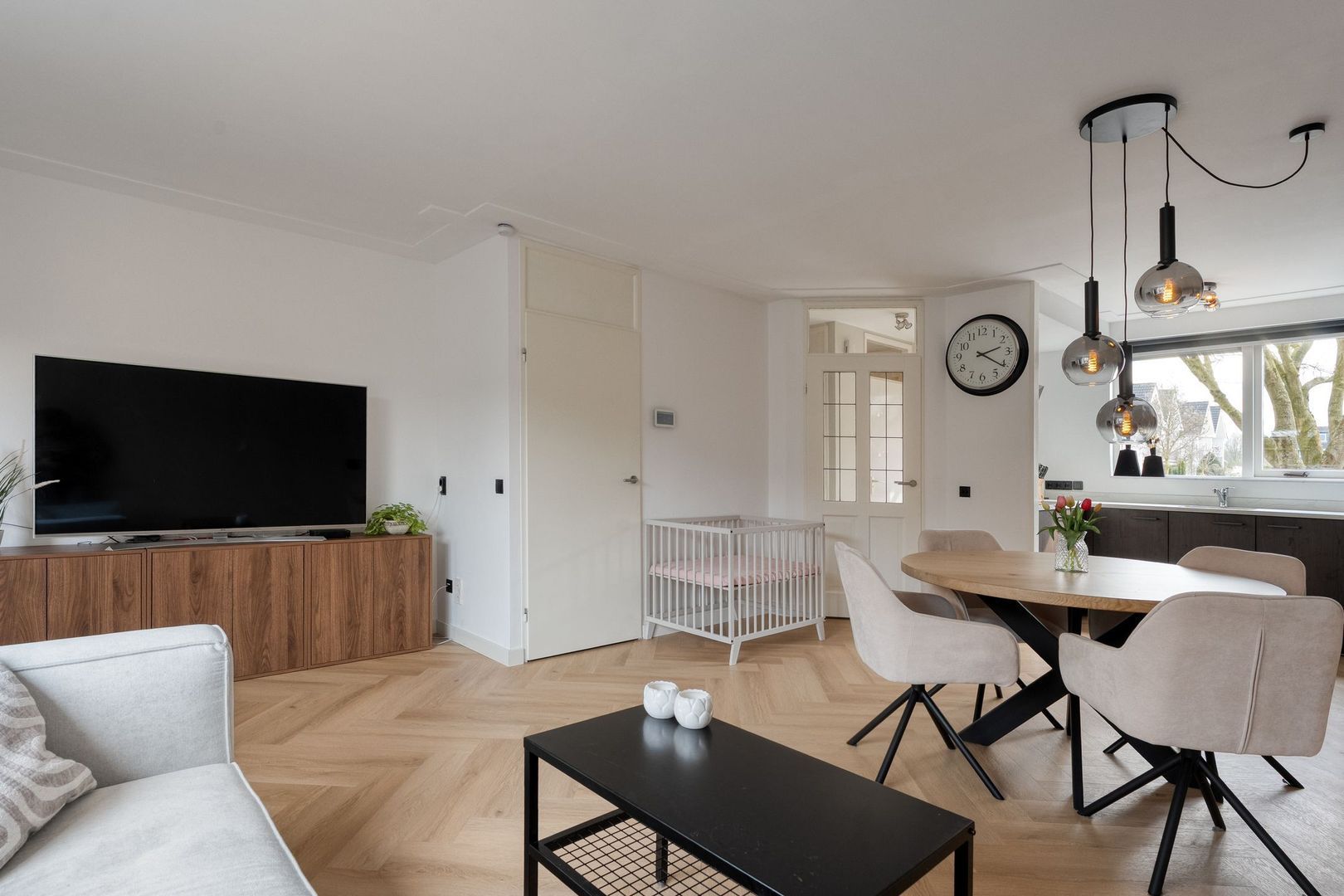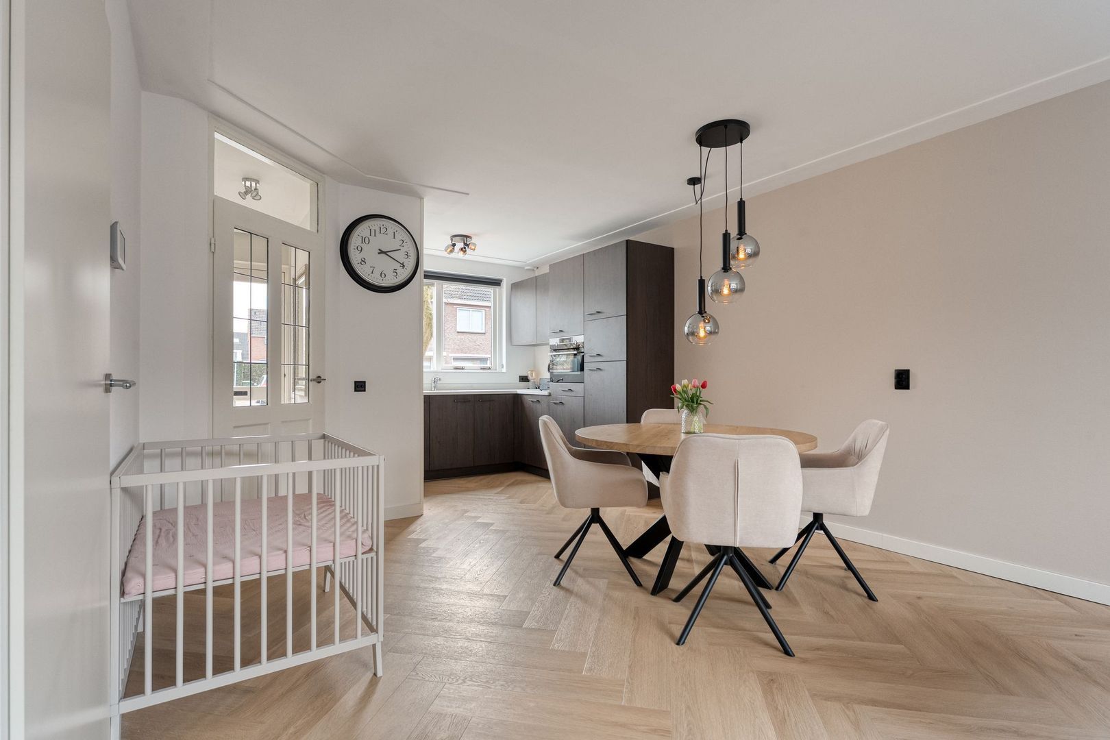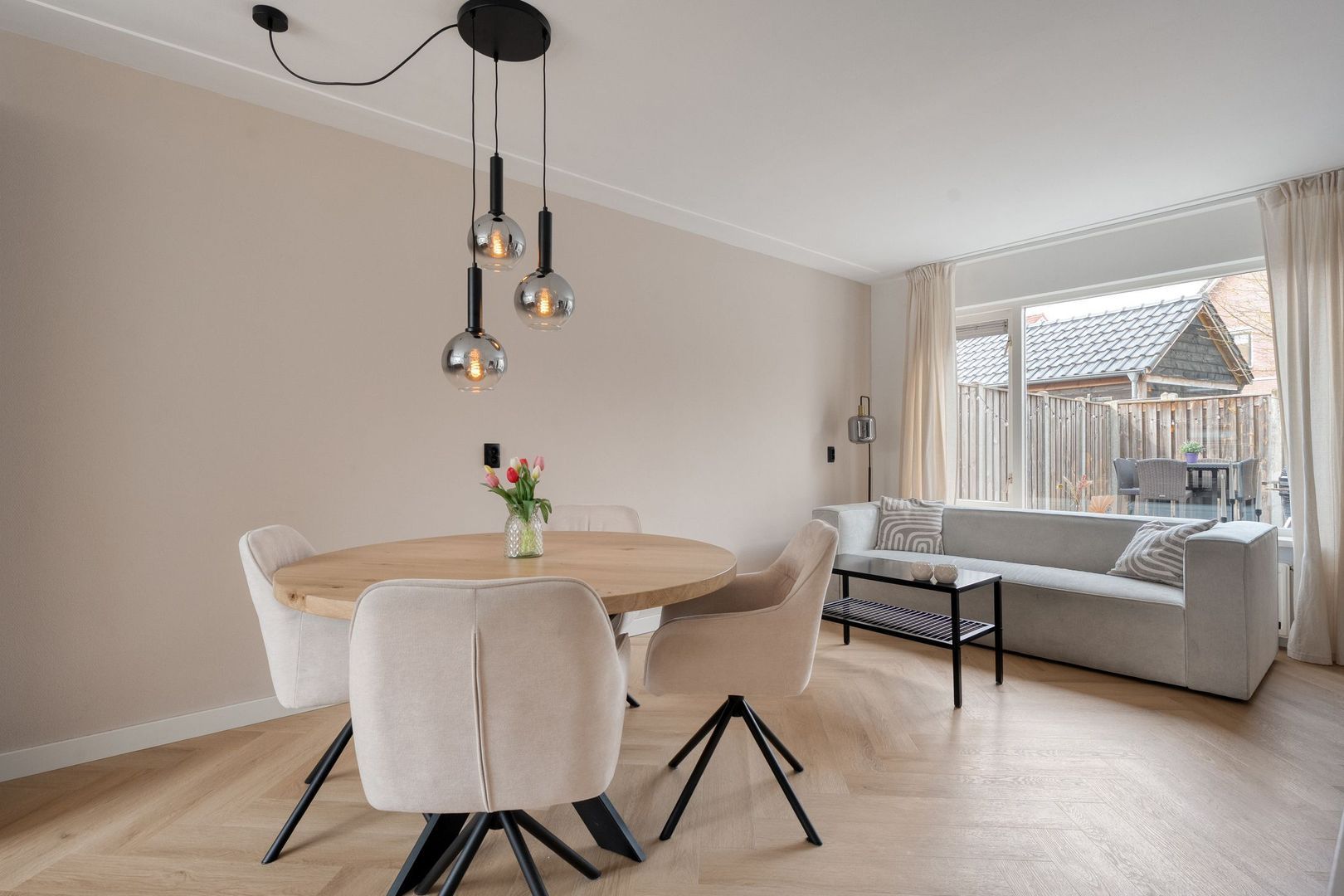 De begane grond vormt het stijlvolle hart van de woning. Bij binnenkomst valt direct de hoogwaardige afwerking op: de strakke wand- en plafondafwerking in combinatie met de fraaie visgraat PVC-vloer zorgt voor een warme, eigentijdse uitstraling.