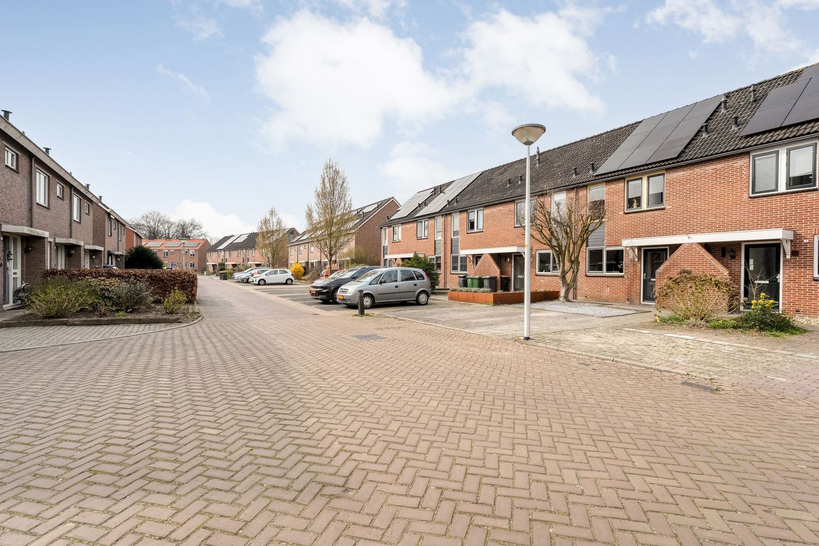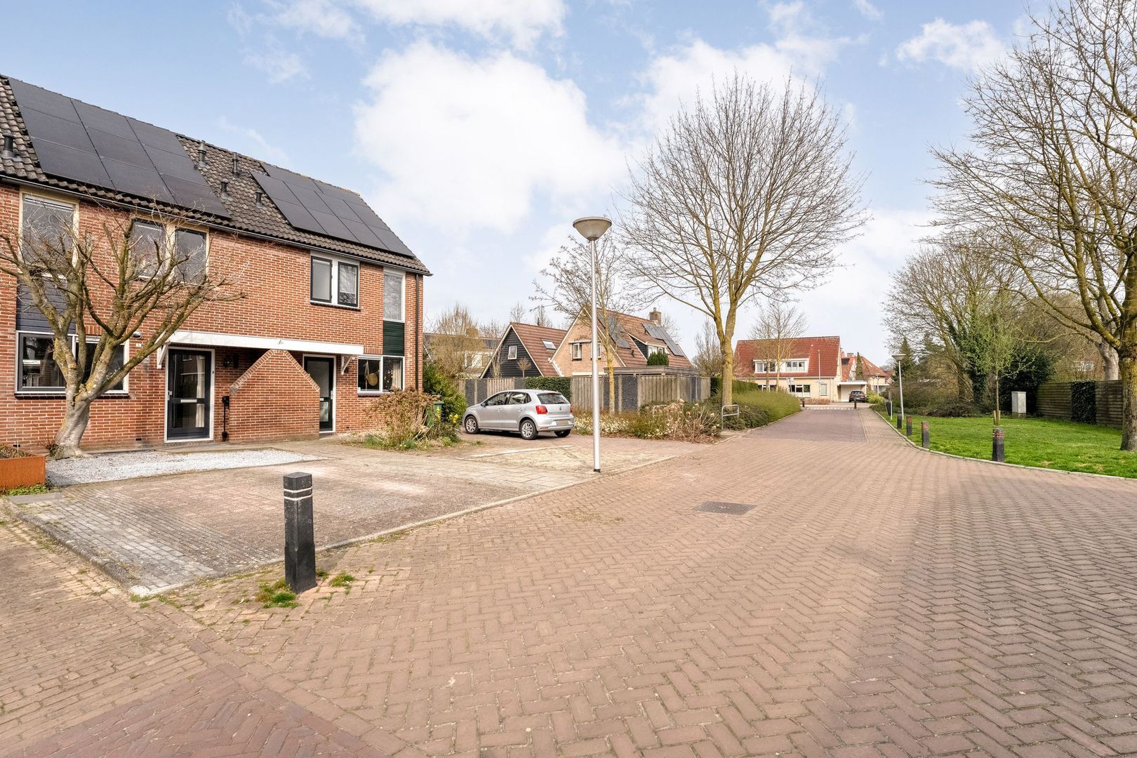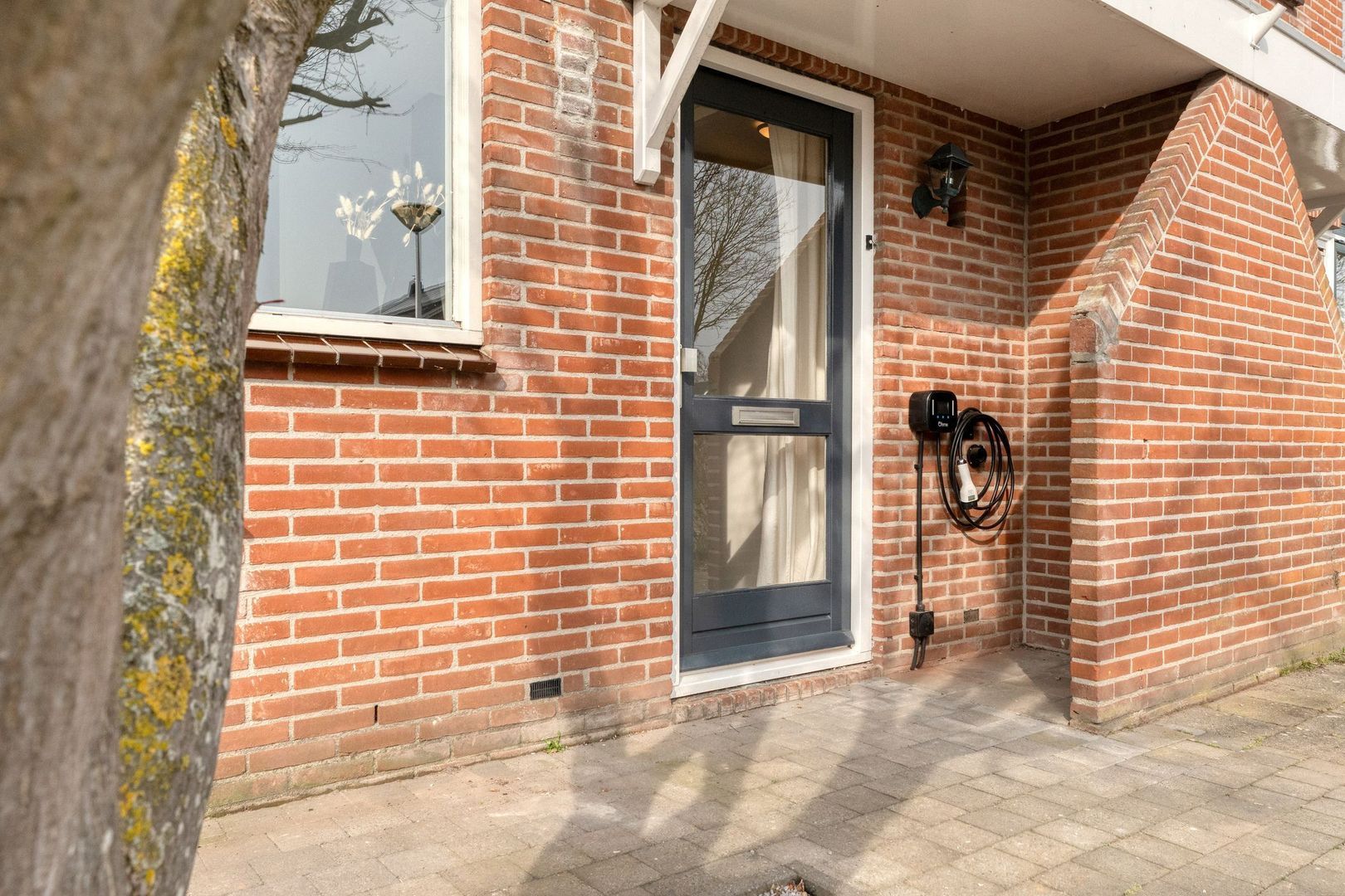 Bij aankomst valt direct de onderhoudsvriendelijke voortuin op, die bijdraagt aan een nette eerste indruk. Op eigen terrein is ruimte voor maar liefst twee auto’s, wat een groot pluspunt is in het dagelijks gebruik. Daarnaast is er een laadpaal aanwezig, waardoor de woning klaar is voor elektrisch rijden.