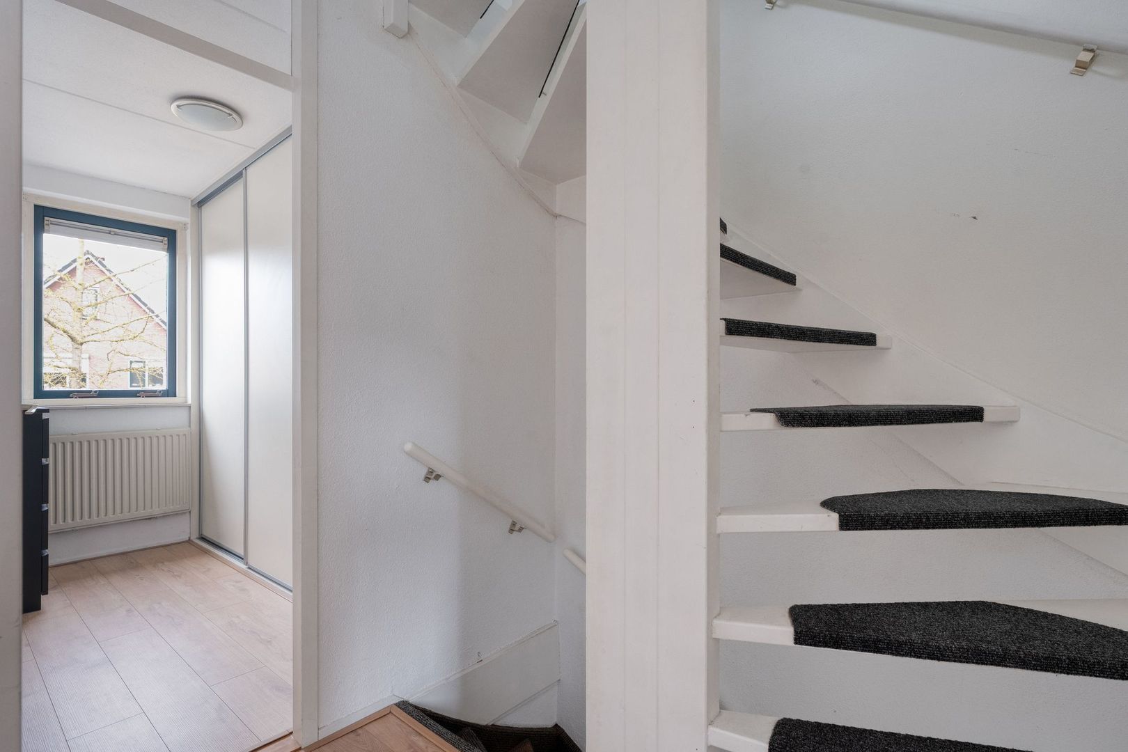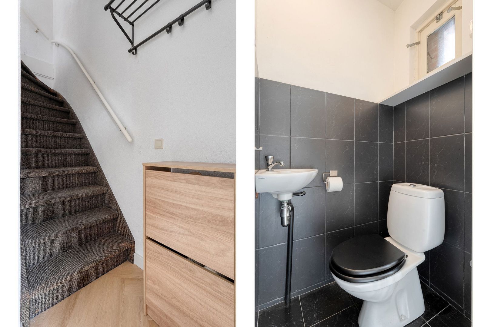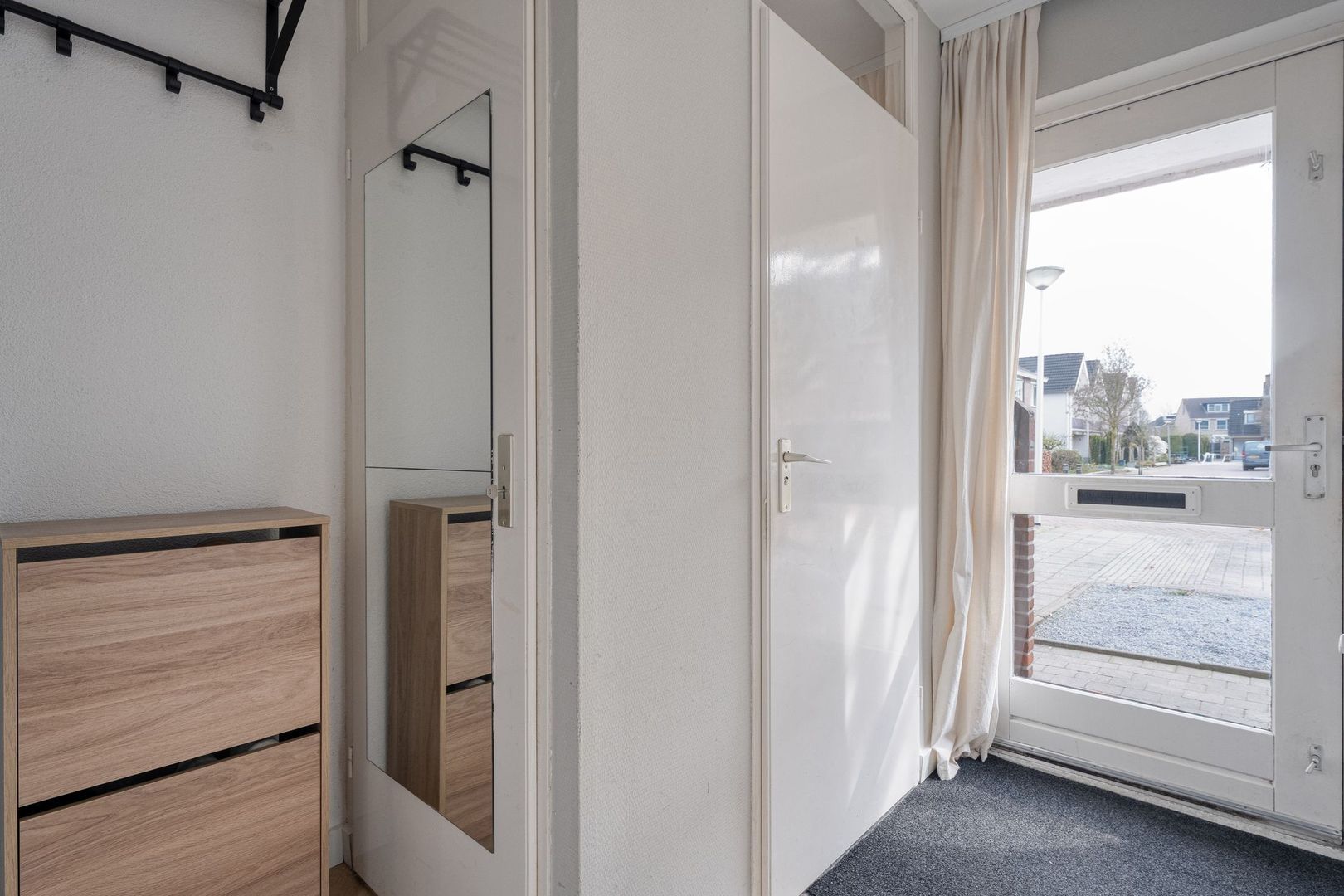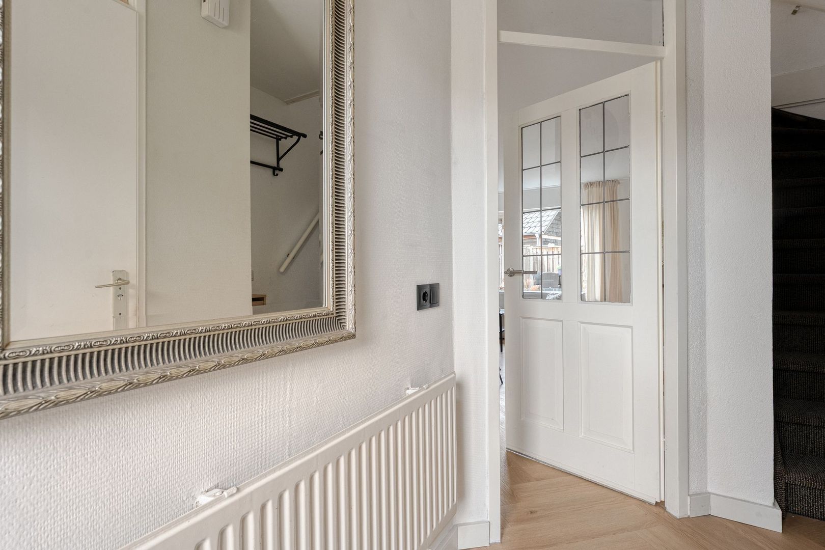 Via de entree kom je binnen in een nette hal die toegang biedt tot de meterkast en toilet met fontein. De hal vormt een verzorgd en functioneel welkom en geeft direct toegang tot de leefruimte op de begane grond. Dankzij de gunstige ligging aan de voorzijde ervaar je hier bovendien een prettig vrij uitzicht.