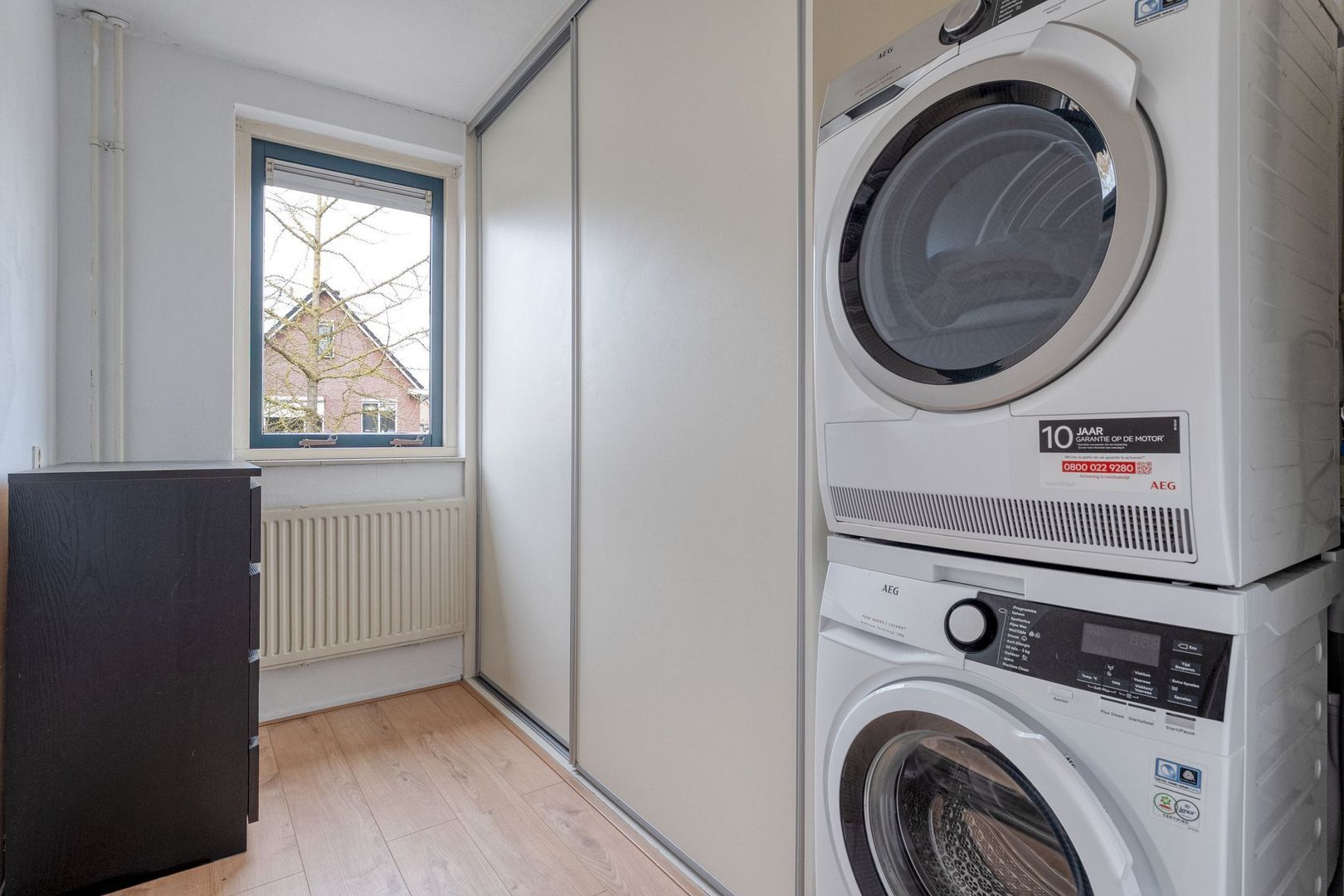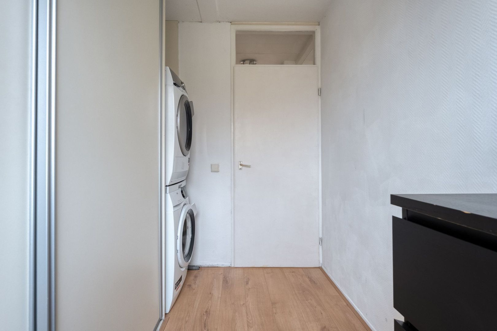 De tweede slaapkamer is multifunctioneel en biedt diverse mogelijkheden. Momenteel is hier een opstelling voor de wasmachine en droger gerealiseerd, maar de ruimte leent zich ook uitstekend als extra slaapkamer of werkruimte. De aanwezige schuifkastenwand zorgt voor praktische opbergruimte en een nette afwerking.