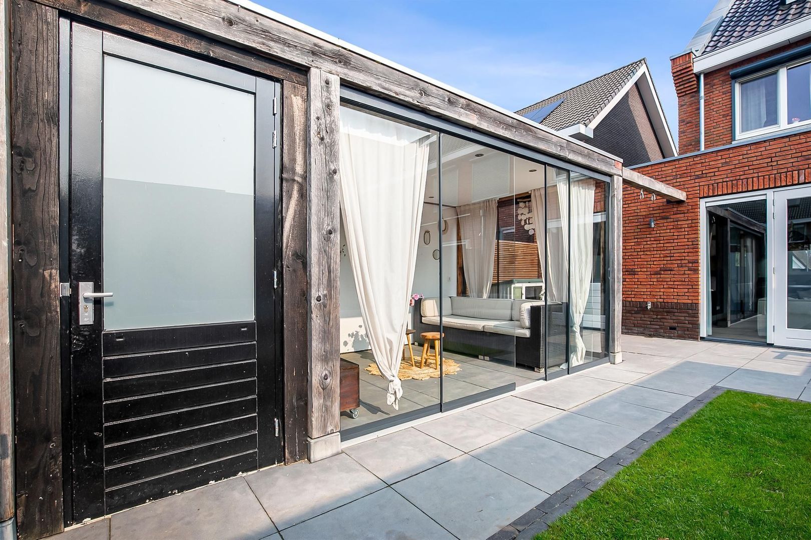 Tuinhuis met glazen schuifwanden, houtkachel, schuurgedeelte en elektravoorziening.