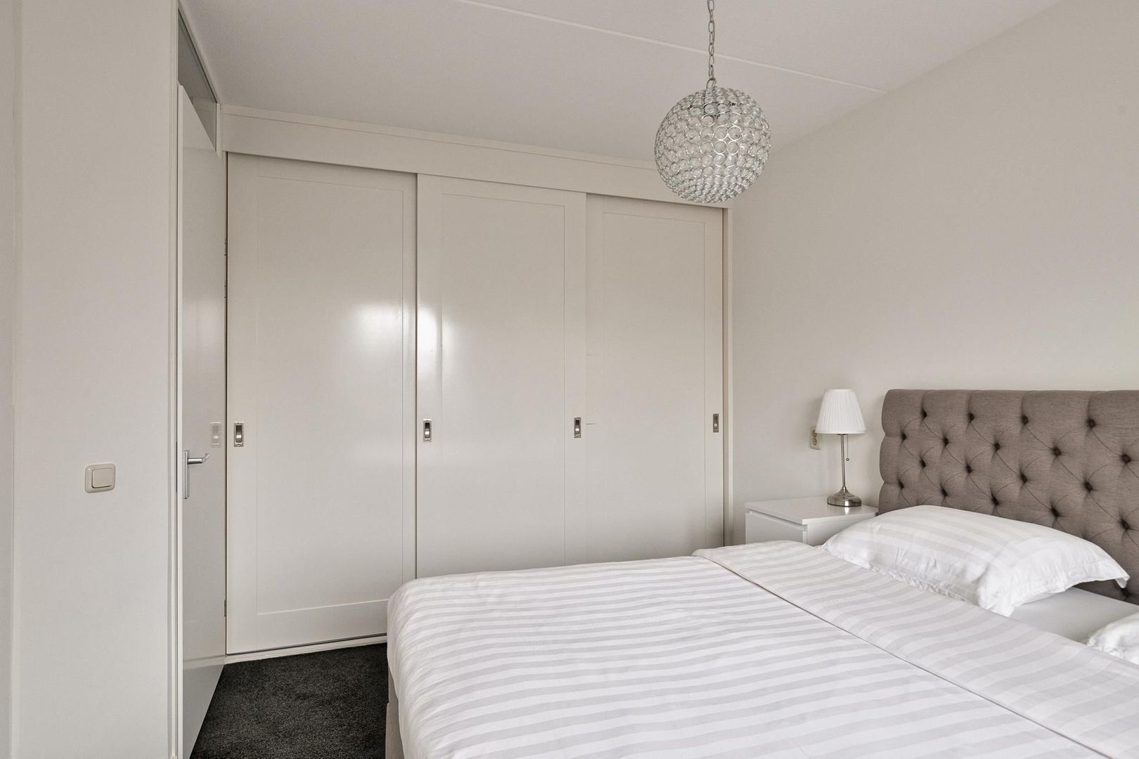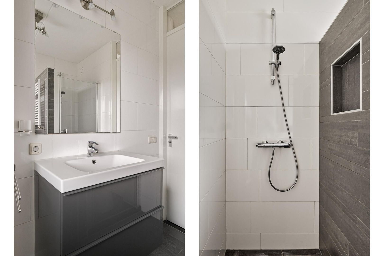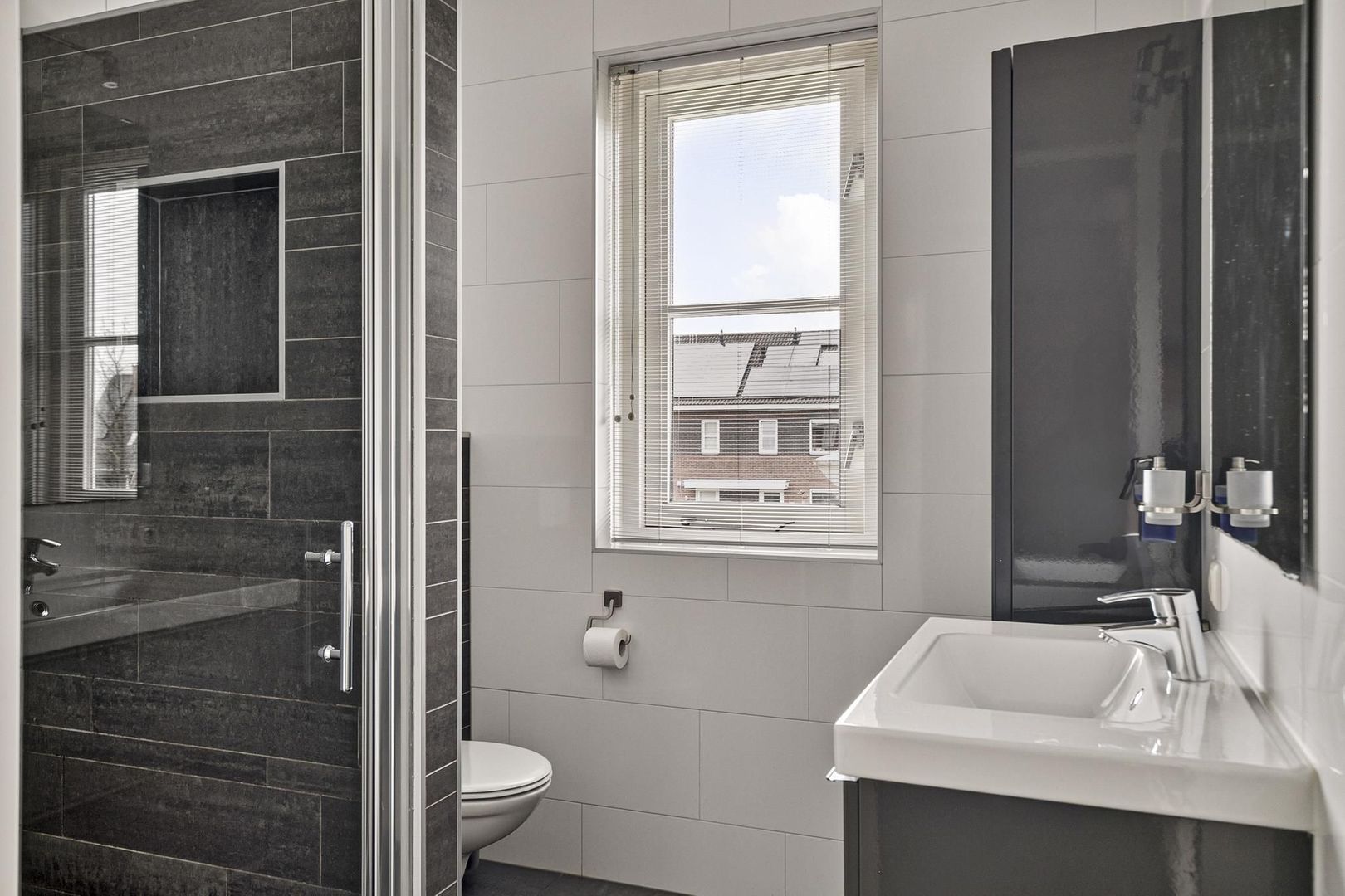 overloop met trapopgang tweede verdieping; drie slaapkamers waarvan één met luxe schuifkastenwand en één met rolluik; badkamer voorzien van wandcloset, designradiator, wastafel met meubel en hangkast, inloopdouche met glazen deur en praktische inbouwnis;