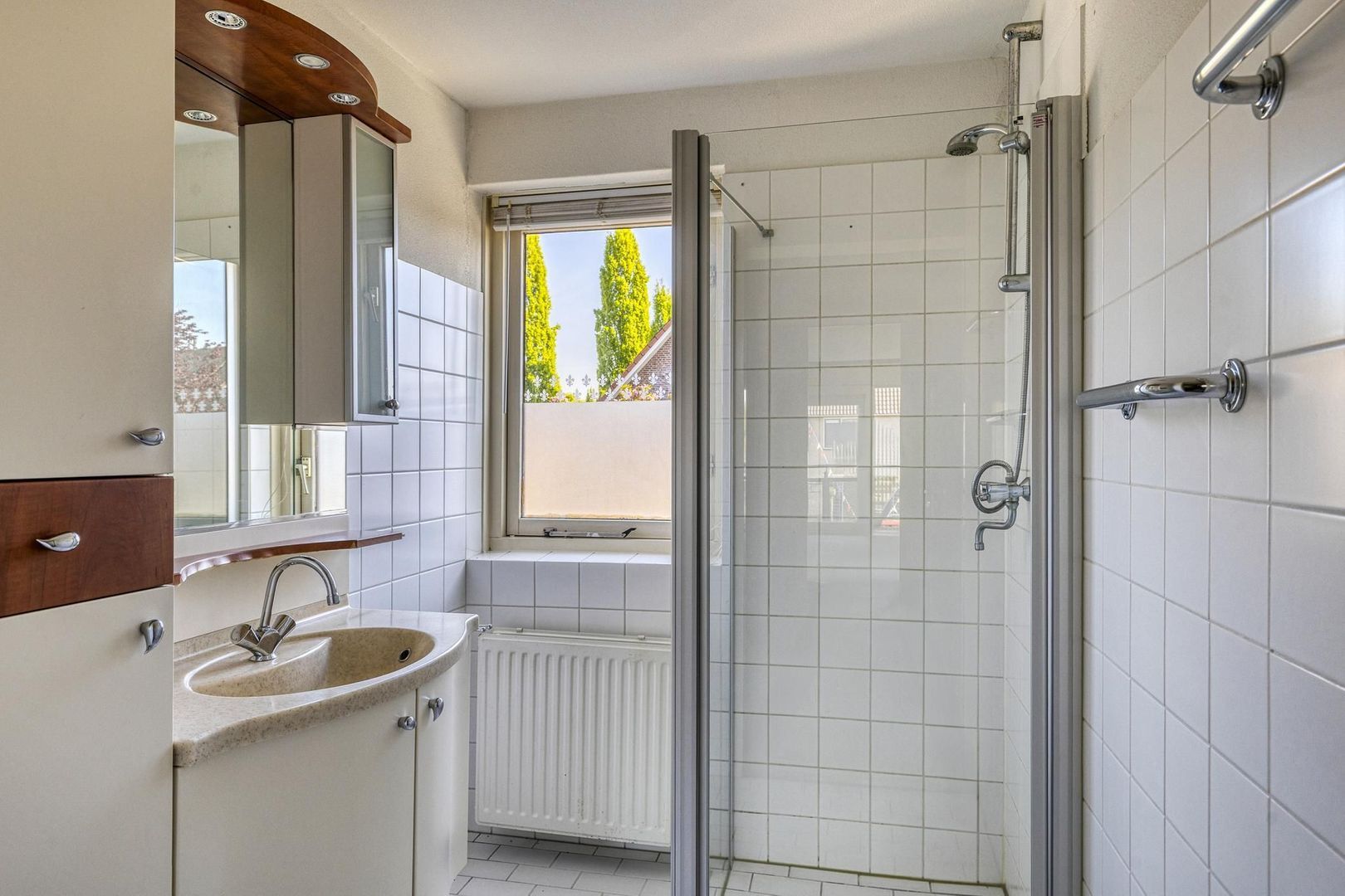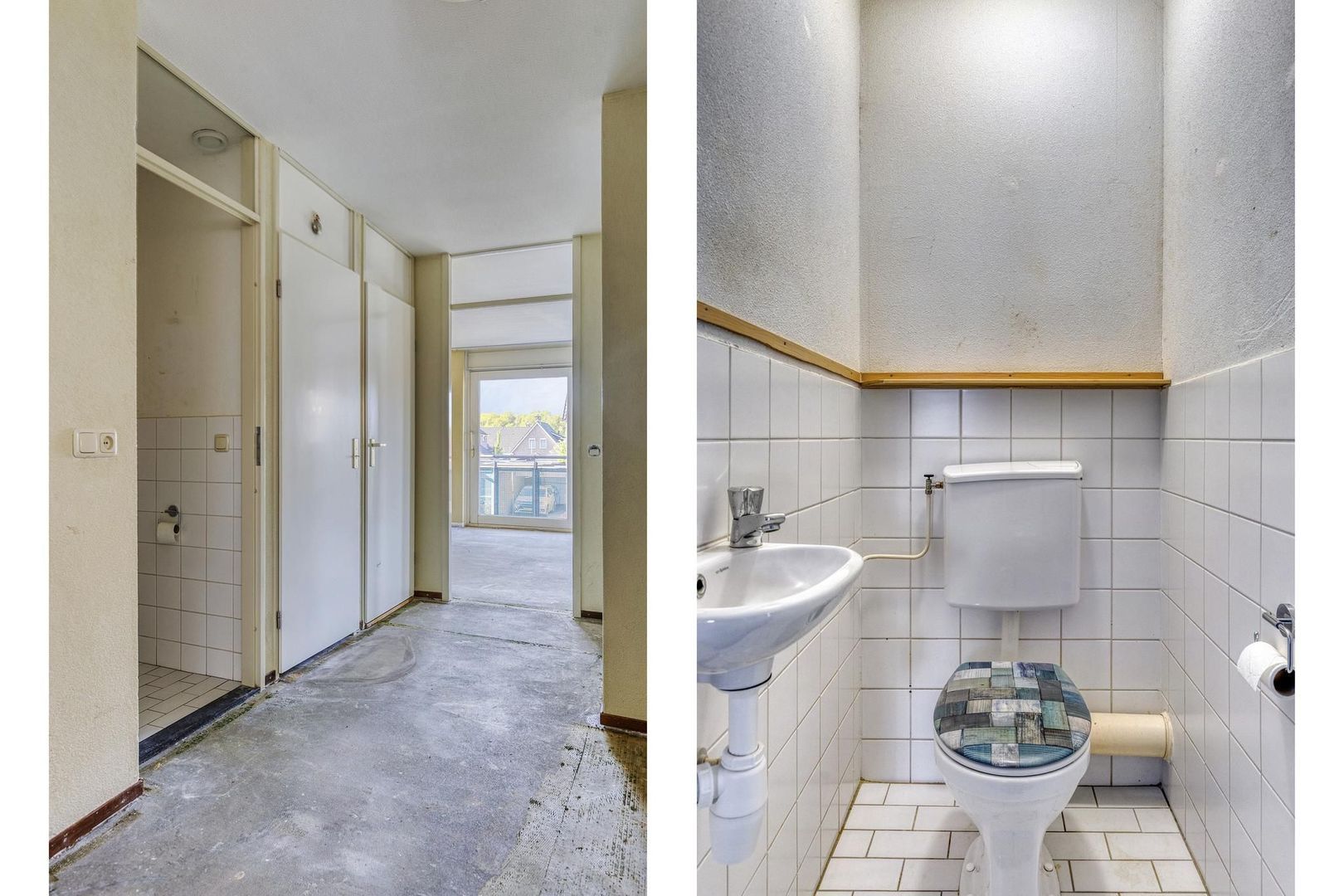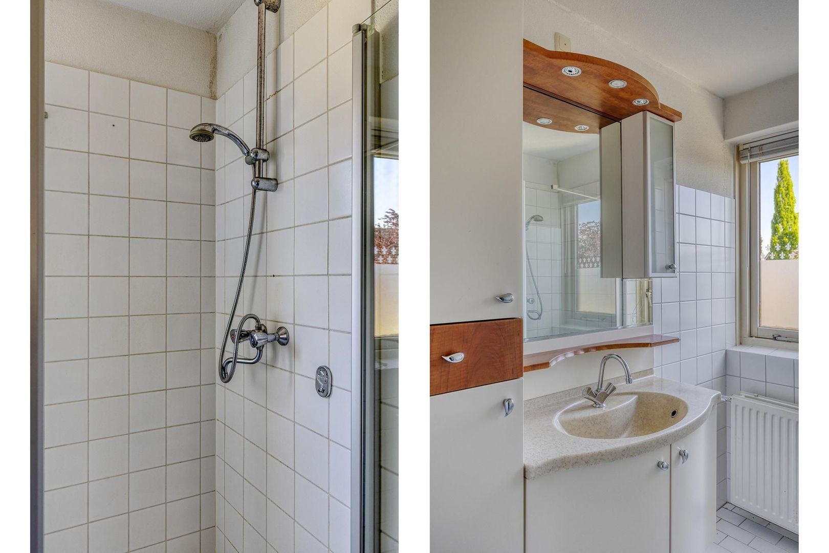 Bij binnenkomst via de gezamenlijke entree en trapopgang kom je in een centrale hal die toegang geeft tot alle ruimtes van het appartement. Direct rechts bevindt zich de badkamer, uitgerust met een inloopdouche en wastafelmeubel. Naast de badkamer is de aparte toiletruimte met fonteintje gelegen.