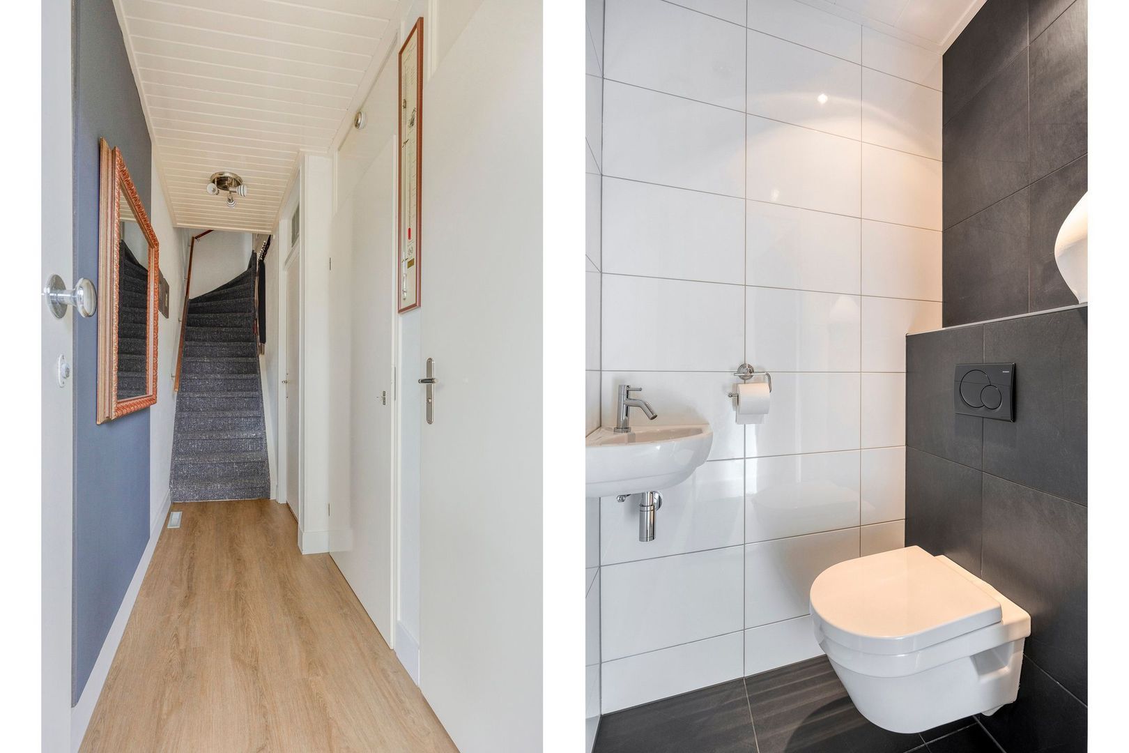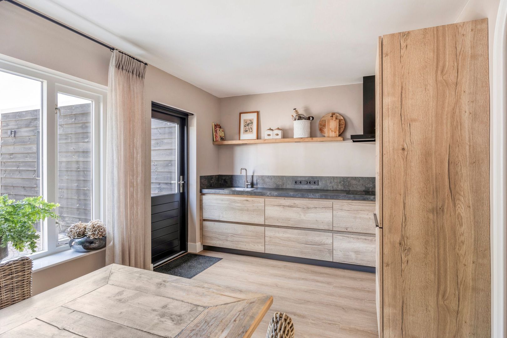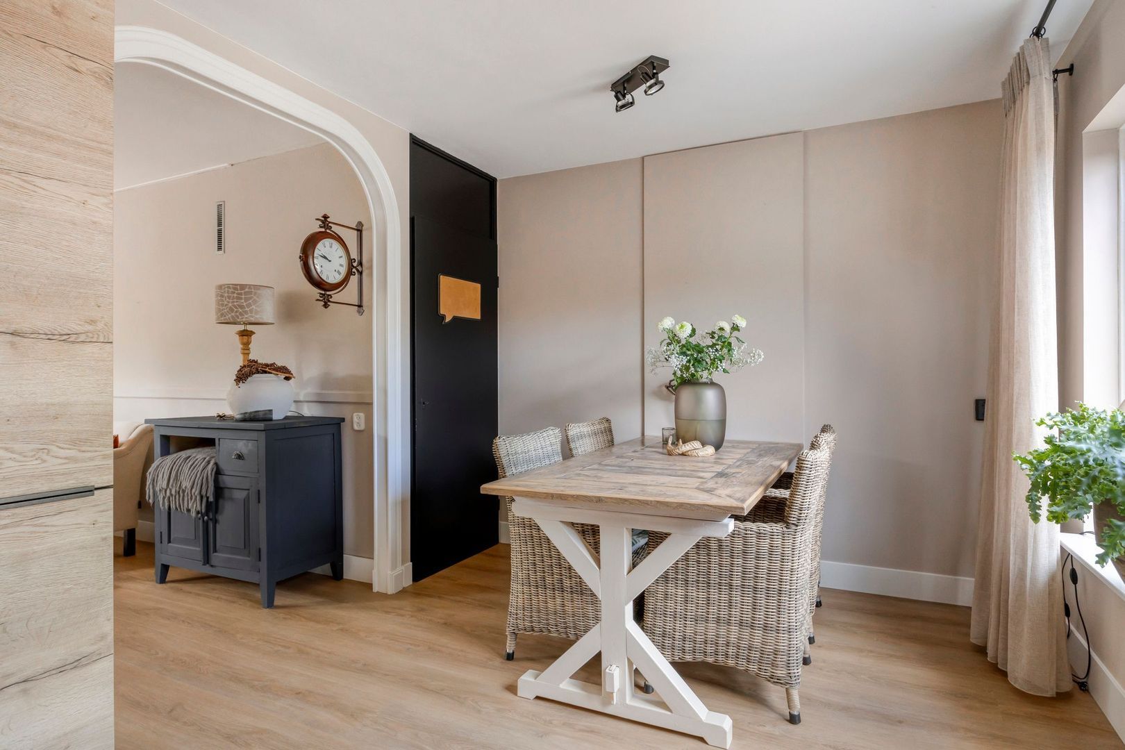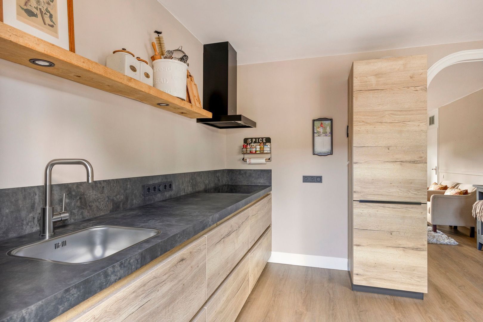 verzorgde hal/entree met trapopgang, meterkast en toiletruimte met fontein. Toegang tot de lichte woonkamer met moderne PVC-vloer en strakke wand- en plafondafwerking. Aan de achterzijde bevindt zich de halfopen keuken met directe toegang tot de tuin. De keuken is vernieuwd in 2023 en voorzien van moderne inbouwapparatuur en veel kastruimte.