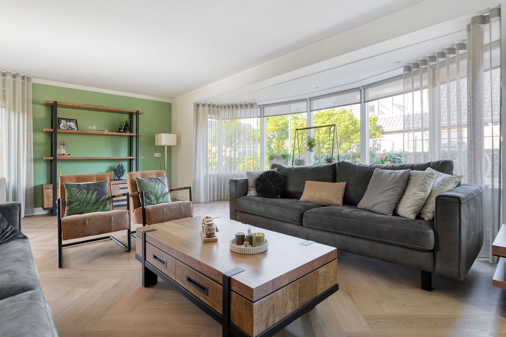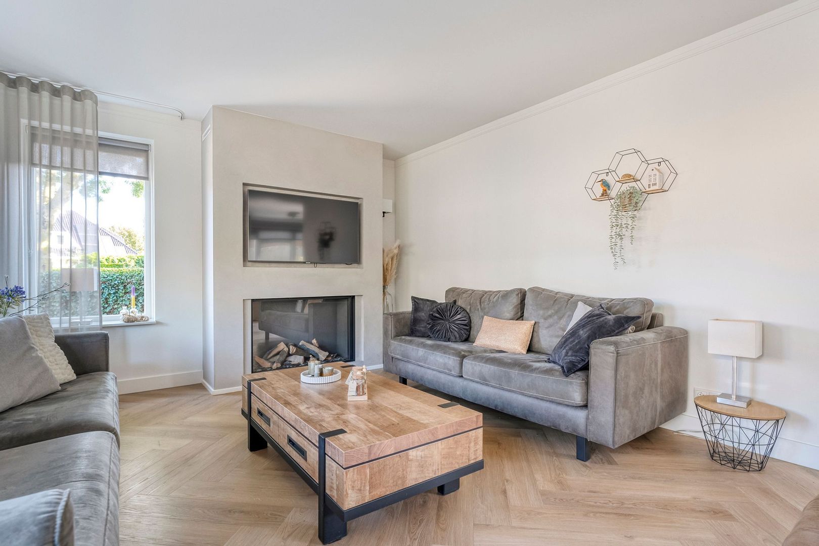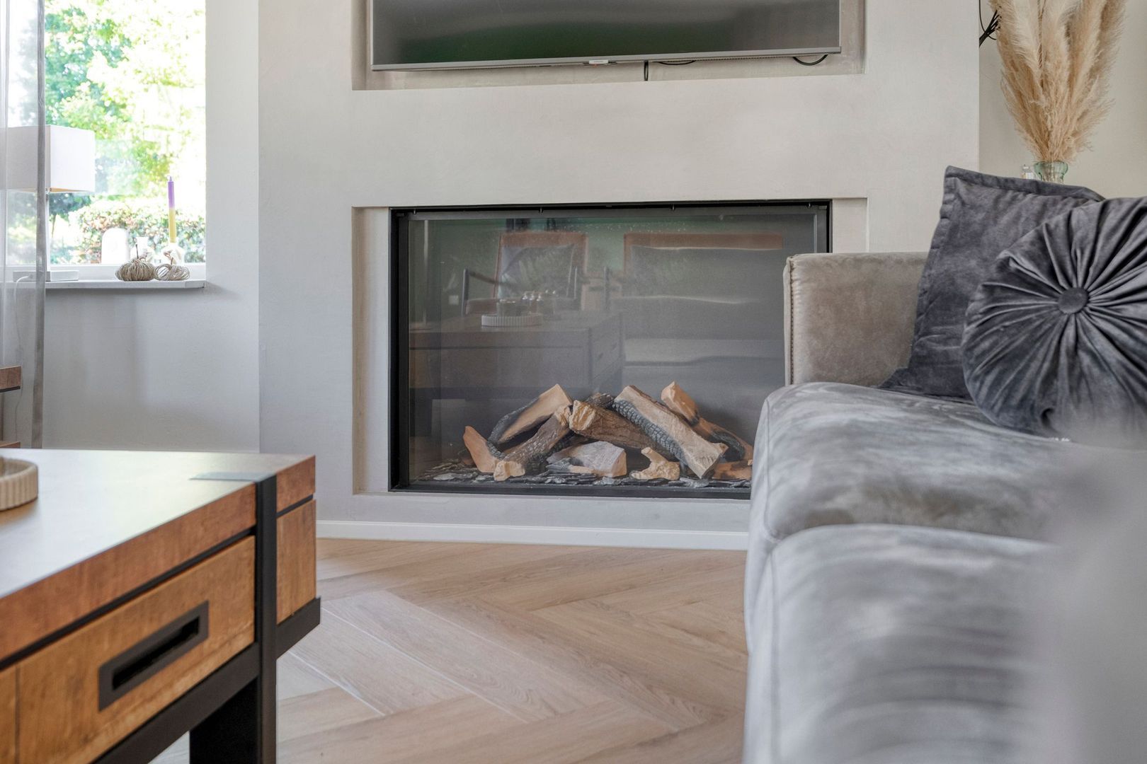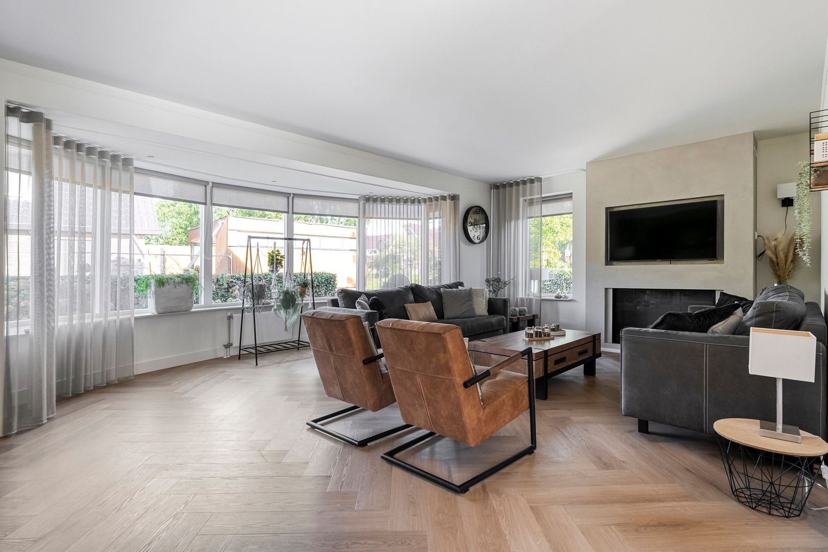 Na de hal betreedt u de indrukwekkende woonkamer, die direct een gevoel van ruimte en luxe uitstraalt. De royale erker aan de voorzijde zorgt voor een overvloed aan daglicht en biedt een prachtig, vrij uitzicht op de straat. Het samenspel van de pvc-vloer in visgraatmotief, de hoge plinten en het strak gestucte plafond geeft de woonkamer een stijlvolle en eigentijdse uitstraling. De elektrische gashaard met ingebouwd tv-meubel vormt bovendien de absolute eyecatcher van de ruimte.