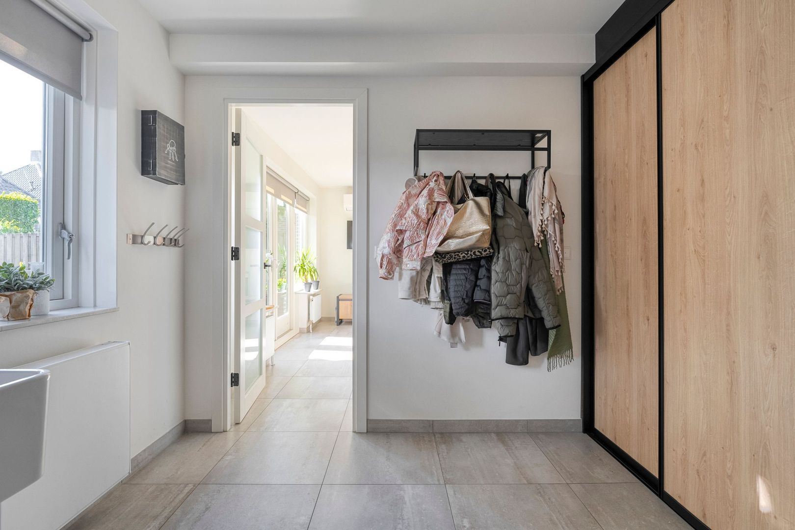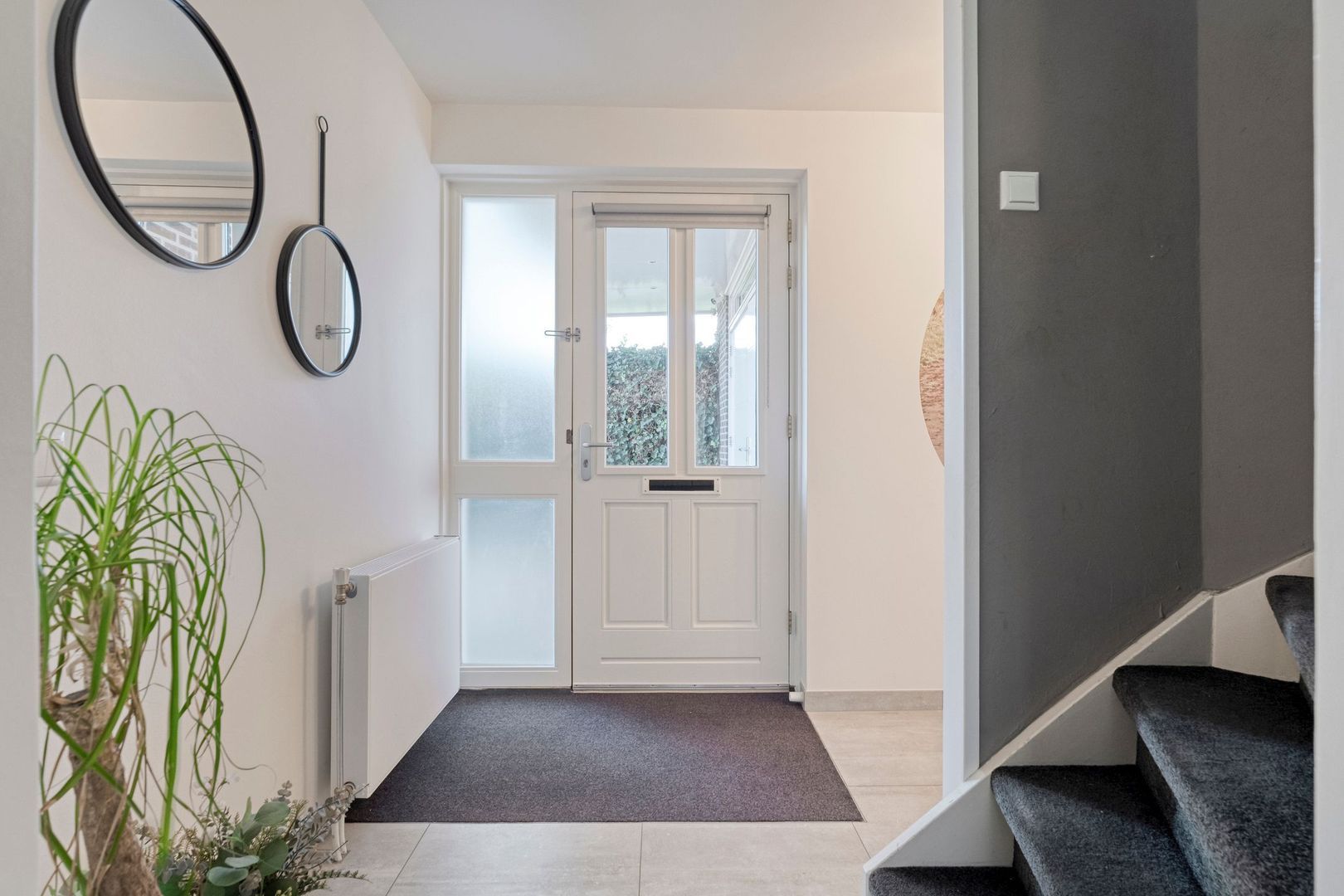 Wanneer u de woning betreedt via de entree, wordt u ontvangen in een ruime hal met een nette tegelvloer en verzorgde afwerking. Hier ziet u direct dat er met zorg is gebouwd en afgewerkt. De hal biedt toegang tot de trapopgang naar de eerste verdieping én de rest van de begane grond. Ook vindt u hier de meterkast en een praktische trapkast, ideaal voor extra bergruimte.