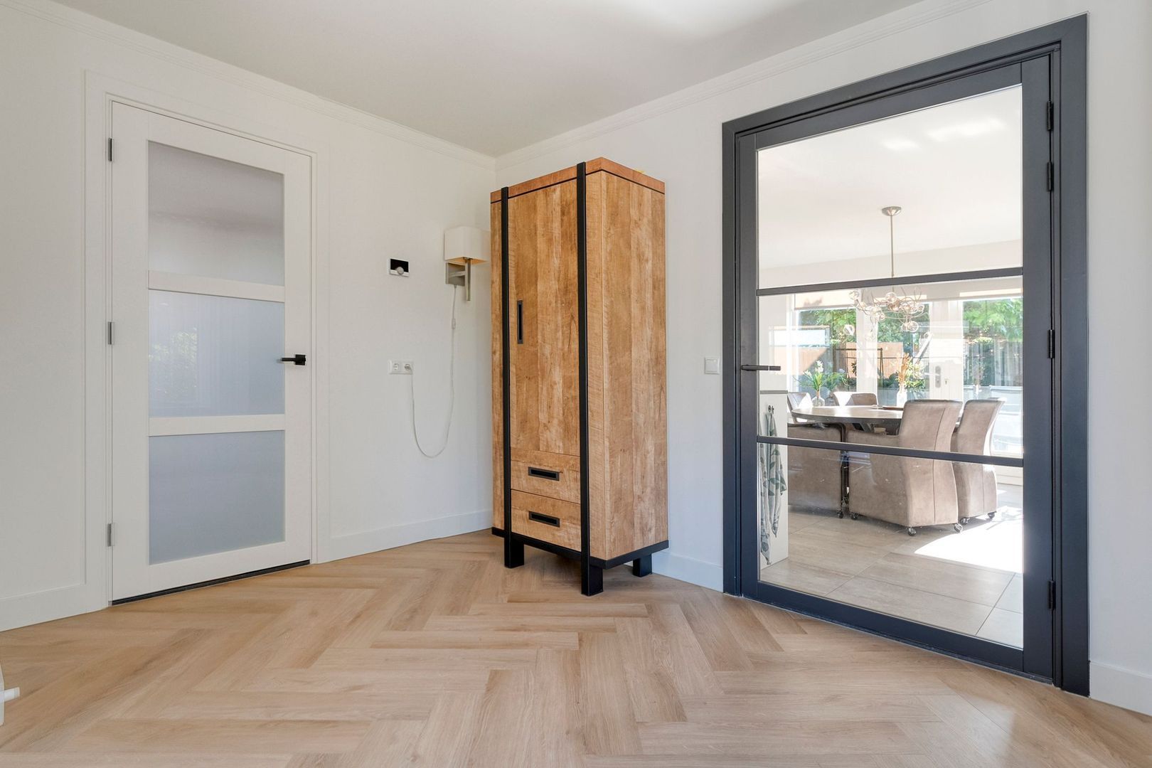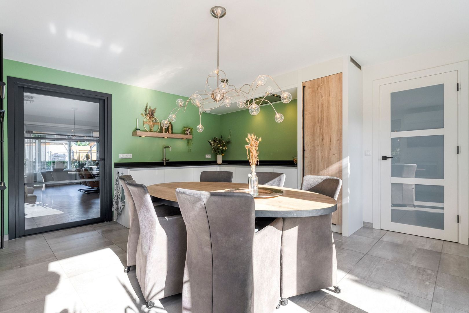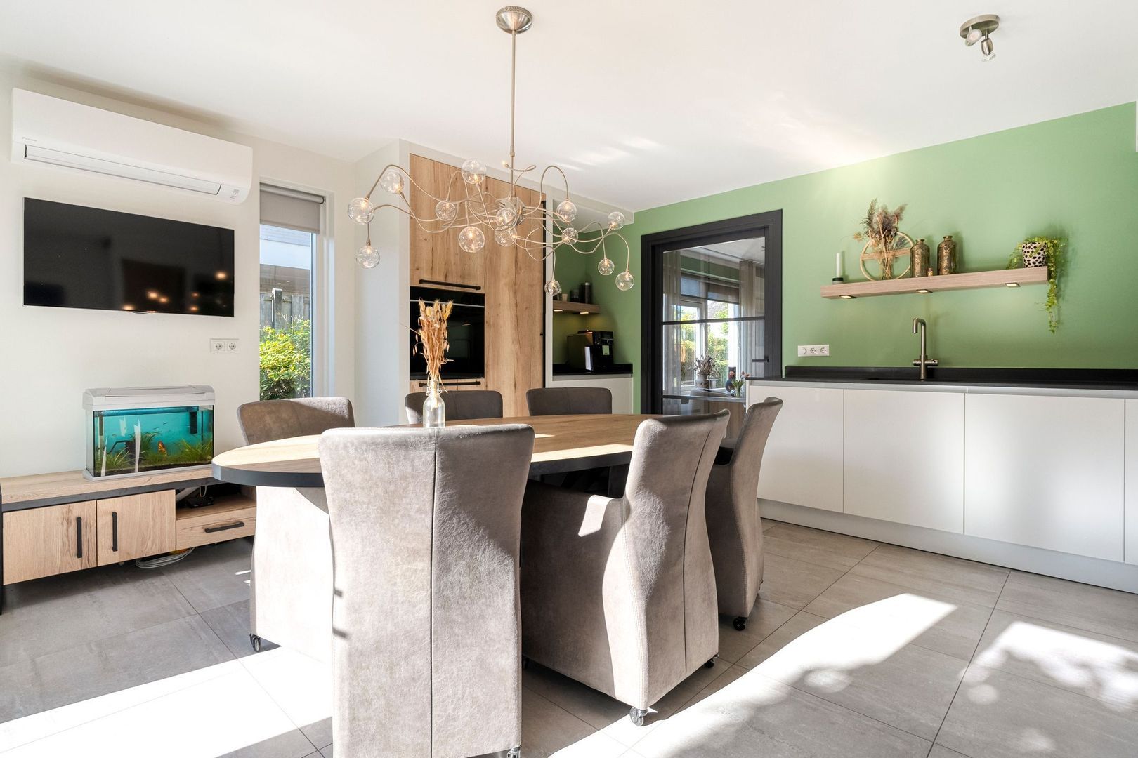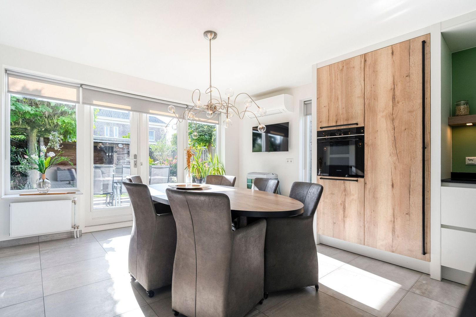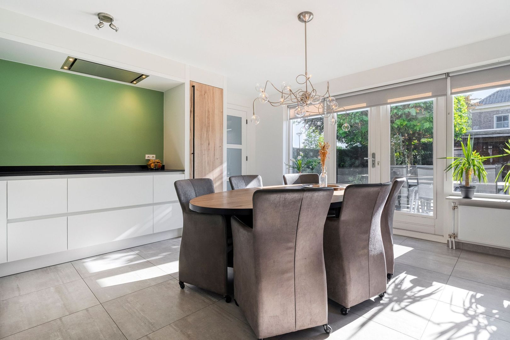 De woonkamer loopt naadloos over in de woonkeuken, die net zoals de woonkamer in 2023 volledig is vernieuwd. Hier staat comfort centraal. De keuken is uitgerust met hoogwaardige inbouwapparatuur, waaronder een moderne inductiekookplaat, combi-oven, Grohe-Quooker en een handige koffienis. De royale opzet biedt volop ruimte voor een grote eettafel, ideaal voor lange familiediners of gezellige avonden met vrienden. Dankzij de openslaande deuren naar de achtertuin vloeien binnen en buiten moeiteloos in elkaar over, waardoor u in de zomermaanden het ultieme buitengevoel ervaart.