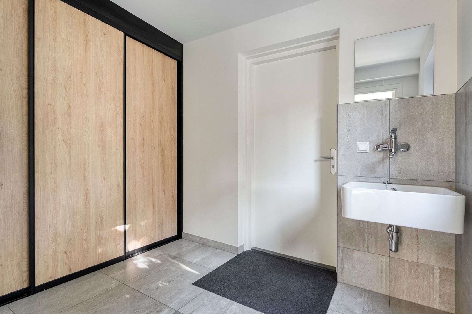 De toiletruimte is stijlvol ingericht en voorzien van een modern hangtoilet, fontein en een handige nis. Een radiator in de hal zorgt voor een behaaglijke temperatuur.