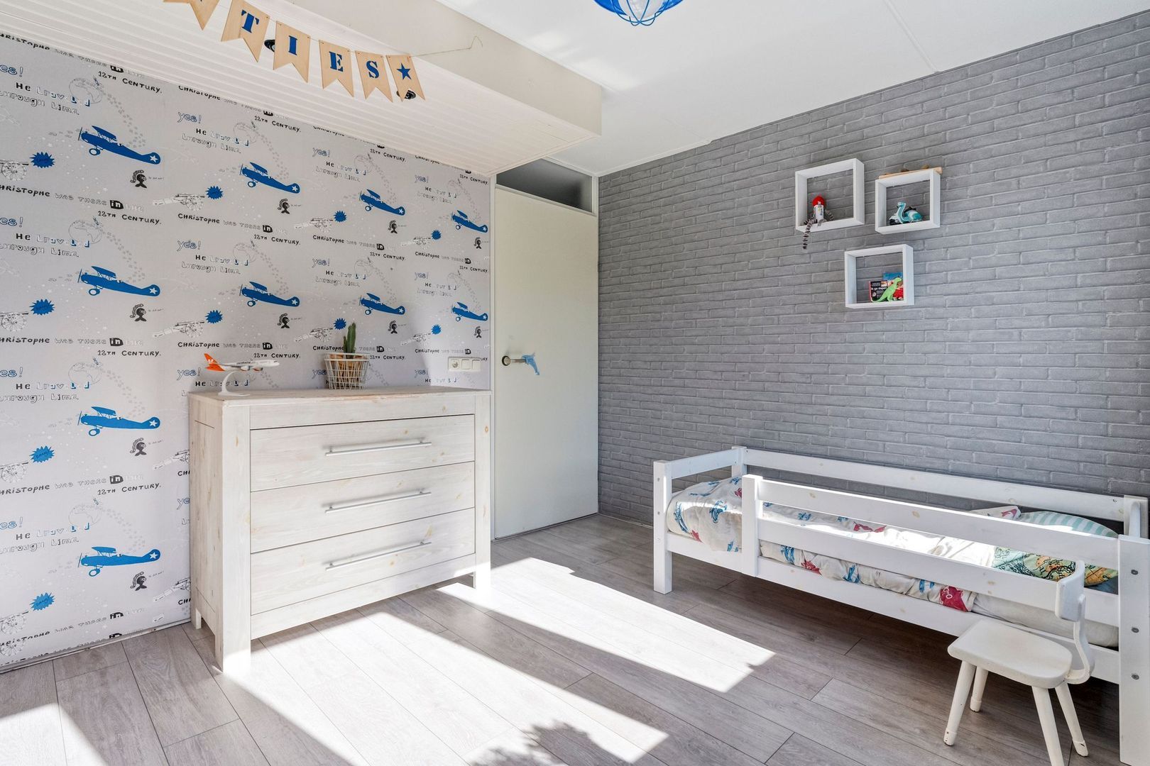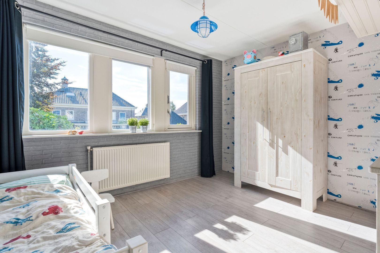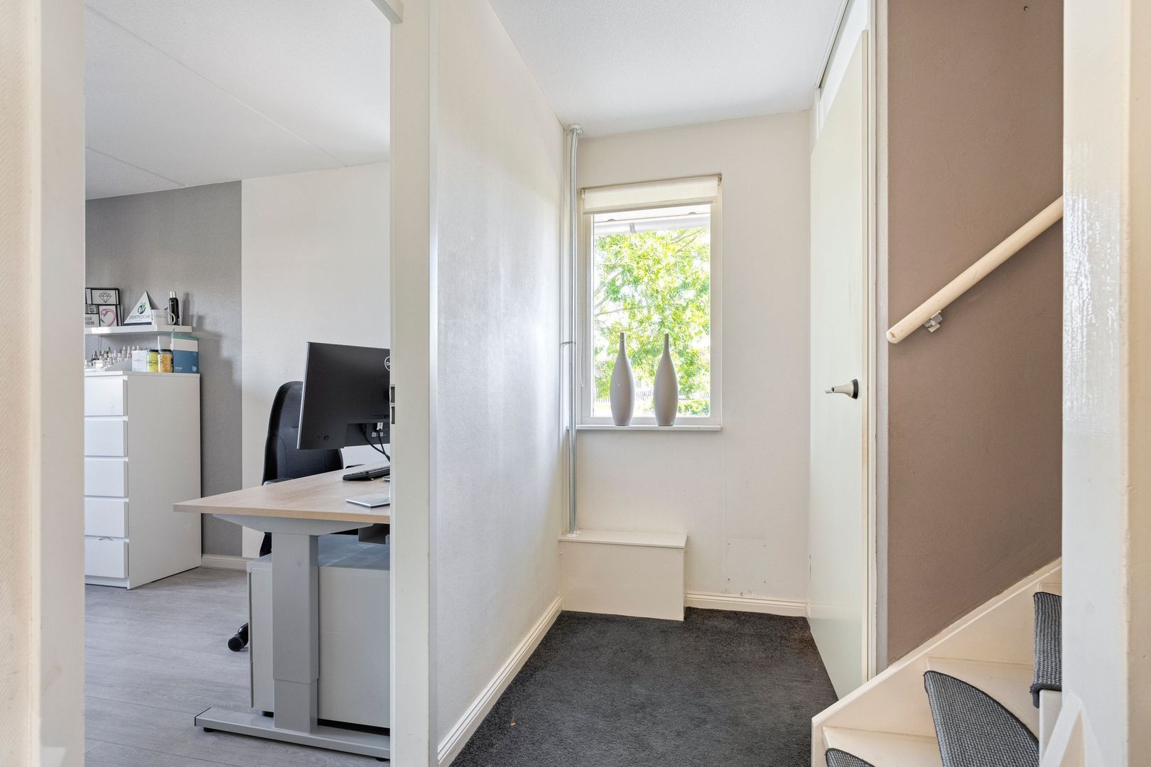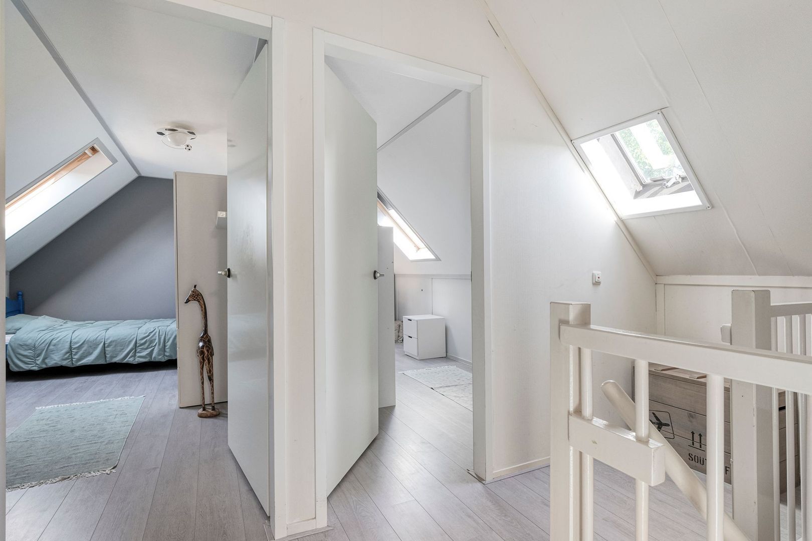 Alle slaapkamers zijn voorzien van een nette laminaatvloer, terwijl de overloop een warme en rustige uitstraling heeft door de vloerbedekking en het zijgevelraam dat extra licht binnenlaat.