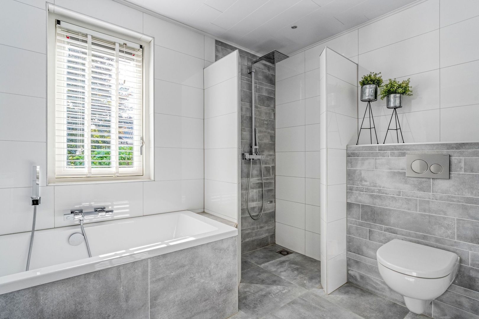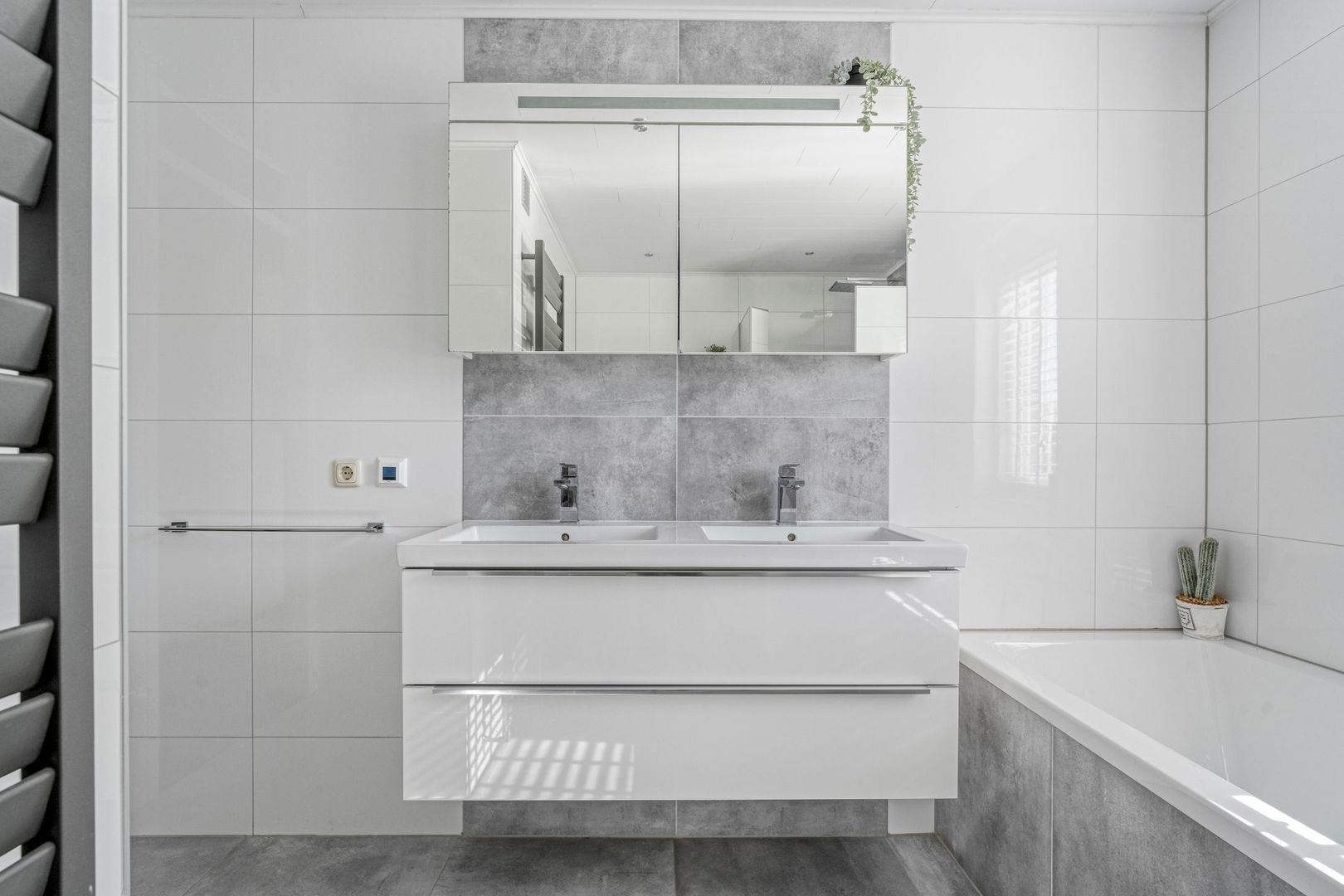 De badkamer is een waar hoogtepunt van deze verdieping. In 2018 volledig vernieuwd en voorzien van moderne luxe. U beschikt hier over een ruime inloopdouche, een stijlvol ligbad, een hangtoilet en een dubbele wastafel met meubel. De designradiator, vloerverwarming en ingebouwde plafondspots zorgen voor extra comfort. Dankzij het grote raam met ventilatierooster wordt de ruimte bovendien optimaal geventileerd. Dit is een badkamer die niet alleen praktisch, maar ook uitnodigend en ontspannen aanvoelt.