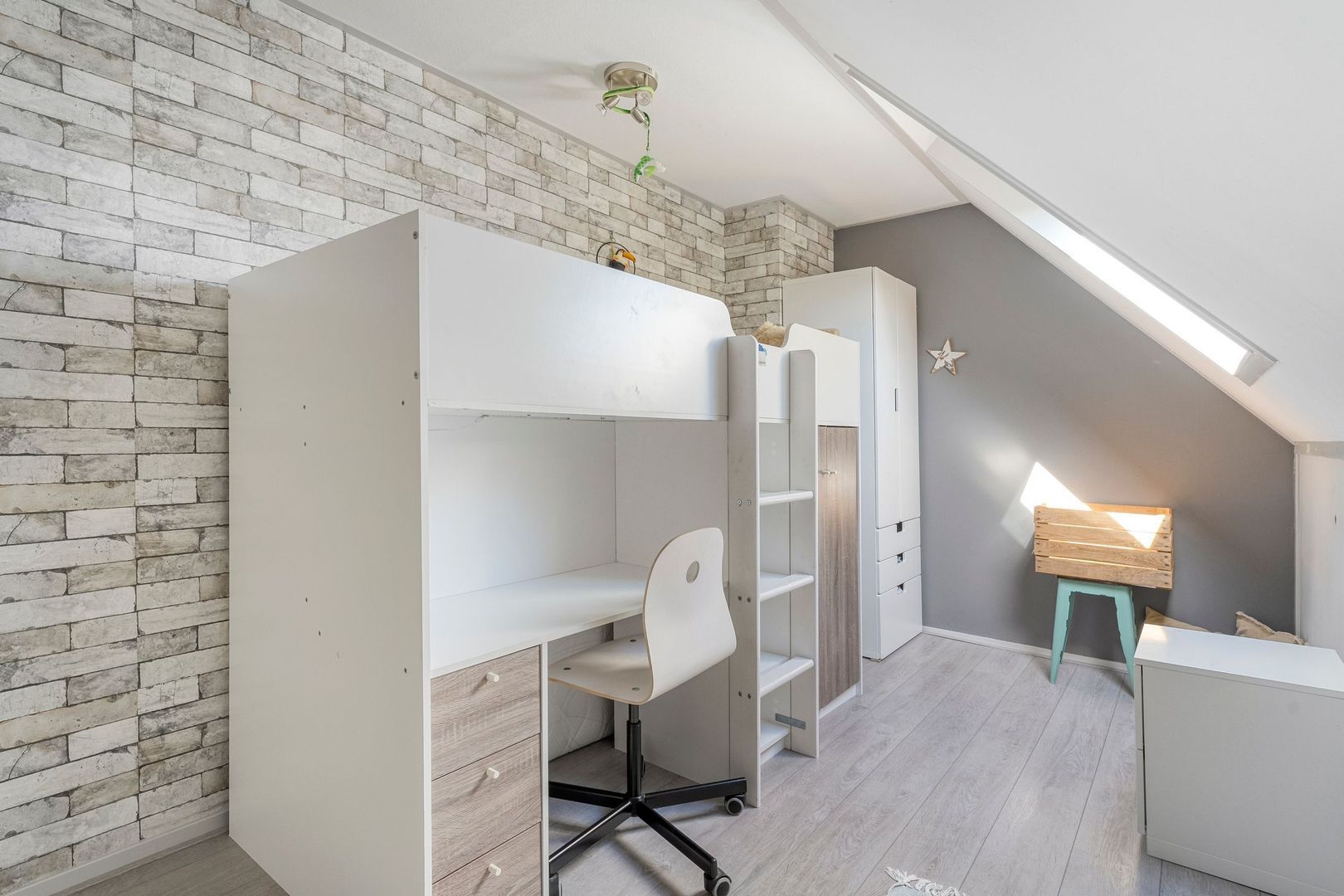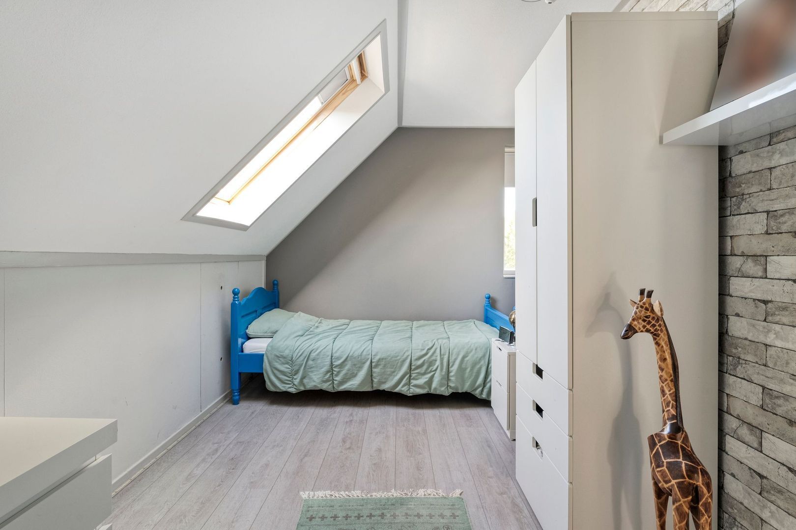 De tweede slaapkamer boven is eveneens groot van formaat en beschikt naast een dakraam ook over een extra kopgevelraam. Hierdoor valt er bijzonder veel daglicht binnen, wat de kamer een prettige en open uitstraling geeft. Ook hier vindt u bergruimte achter de knieschotten, wat de ruimte praktisch maakt zonder af te doen aan het comfort.