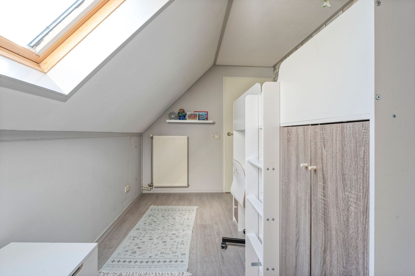 Verder biedt deze verdieping nog twee ruime slaapkamers. De eerste slaapkamer boven is een royale kamer met een dakraam, radiator en volop bergruimte achter de knieschotten. De kamer voelt ruim en licht aan en is uitstekend te gebruiken als slaapkamer, logeerkamer of kantoor.
