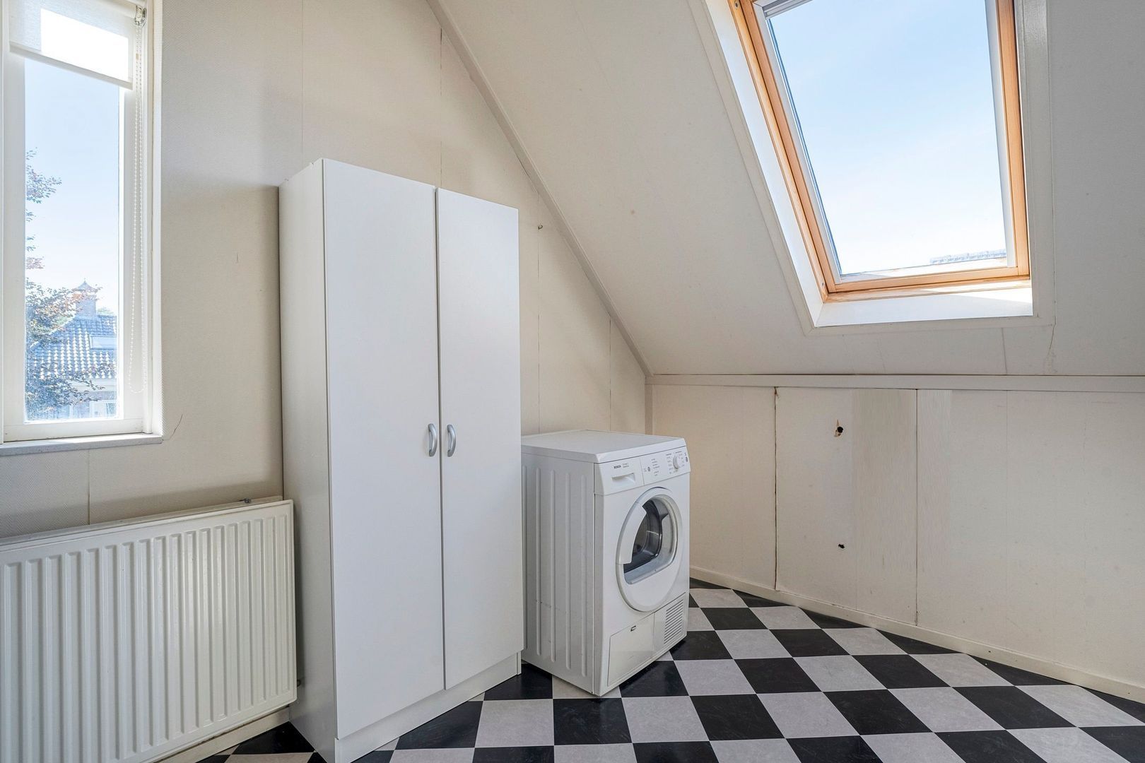 Aan de achterzijde van de woning vindt u een aparte was- en technische ruimte. Hier zijn de aansluitingen voor wasmachine en droger aanwezig, samen met de installaties voor de woning. Dankzij het kopgevelraam en het extra dakraam is dit een lichte en frisse ruimte, wat het dagelijkse gebruik extra comfortabel maakt.