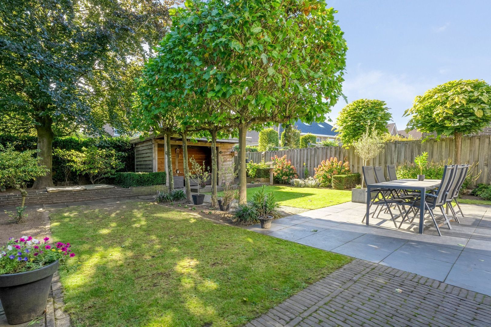 Deze tuin combineert ruimte, comfort, sfeer en vormt zo een verlengstuk van de woning: een plek waar u iedere dag opnieuw kunt genieten van rust, privacy en het buitenleven.