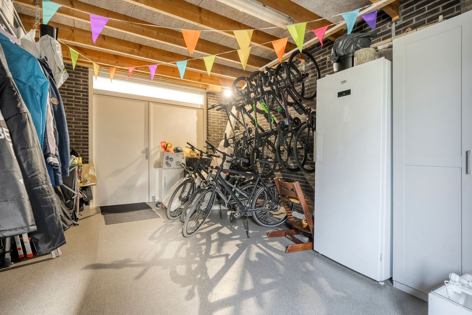 Naast de keuken bevindt zich de praktische bijkeuken. Deze ruimte is voorzien van een schuifkastenwand, aansluitingen voor wasmachine en droger en een spoelbak. Dankzij het openslaande raam is de ruimte niet alleen functioneel, maar ook licht en fris. Vanuit hier bereikt u de ruime garage, die veel extra bergruimte biedt en een directe doorgang heeft naar de achtertuin. De garage leent zich uitstekend voor het stallen van fietsen of het uitoefenen van een hobby, en door de royale afmetingen houdt u daarnaast voldoende plek over voor opslag.