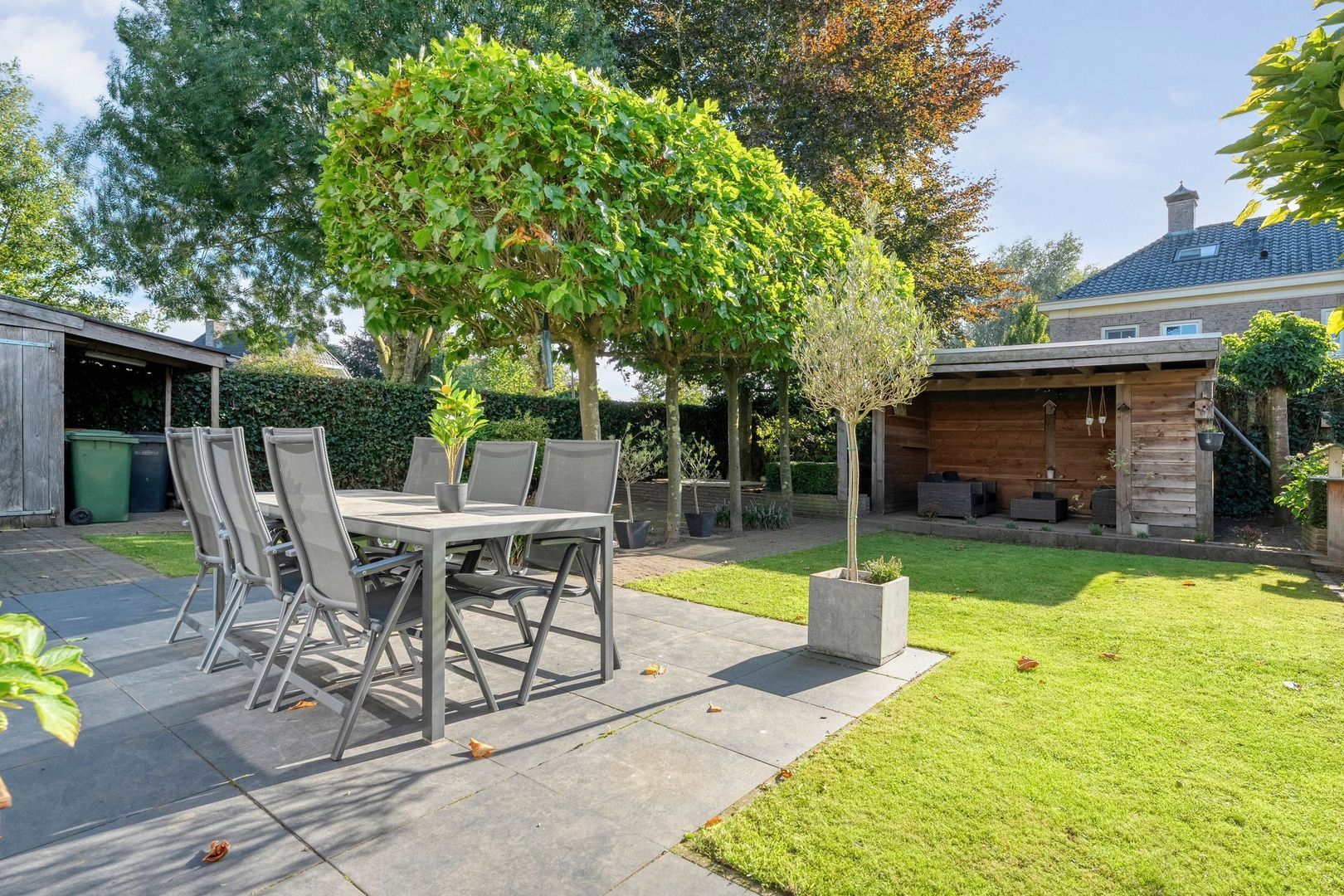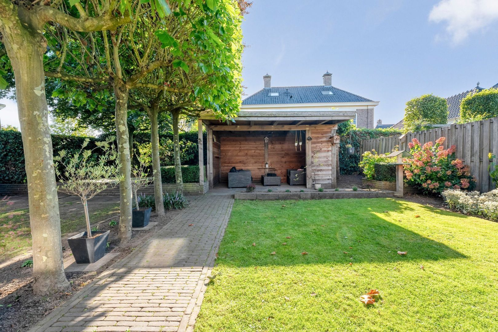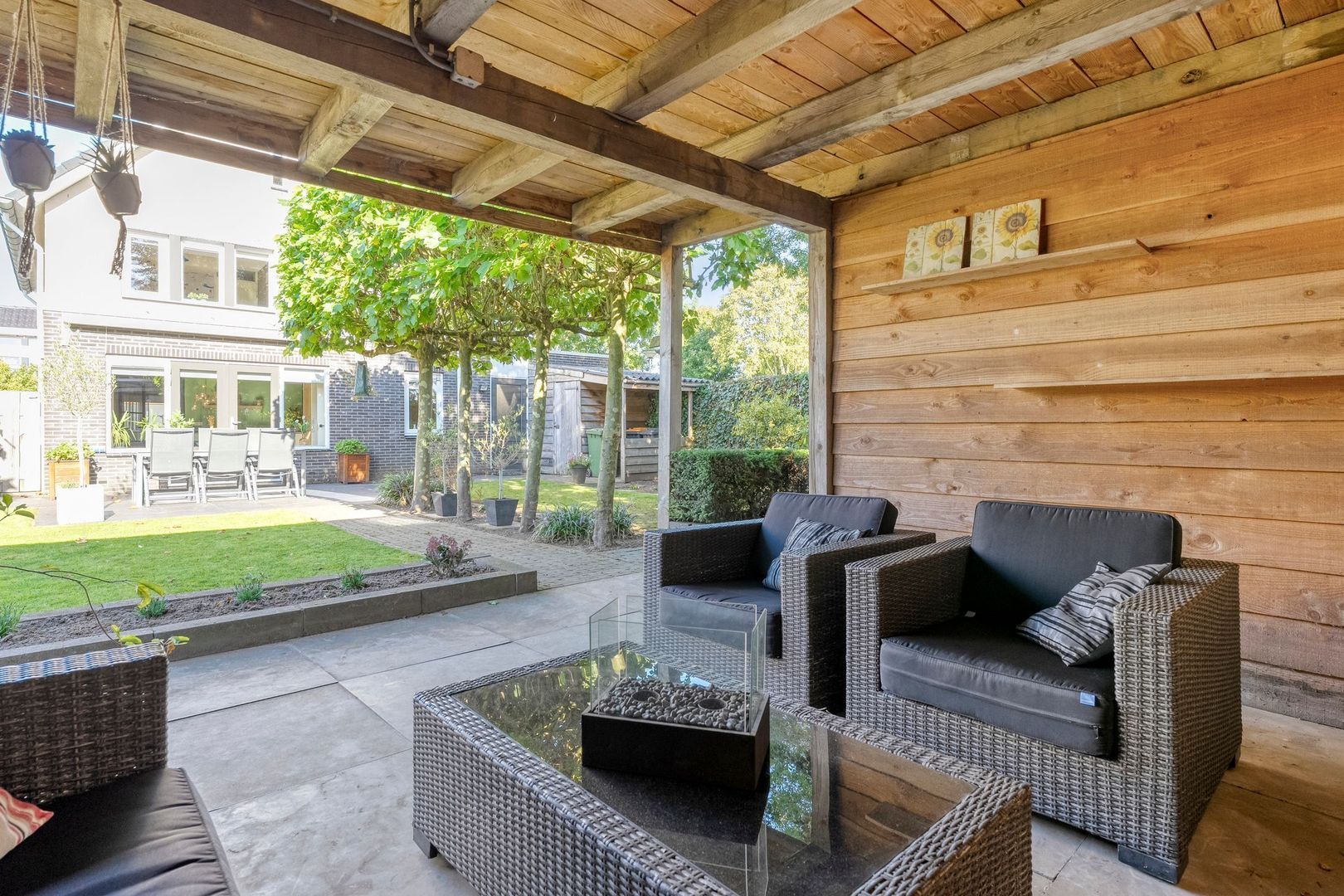 Achter in de tuin staat een stijlvolle Douglas overkapping die uitnodigt om ook bij minder mooi weer of op koele avonden buiten te zitten. Deze plek is ideaal om met familie of vrienden samen te komen en het hele jaar door te genieten van het buitenleven.