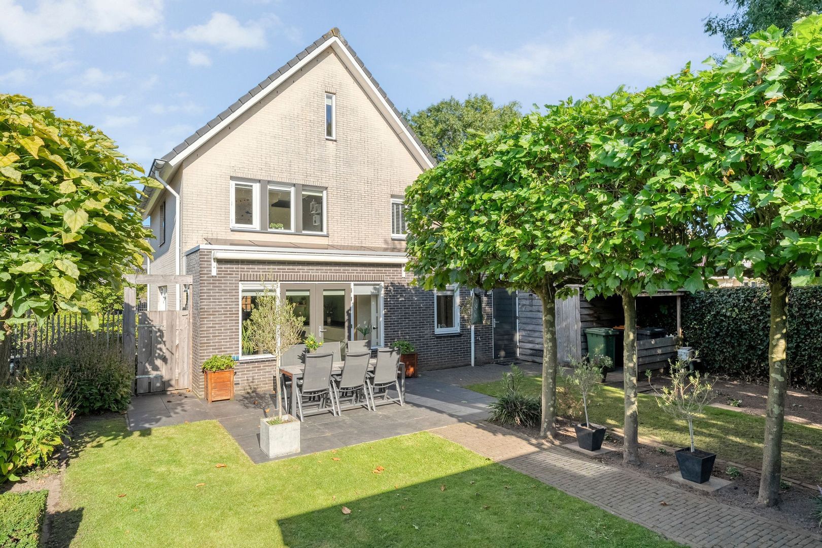 De achtertuin van Erve Harbers 14 is een heerlijke plek om tot rust te komen. Dankzij de gunstige ligging op het zuidwesten geniet u hier van de middag- en avondzon ideaal voor lange zomerdagen en gezellige avonden buiten. Direct aan de woning vindt u een ruim terras met keramische tegels, perfect voor een grote lounge- of eethoek. Voor de warmere dagen is er een elektrisch zonnescherm, waarmee u eenvoudig een schaduwrijke plek creëert.