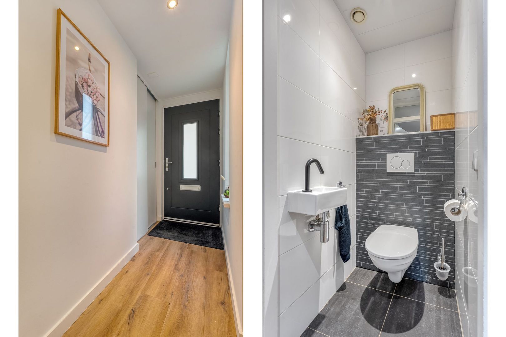 Het toilet is modern uitgevoerd met een fontein en een handige nis, afgewerkt in neutrale tinten die goed aansluiten bij de rest van de woning. Een radiator en kruipluik bij de voordeur maken het geheel compleet en functioneel.