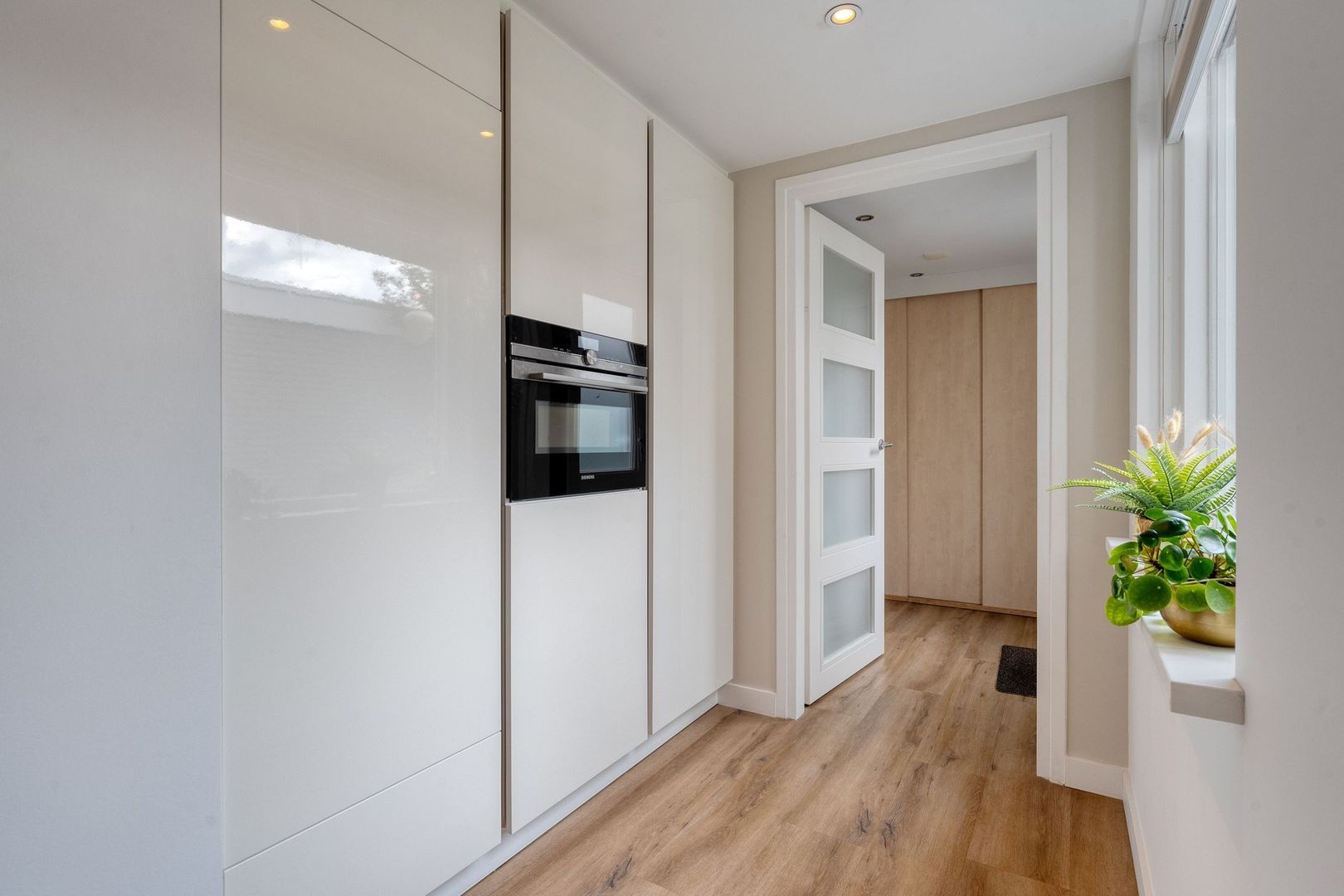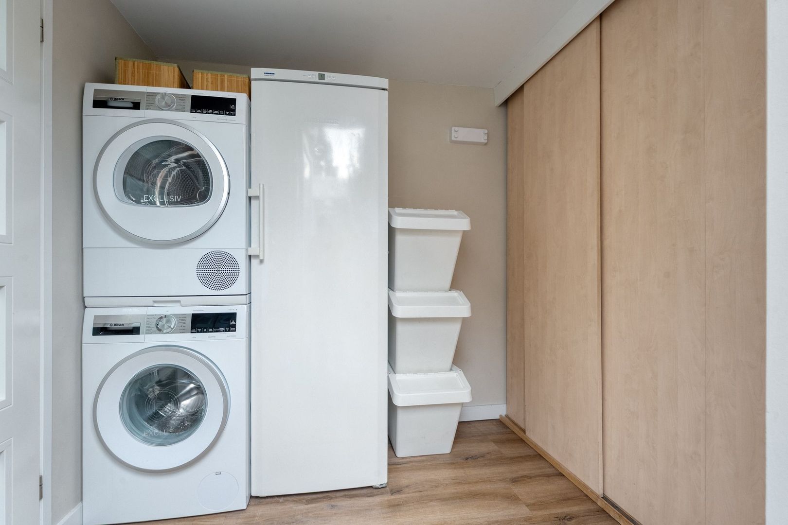 Aan de achterzijde bevindt zich de bijkeuken, voorzien van vloerverwarming, wasmachine- en drogeraansluiting, een vriezer en een schuifkastenwand met garderoberuimte. Dankzij de na-isolatie en nette afwerking vormt deze ruimte een waardevolle aanvulling op het wooncomfort. Vanuit hier is er tevens directe toegang tot de tuin, waardoor binnen en buiten op een natuurlijke manier met elkaar verbonden zijn.