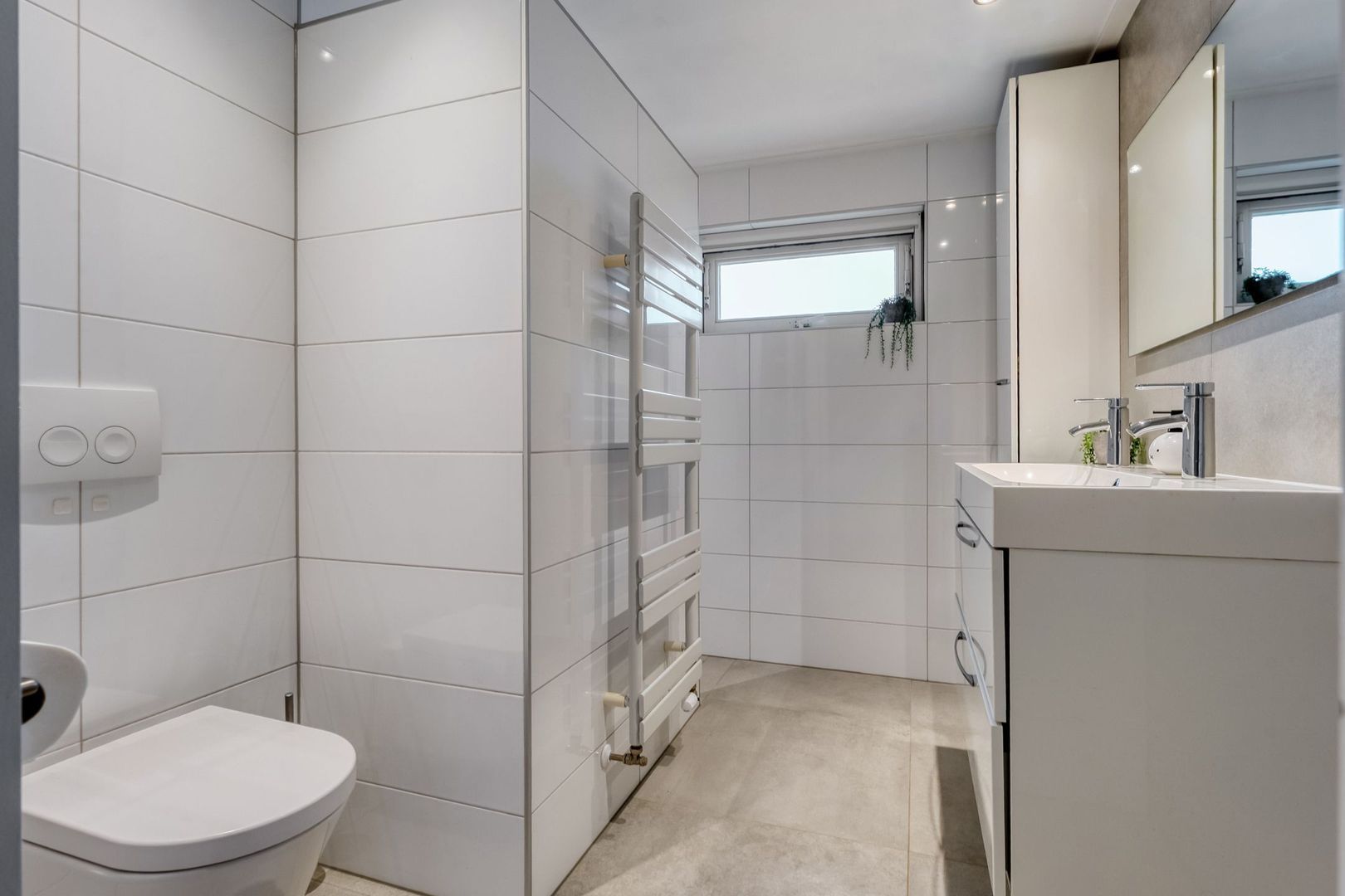 De badkamer is smaakvol en praktisch ingericht met een inloopdouche, hangtoilet en dubbel wastafelmeubel. De neutrale kleuren, inbouwspots en designradiator zorgen voor een moderne uitstraling, terwijl vloerverwarming (op de retourleiding) en mechanische ventilatie bijdragen aan optimaal comfort.
