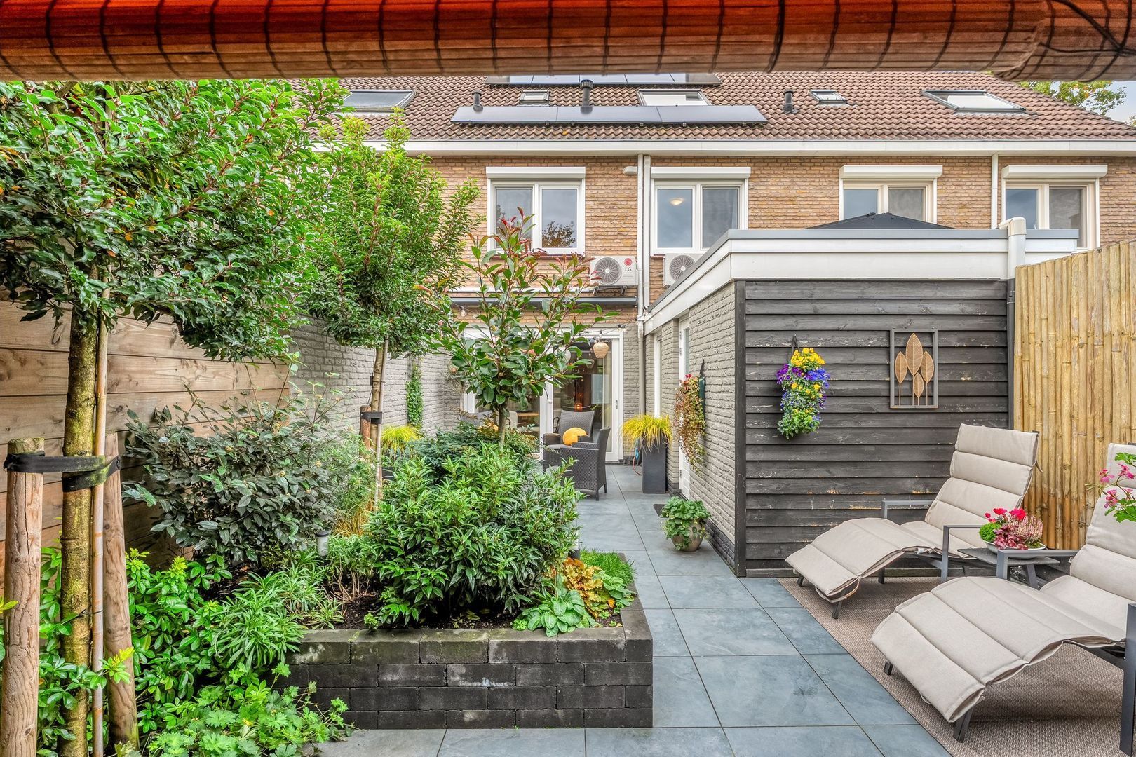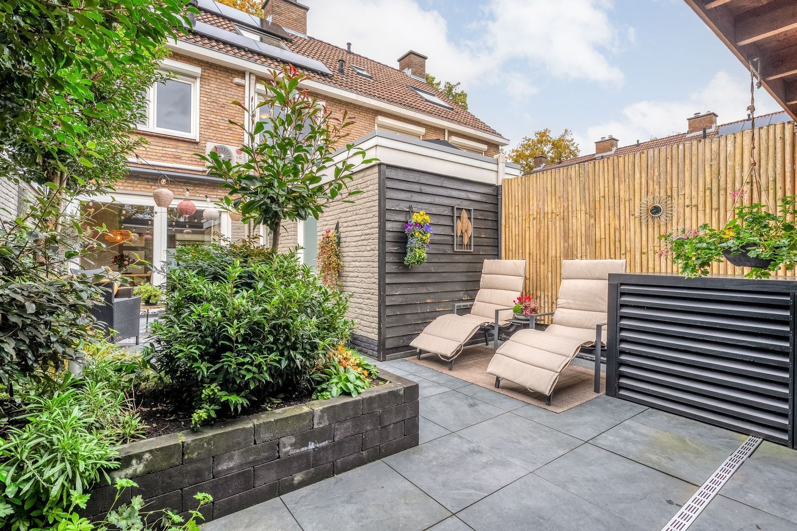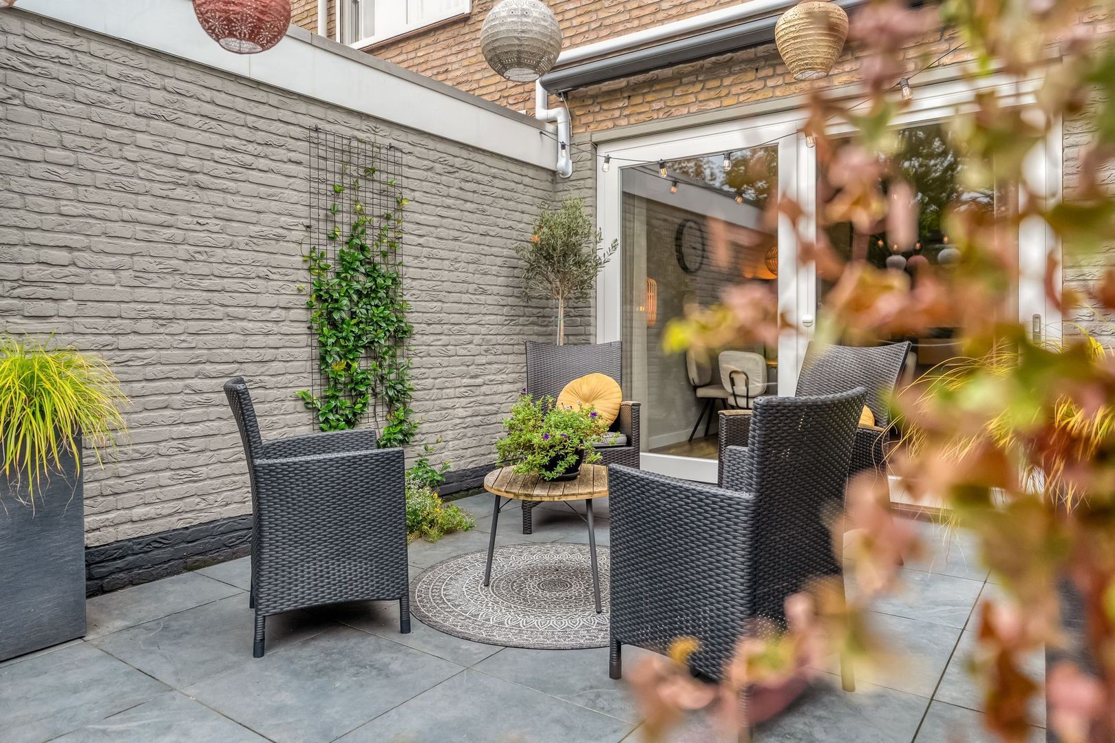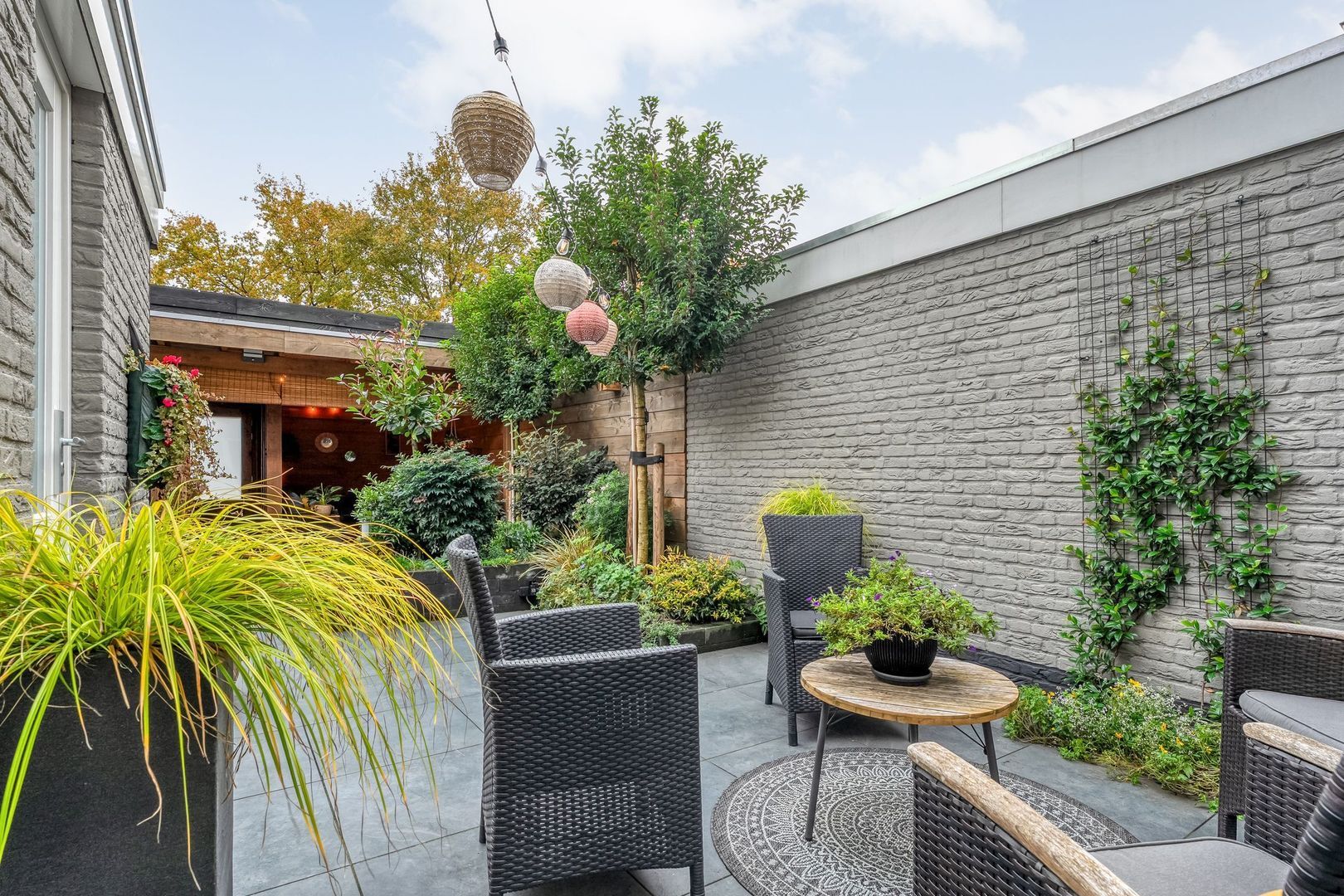 De tuin is bereikbaar via een achterpad en heeft een praktische indeling met ruimte voor een eettafel, loungehoek en speelruimte. De volwassen begroeing en onderhoudsvriendelijke aanleg zorgen voor een groene, maar toch strakke uitstraling. Dit is een buitenruimte waar je direct van kunt genieten.