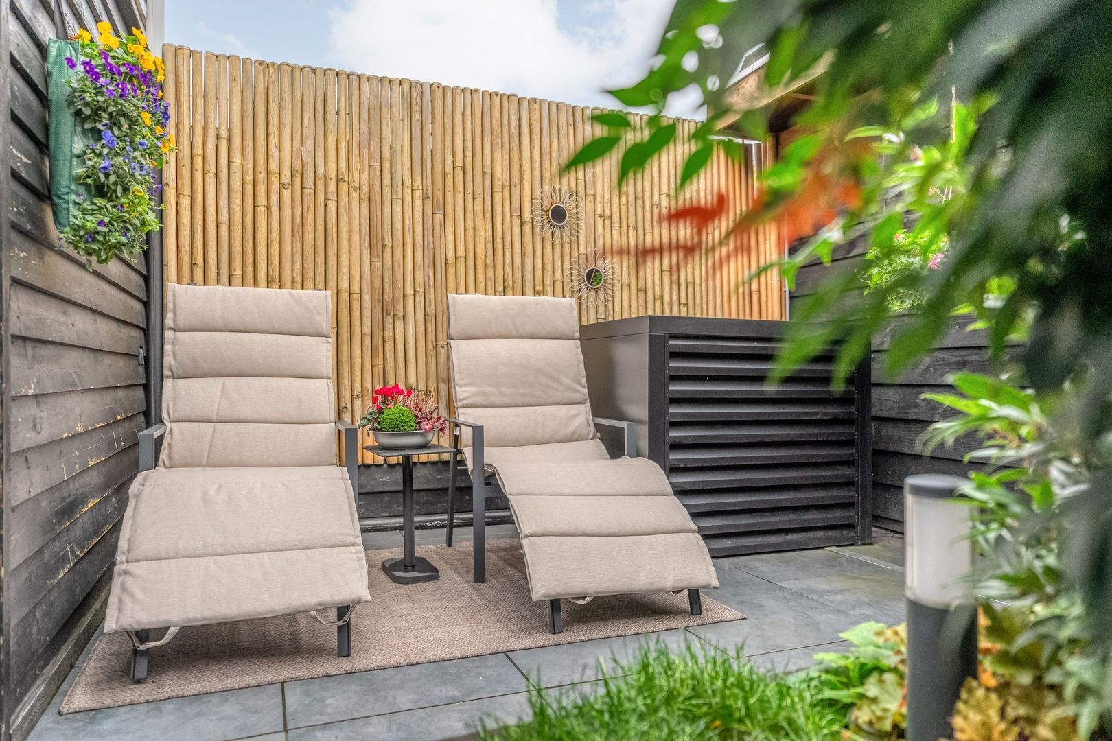 De tuin is in 2023 volledig opnieuw aangelegd en vormt de heerlijke onderhoudsvriendelijke buitenruimte waar privacy én comfort centraal staan. Dankzij de ligging en volwassen beplanting geniet je hier van veel beschutting. De bestrating is keurig aangelegd en de tuin is voorzien van een elektrisch uitvalscherm, buitenverlichting, buitenkraan en draingoot.