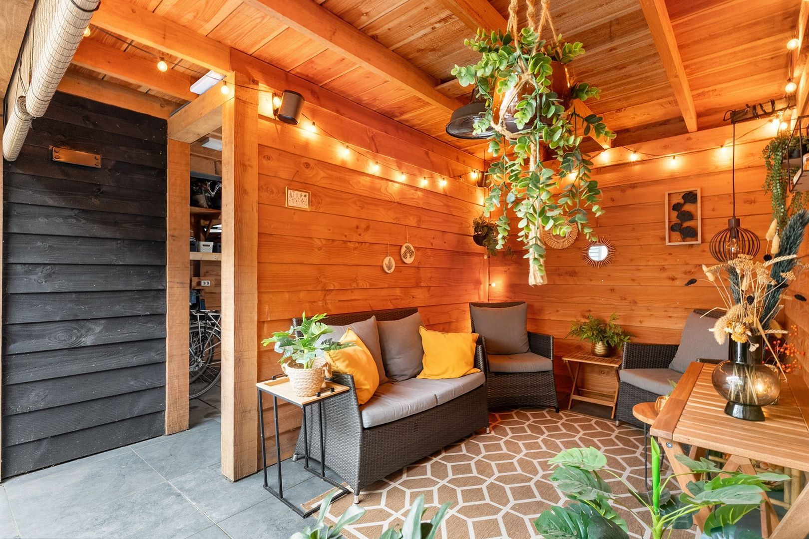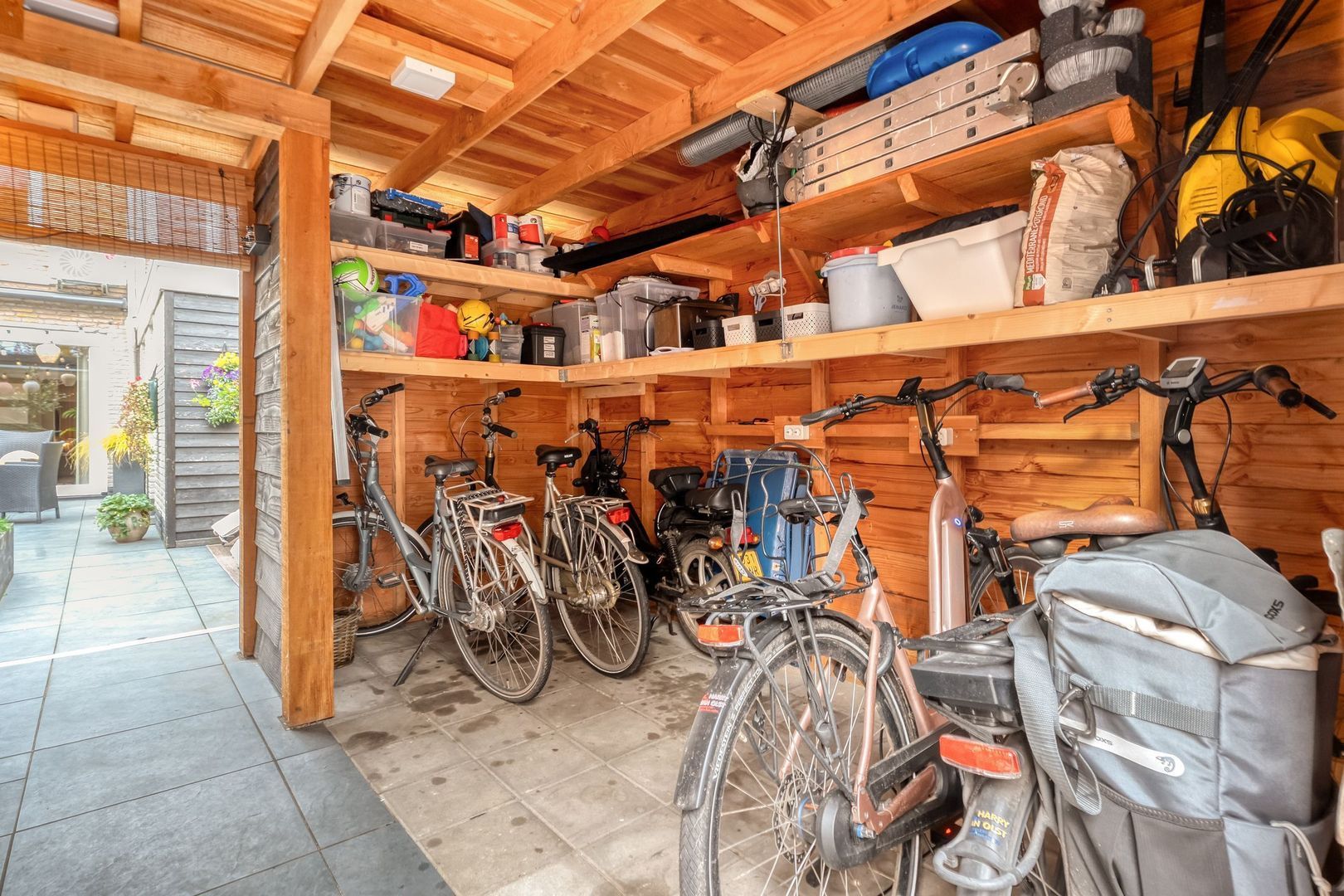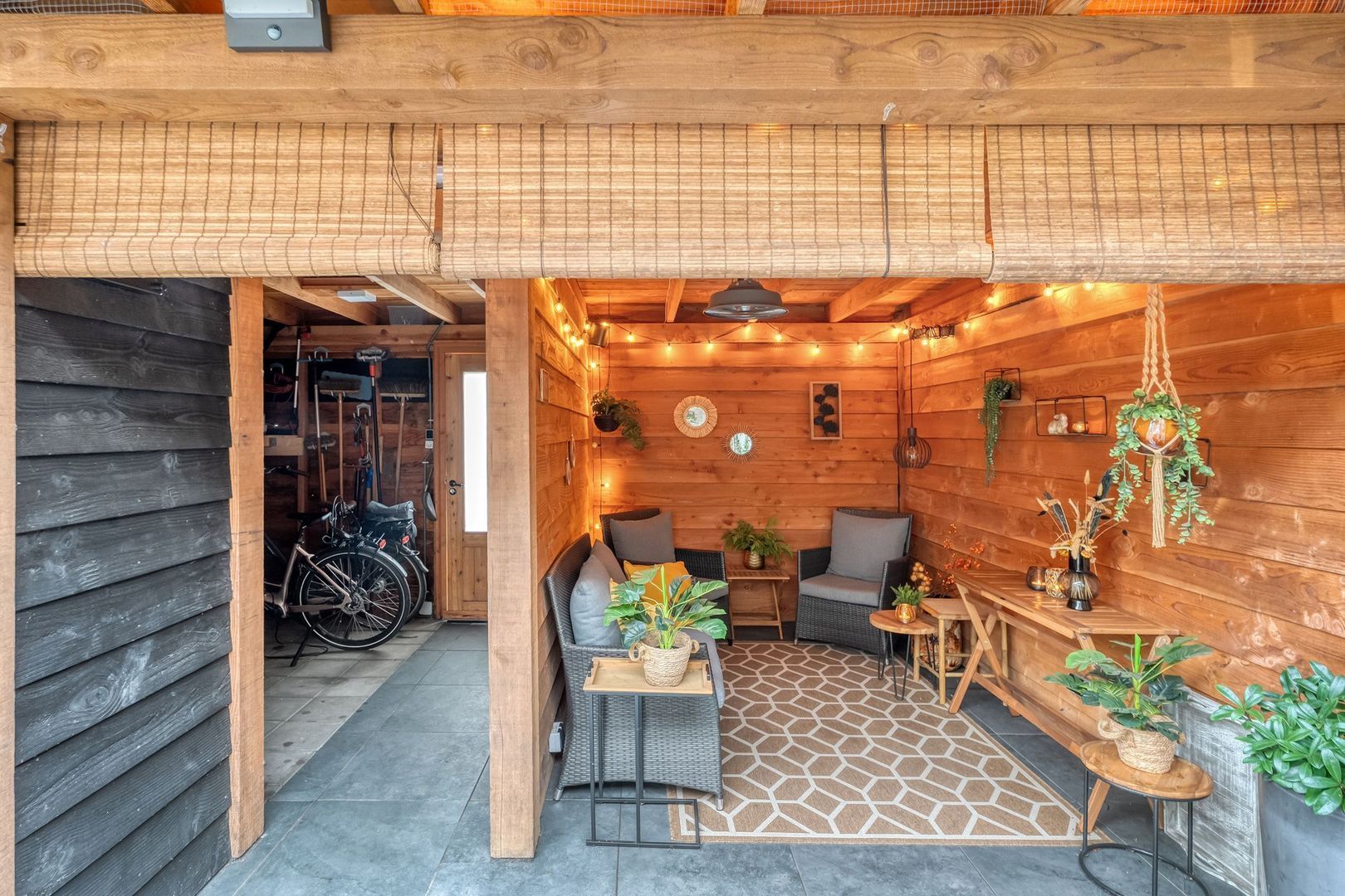 Aan de achterzijde bevindt zich een sfeervolle Douglas-overkapping (2019), de ideale plek om tot in de late uurtjes van het buitenleven te genieten. Aangrenzend bevindt zich een praktische berging, perfect voor het netjes opbergen van fietsen en tuingereedschap. De buiten unit van de warmtepomp (2022) is netjes weggewerkt, zodat het geheel een verzorgde en rustige uitstraling behoudt.