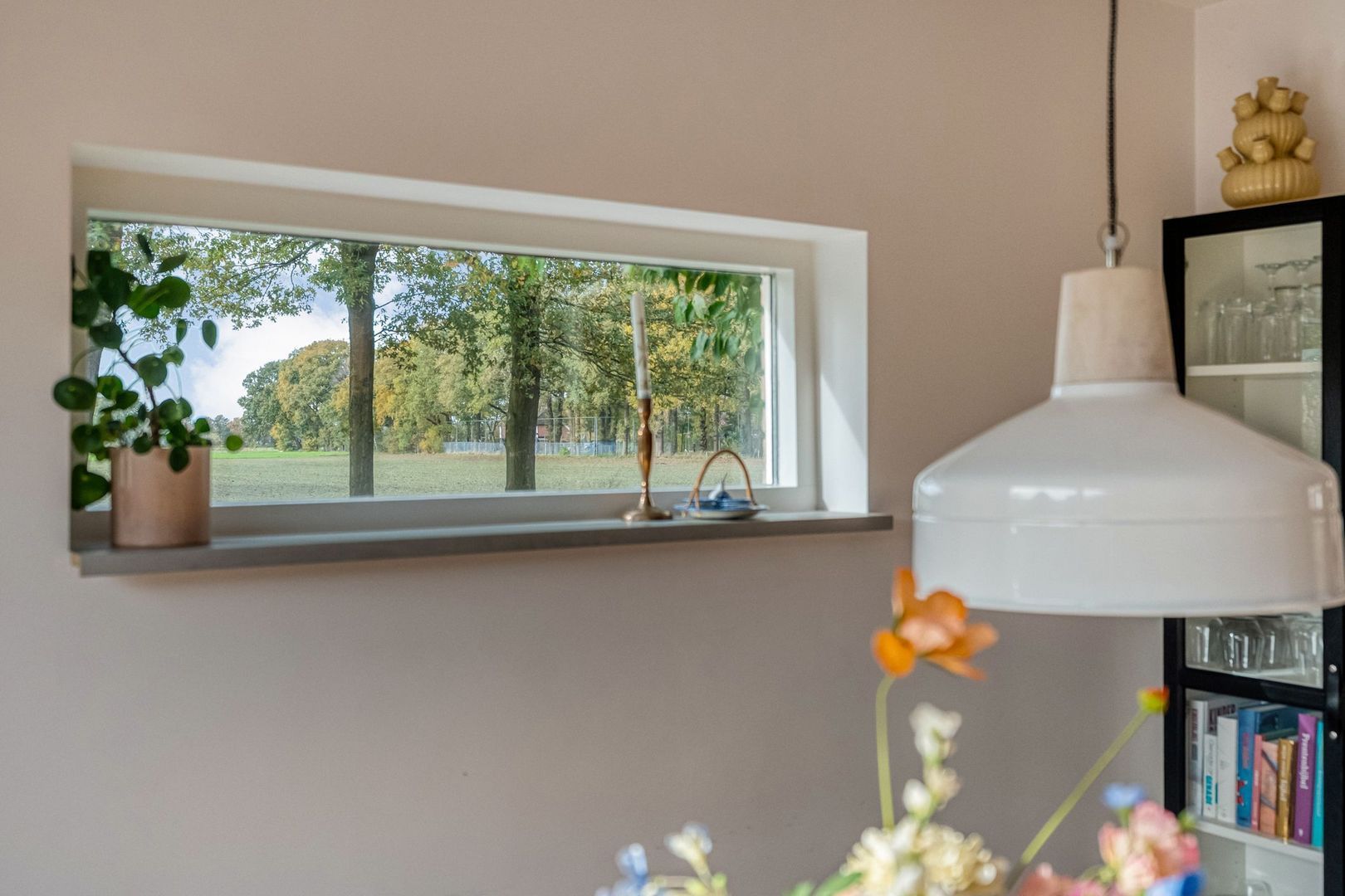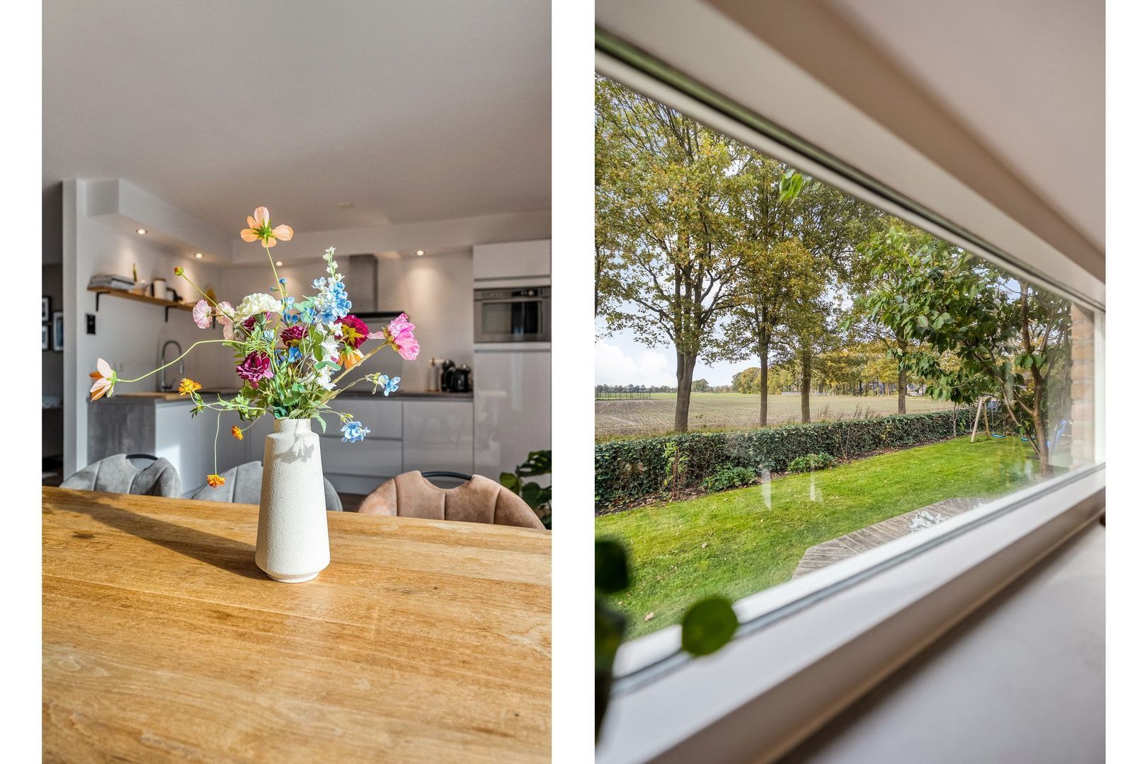De schuifpui verbindt de keuken met het buitenterras en laat veel daglicht binnen, waardoor het binnen- en buitenleven naadloos in elkaar overlopen. Vanuit de keuken heeft u bovendien een fraai uitzicht op de tuin en het omliggende groen.