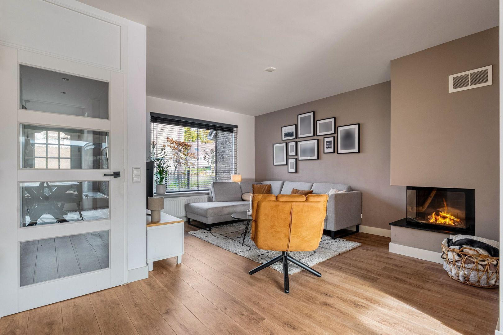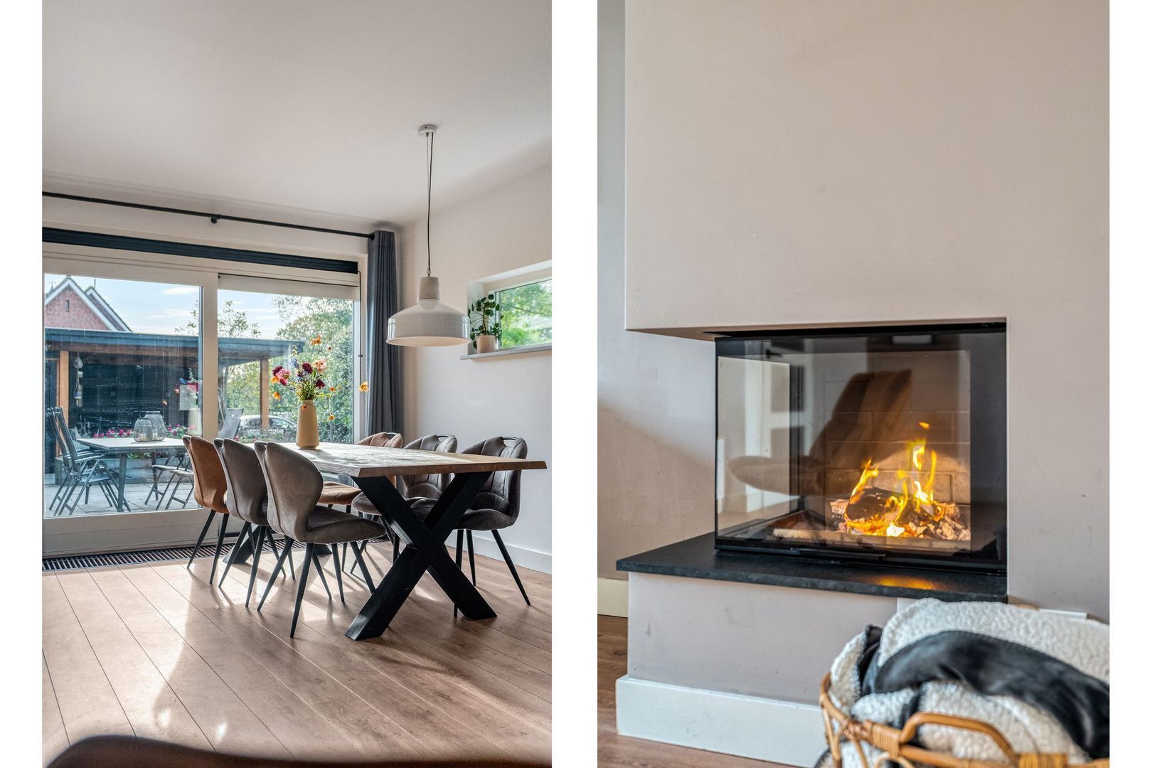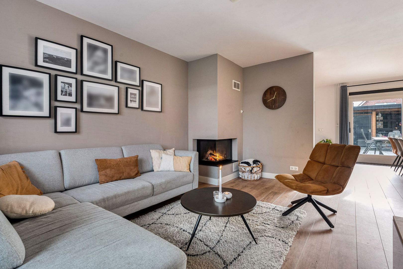 De woonkamer biedt plek voor een royale zithoek. De houtkachel zorgt voor extra sfeer en warmte tijdens de koudere maanden, een echte eyecatcher die de ruimte een huiselijke ambiance geeft. De wanden en plafonds zijn strak gestuct, wat de moderne uitstraling versterkt. Daarnaast is er een praktische trapkast die extra opbergruimte biedt.
