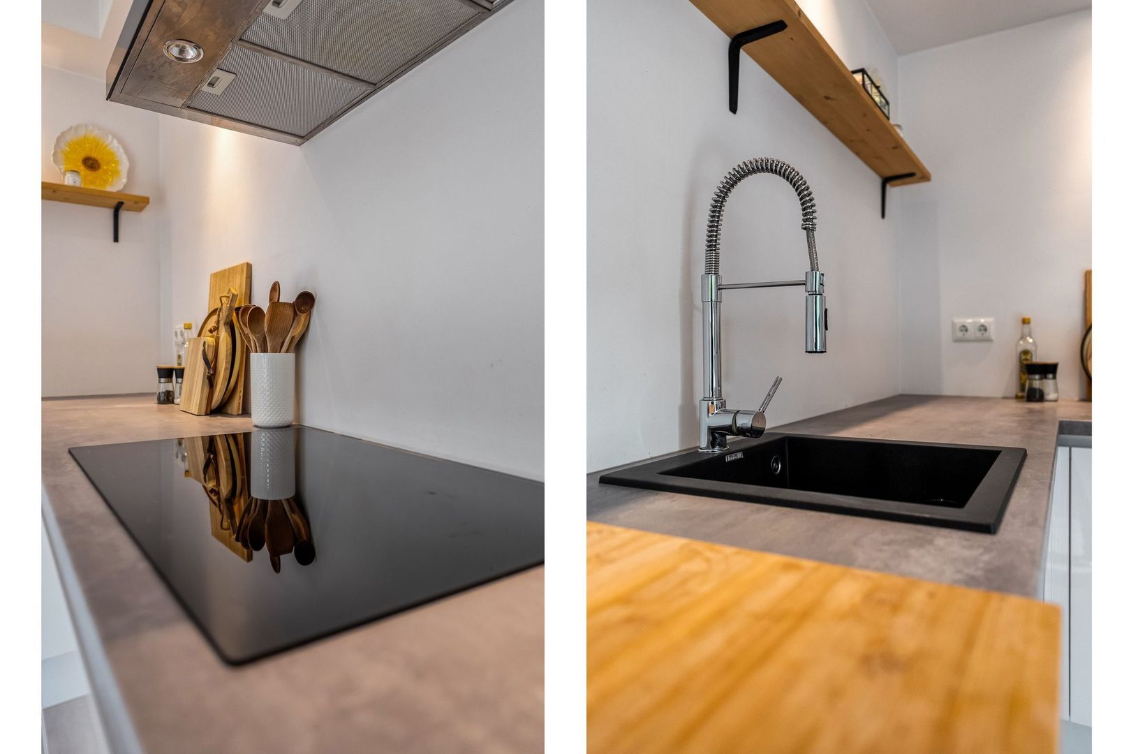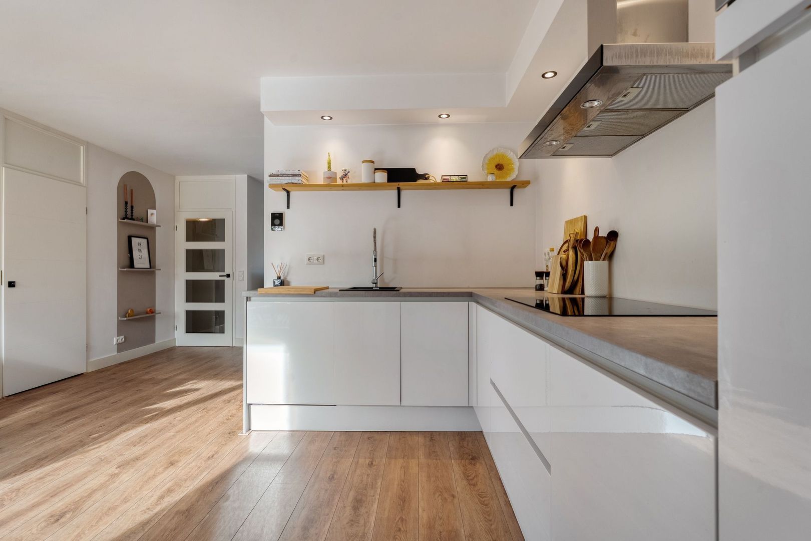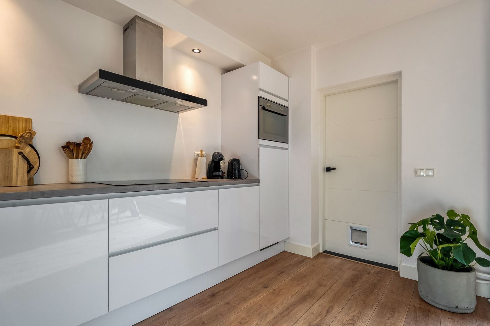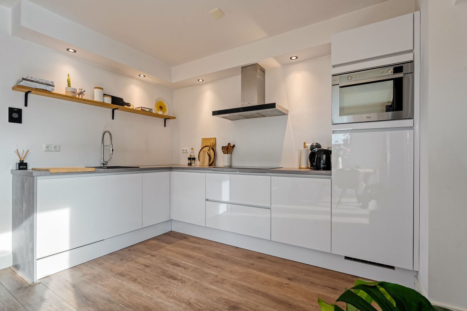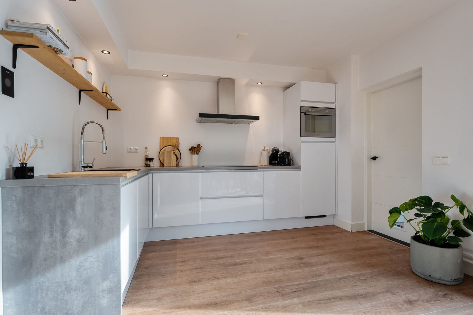 Aan de achterzijde bevindt zich de open keuken, die in 2018 volledig is vernieuwd. De keuken heeft een neutrale, tijdloze uitstraling en is van alle gemakken voorzien: een inductiekookplaat, combimagnetron-oven, vaatwasser (vernieuwd in 2024) en ruime opbergkasten.