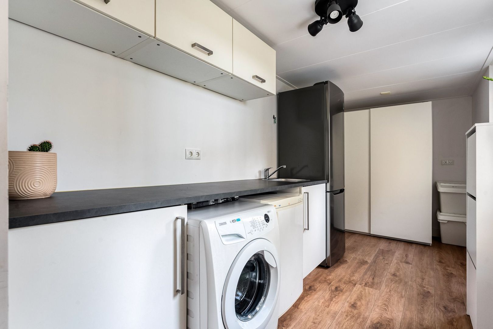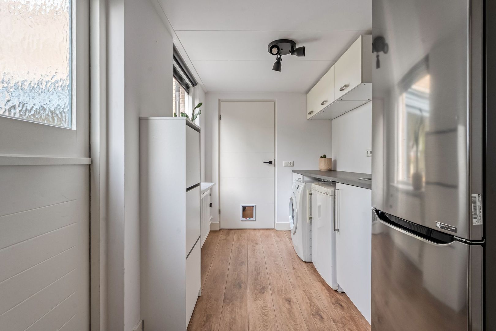 Aangrenzend vindt u de praktische bijkeuken, voorzien van een spoelbak, aansluitingen voor wasmachine en droger, een extra vriezer en een grote schuifkast voor opbergruimte. Via de achterdeur heeft u directe toegang tot de tuin.