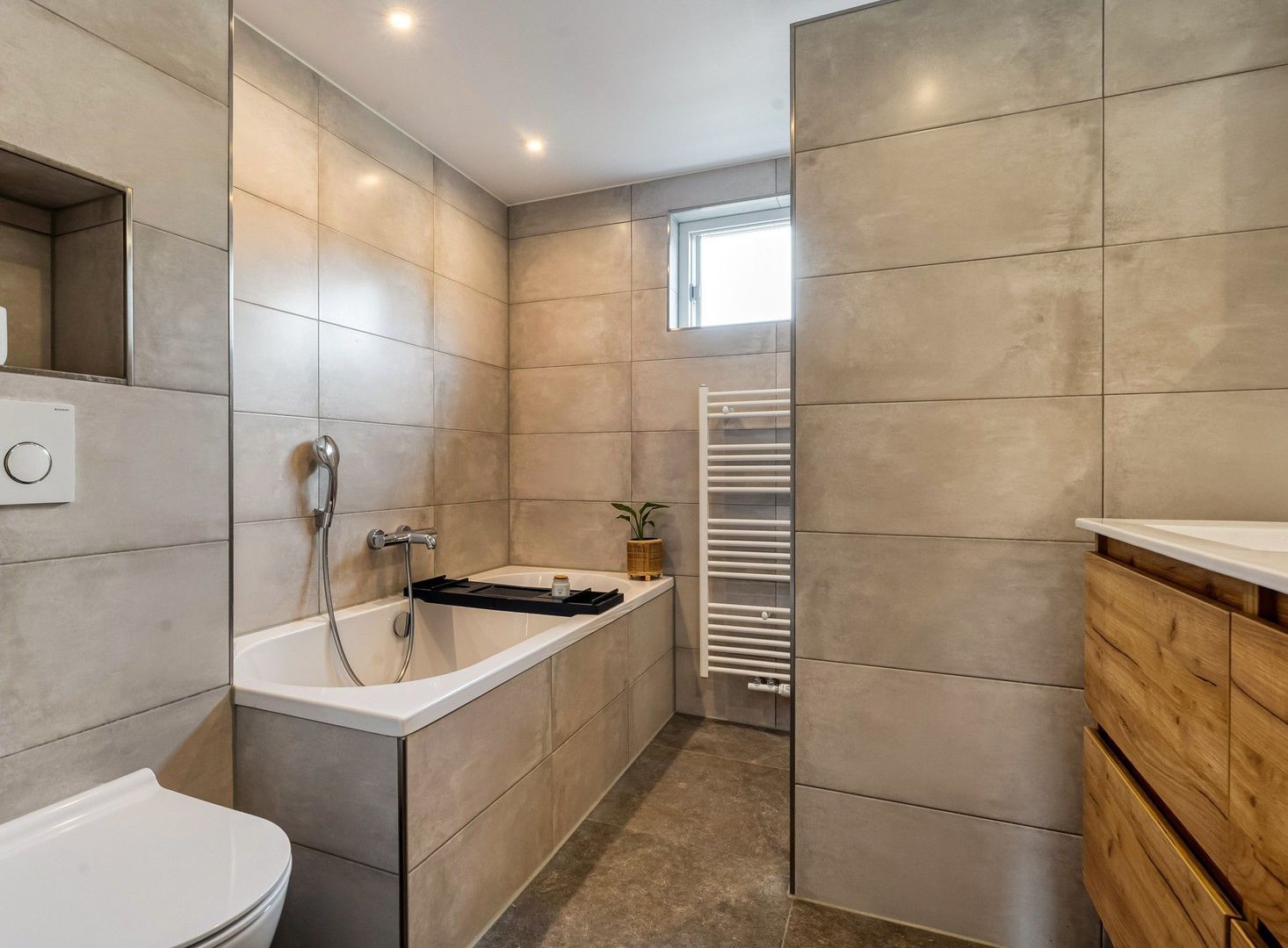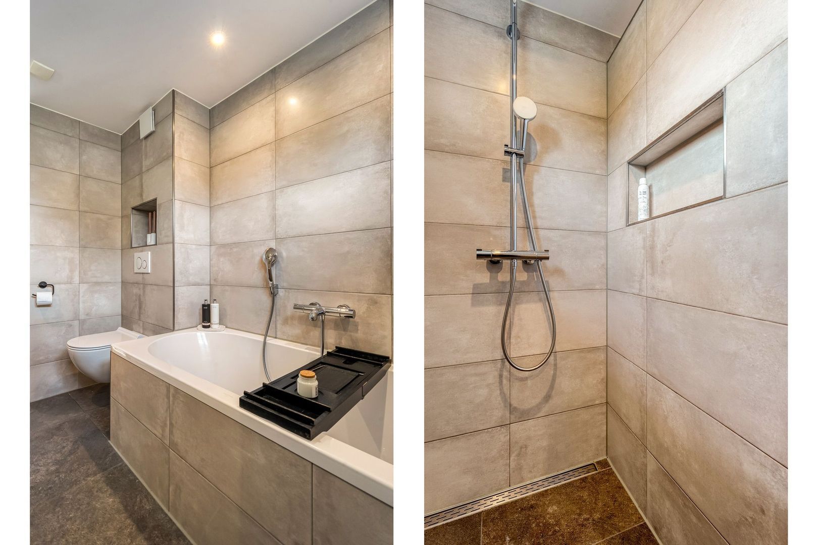 De badkamer op deze verdieping is stijlvol en modern uitgevoerd. De neutrale kleurstelling en hoogwaardige afwerking creëren een rustige, luxe sfeer. De ruimte is voorzien van een dubbele wastafel met meubel, een hangtoilet met handige nis, een ligbad, een ruime inloopdouche met draingoot en designradiator. Dankzij de vloerverwarming op de retourleiding en de inbouwspots is comfort hier tot in detail doorgevoerd. De badkamer ventilator zorgt bovendien voor een aangenaam binnenklimaat.