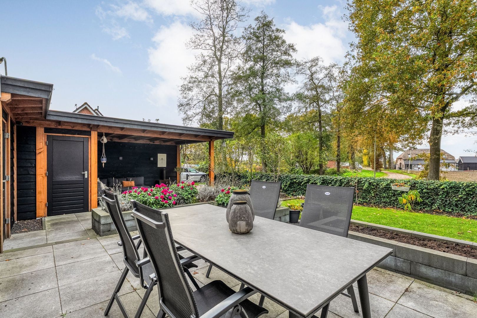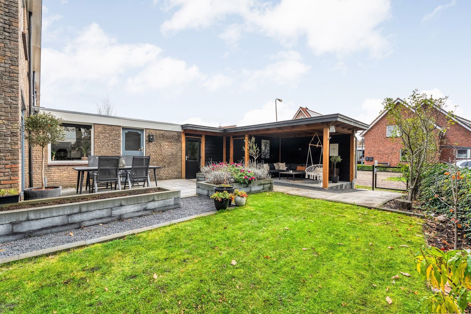 Grenzend aan de woning bevinden zich twee ruime bergingen, beide voorzien van elektra en één uitgerust met een grondwaterpomp. Achter de bergingen sluit een Douglas overkapping aan, een heerlijke plek om beschut van de tuin te genieten. Naast de overkapping is een aparte entree naar de tuin. Achter de overkapping bevindt zich bovendien een parkeerplek op eigen terrein, ideaal voor gemak en toegankelijkheid.