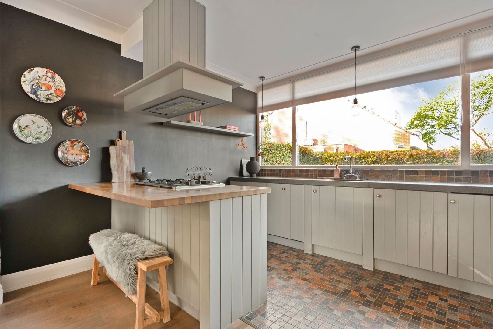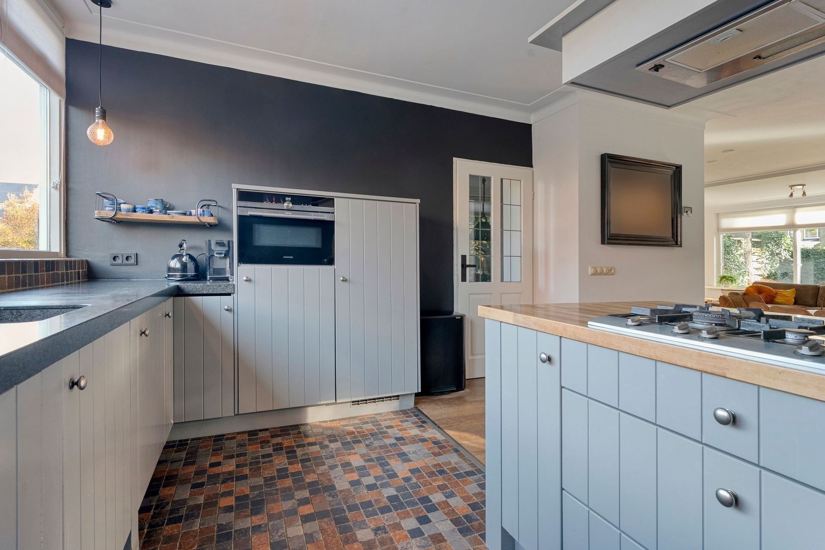 De open keuken vormt een harmonieus geheel met de woonkamer en is een ware blikvanger. De opstelling met schiereiland biedt volop werkruimte en is voorzien van diverse inbouwapparatuur, waaronder een 5-pits gasfornuis en een combi-oven. De praktische baropstelling maakt het een uitnodigende plek om aan te schuiven voor een ontbijt of een kop koffie.