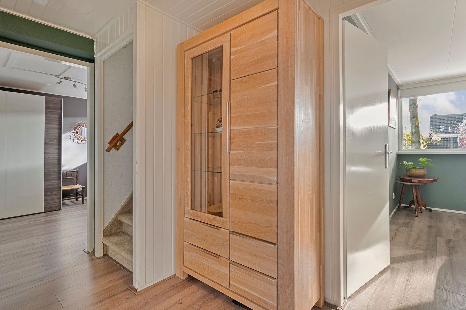 Bij binnenkomst via de hoofdentree betreed je een nette en overzichtelijke hal die direct de sfeer van de woning weergeeft: licht, verzorgd en praktisch ingedeeld. Hier bevinden zich een vaste trap naar de eerste verdieping, een modern hangtoilet met fontein en nis, een garderoberuimte, meterkast en radiator. Vanuit de hal is er toegang tot zowel de berging als de keuken. De ruimte is strak afgewerkt en heeft een prettige, eigentijdse uitstraling.