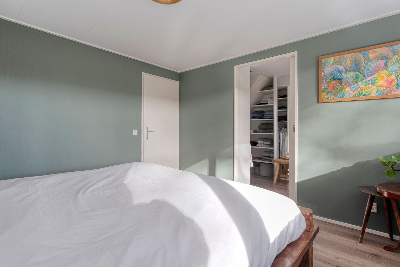 De masterbedroom aan de achterzijde is royaal en heeft veel lichtinval. De kamer beschikt over een ruime inloopkast met inbouwspots en een schuifdeur, wat zorgt voor extra comfort en een luxe uitstraling.