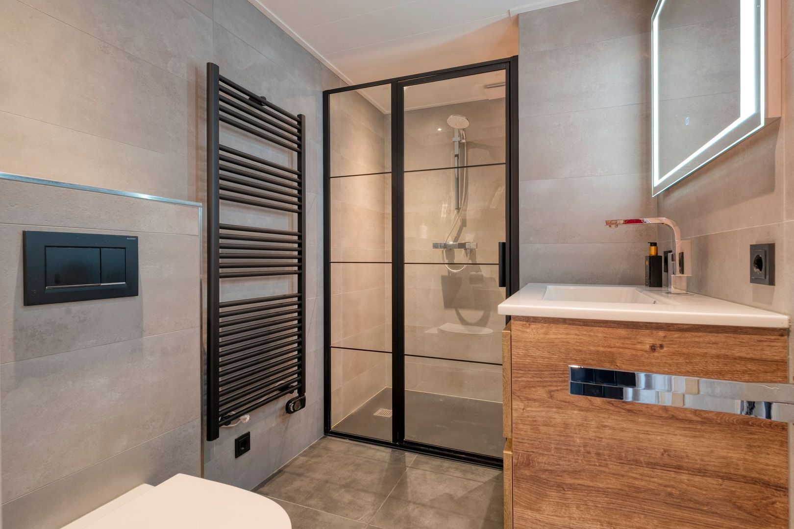 De badkamer is in 2020 volledig vernieuwd en straalt moderne luxe uit. De ruimte is uitgerust met een hangtoilet, wastafelmeubel, een afsluitbare inloopdouche met stijlvolle nisjes, en een elektrische designradiator. Daarnaast is er vloerverwarming (retourleiding) aanwezig voor extra comfort.