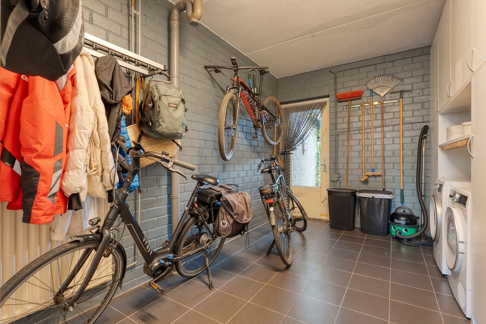 Aan de achterzijde van de woning bevindt zich tevens een praktische berging, bereikbaar via de tweede entree aan de voorzijde én vanuit de tuin. Deze is voorzien van een wasmachine- en drogeraansluiting, een grote kastenwand, garderoberuimte en voldoende plaats voor tuingereedschap of fietsen. De ruimte is netjes afgewerkt en uiterst functioneel ingericht.