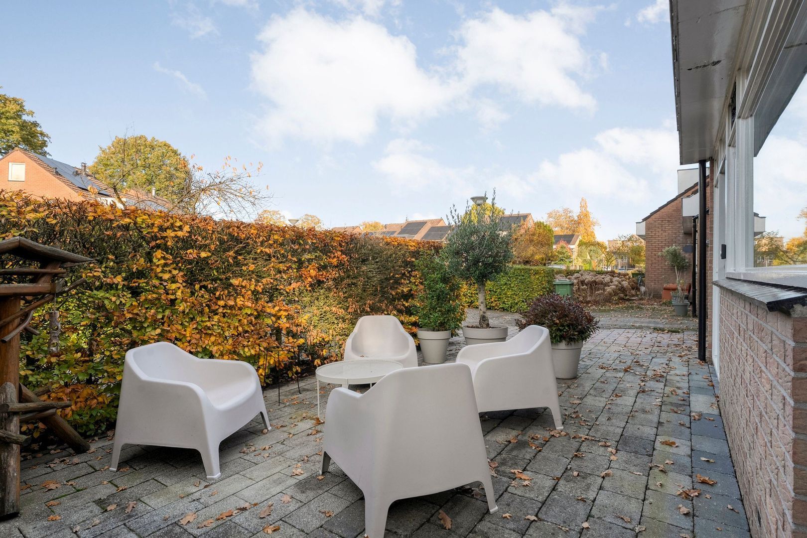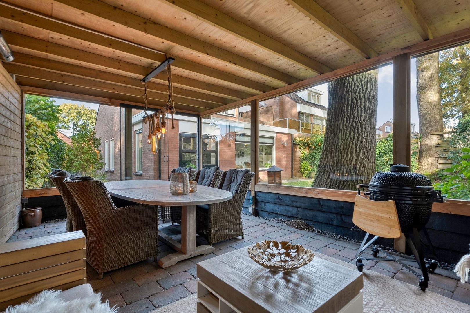De achtertuin is groen, beschut en keurig onderhouden. Dankzij de ruime overkapping met heater kun je hier het hele jaar door comfortabel zitten. De tuin biedt verschillende zitgedeeltes, veel privacy en is via een achterom aan het fietspad bereikbaar. Ideaal voor fietsen of tuinonderhoud.