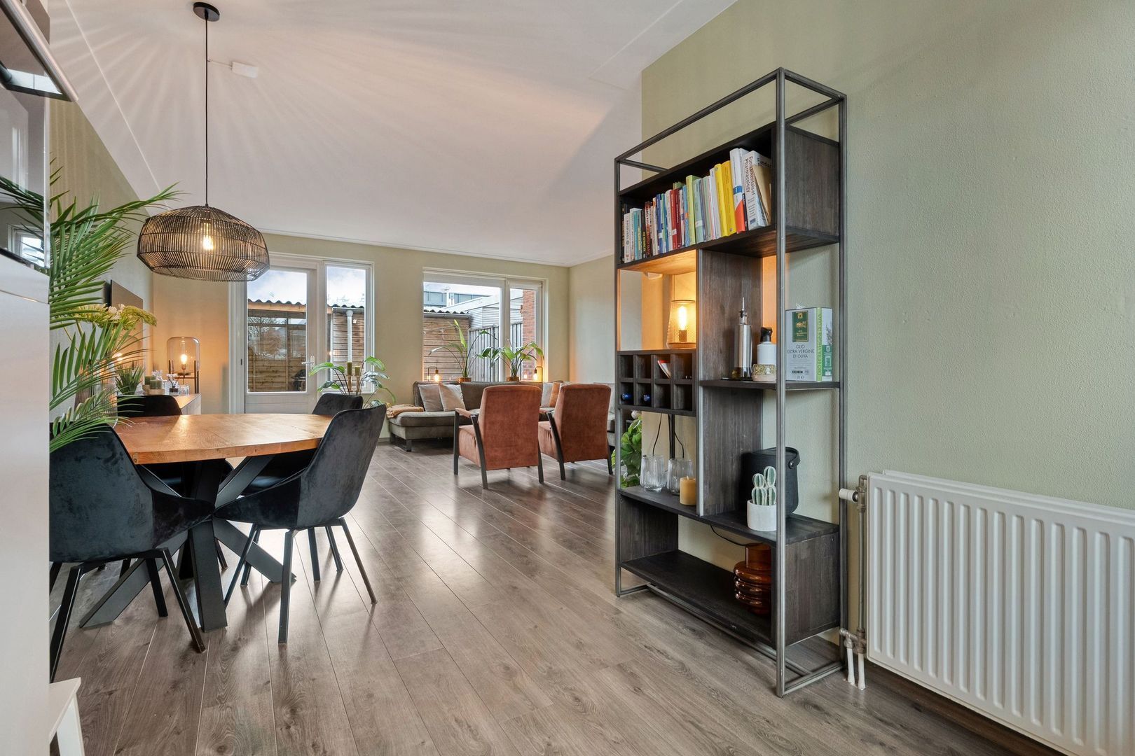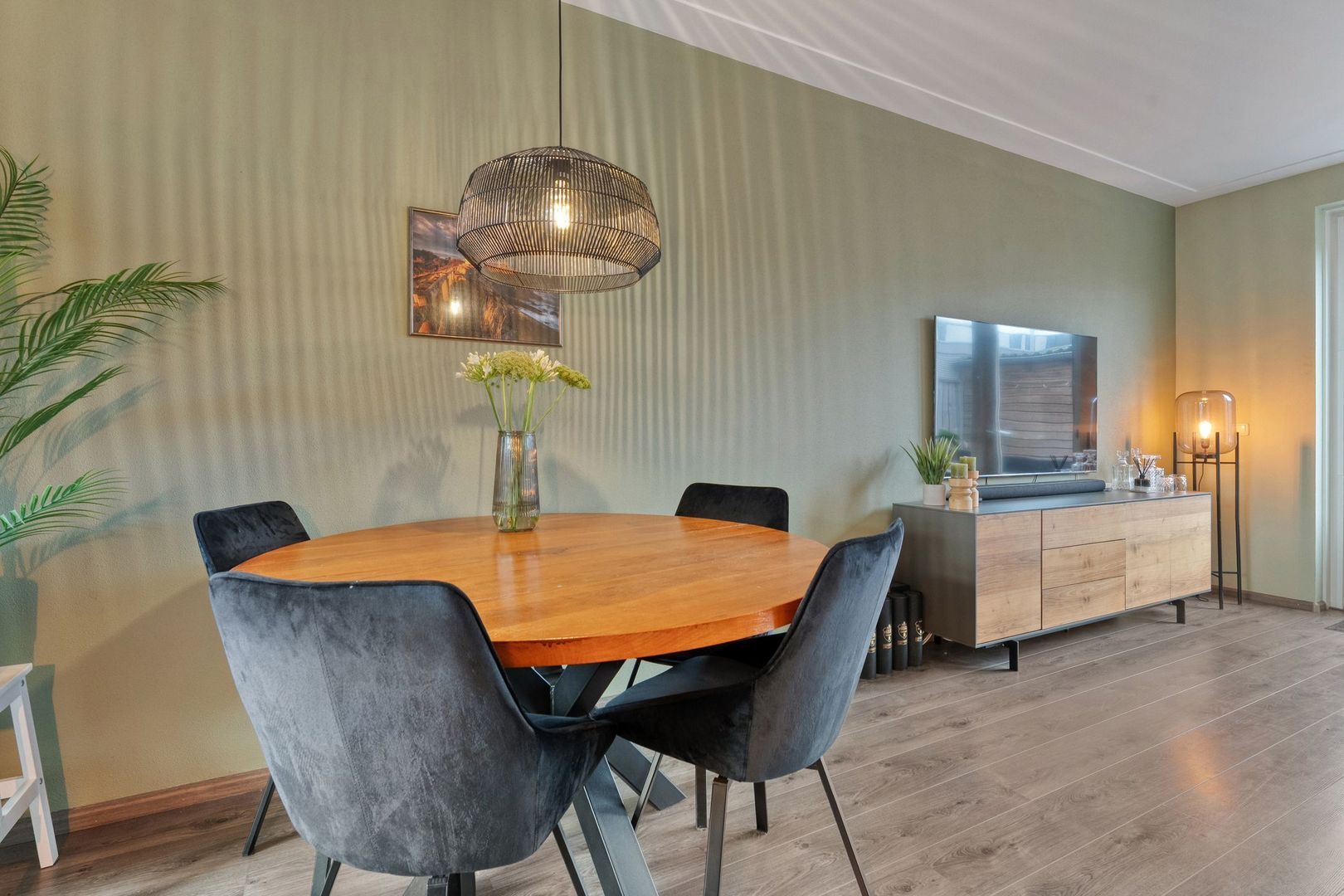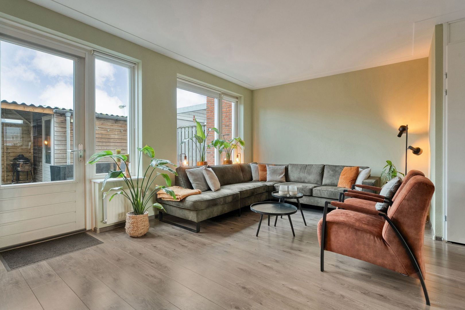 De woonkamer voelt direct warm en comfortabel aan. Dankzij de grote raampartijen komt er veel natuurlijk licht binnen, waardoor de ruimte het hele jaar door een open en frisse uitstraling heeft. De royale indeling biedt voldoende plek voor zowel een ruime zithoek als een gezellige eethoek. Praktisch is ook de diepe trapkast, ideaal voor het opbergen van voorraad, schoonmaakspullen of speelgoed.