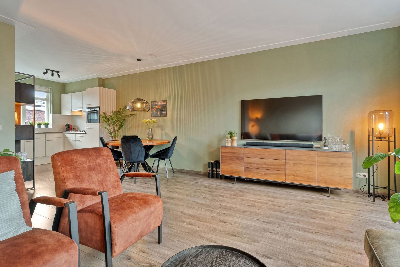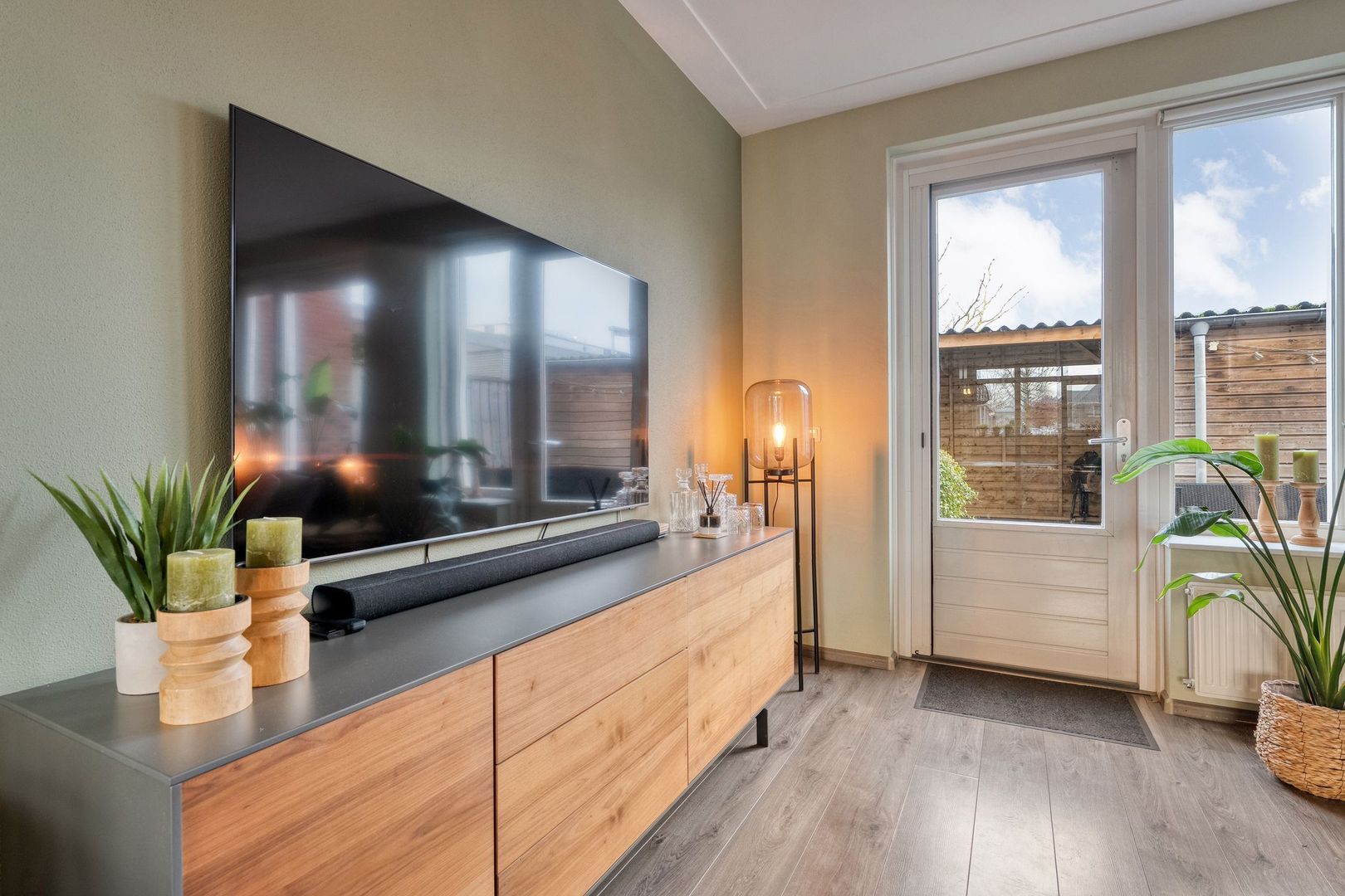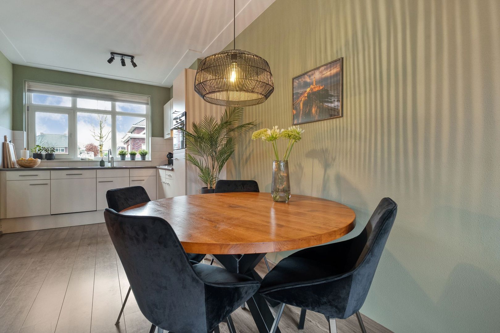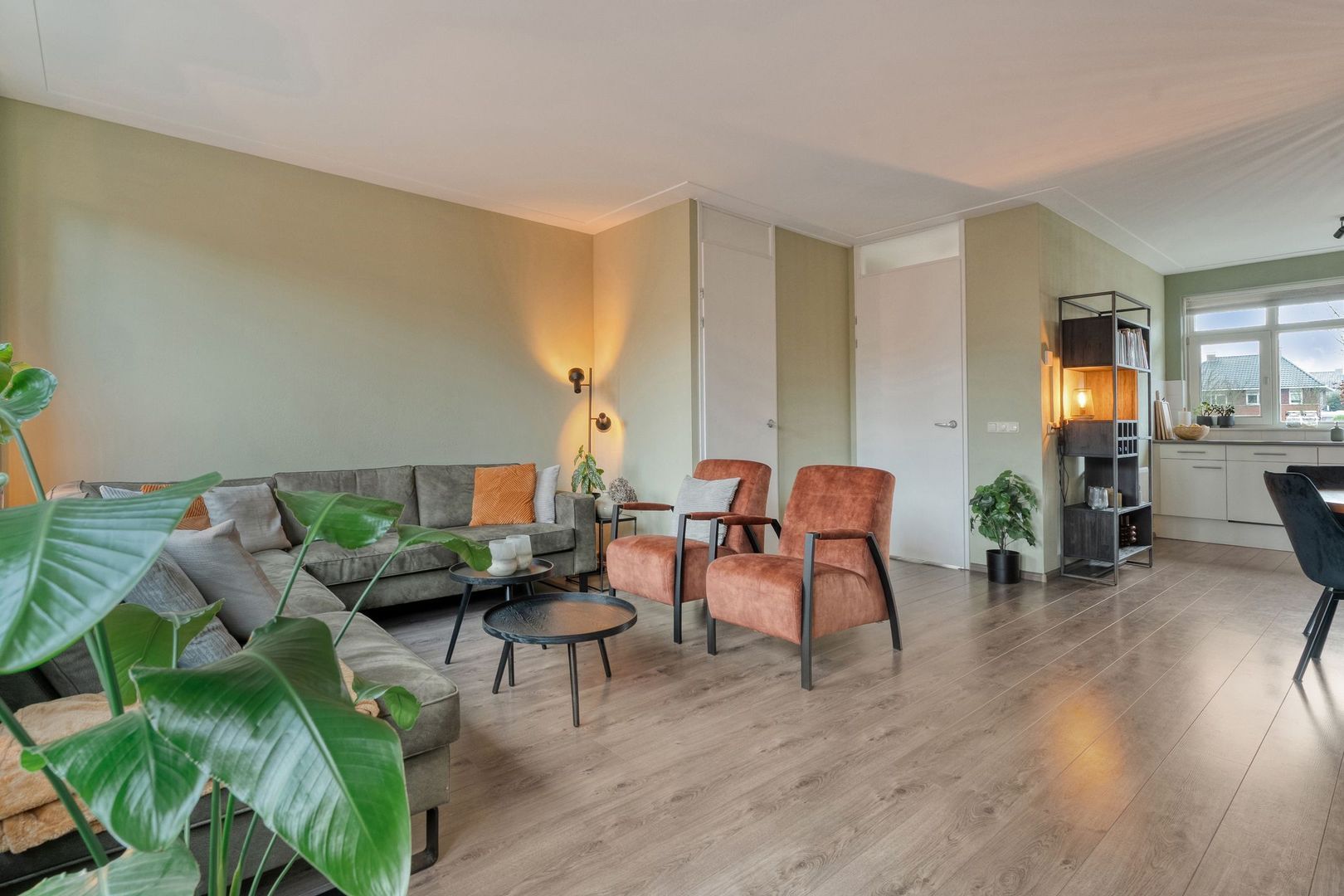 De woonkamer voelt direct warm en comfortabel aan. Dankzij de grote raampartijen komt er veel natuurlijk licht binnen, waardoor de ruimte het hele jaar door een open en frisse uitstraling heeft. De royale indeling biedt voldoende plek voor zowel een ruime zithoek als een gezellige eethoek. Praktisch is ook de diepe trapkast, ideaal voor het opbergen van voorraad, schoonmaakspullen of speelgoed.