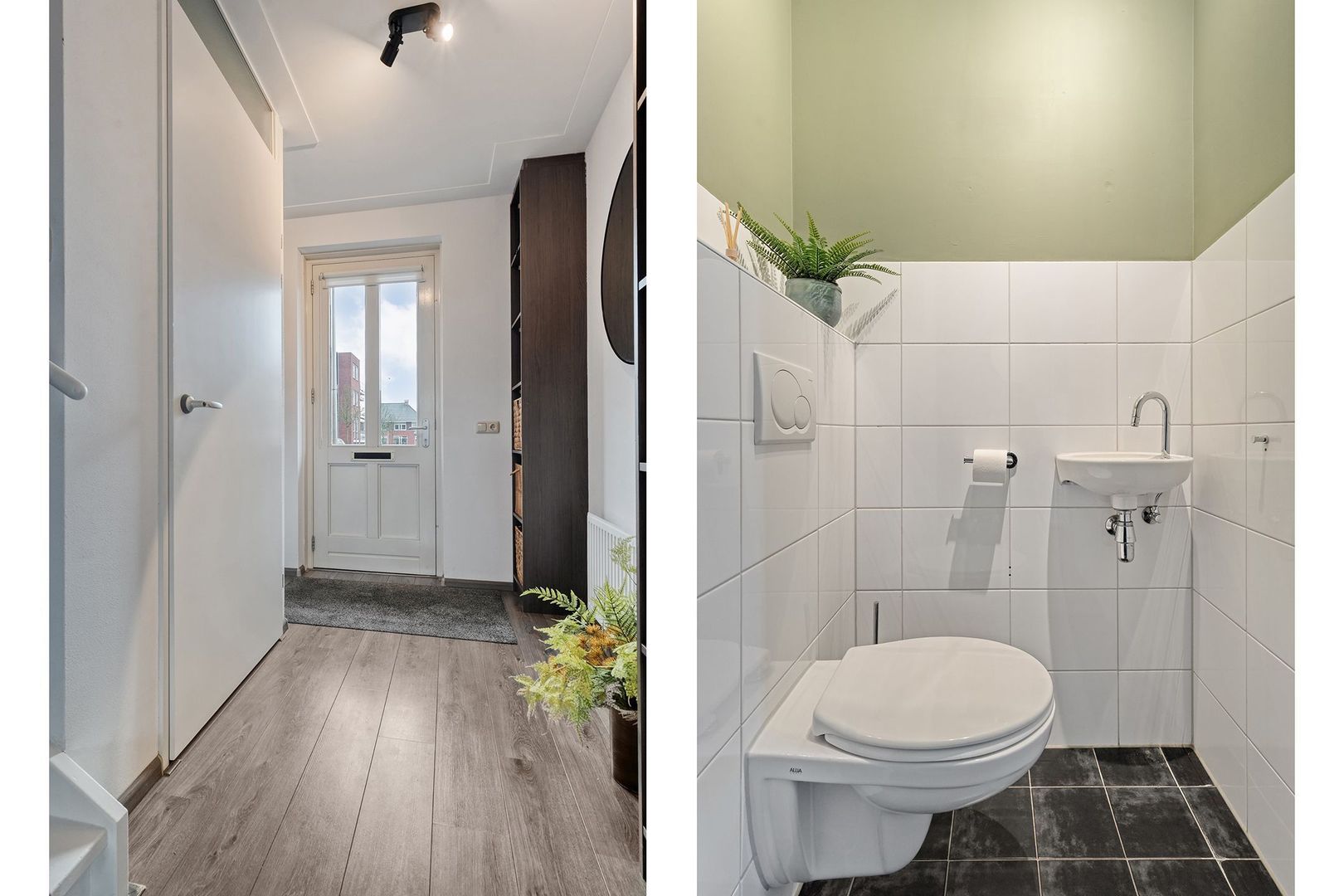 Via de onderhoudsvriendelijke voortuin bereik je de voordeur, die toegang geeft tot een ruime hal. Deze entree vormt het centrale startpunt van de woning. Hier vind je een praktische garderoberuimte voor jassen en schoenen, toegang tot de meterkast en de kruipruimte, en een nette toiletruimte met fontein en handige nis.